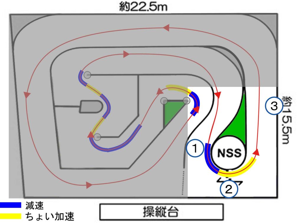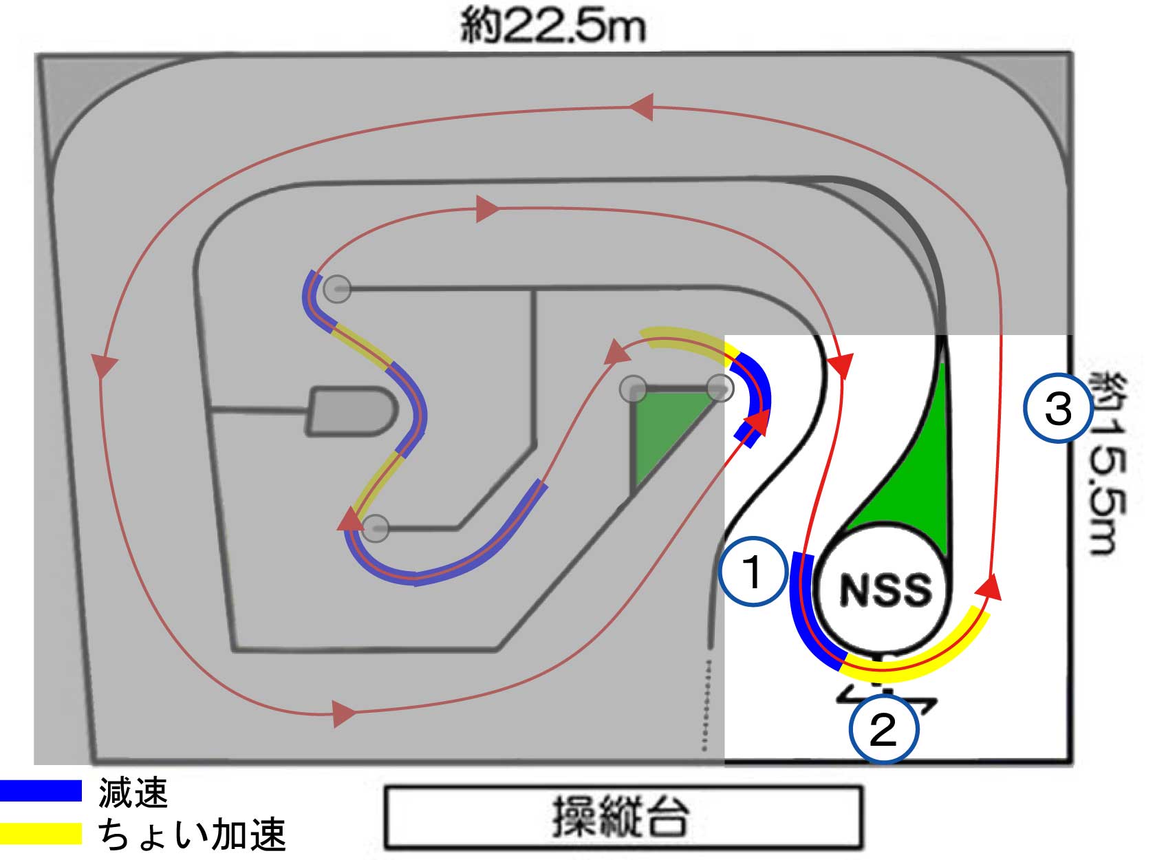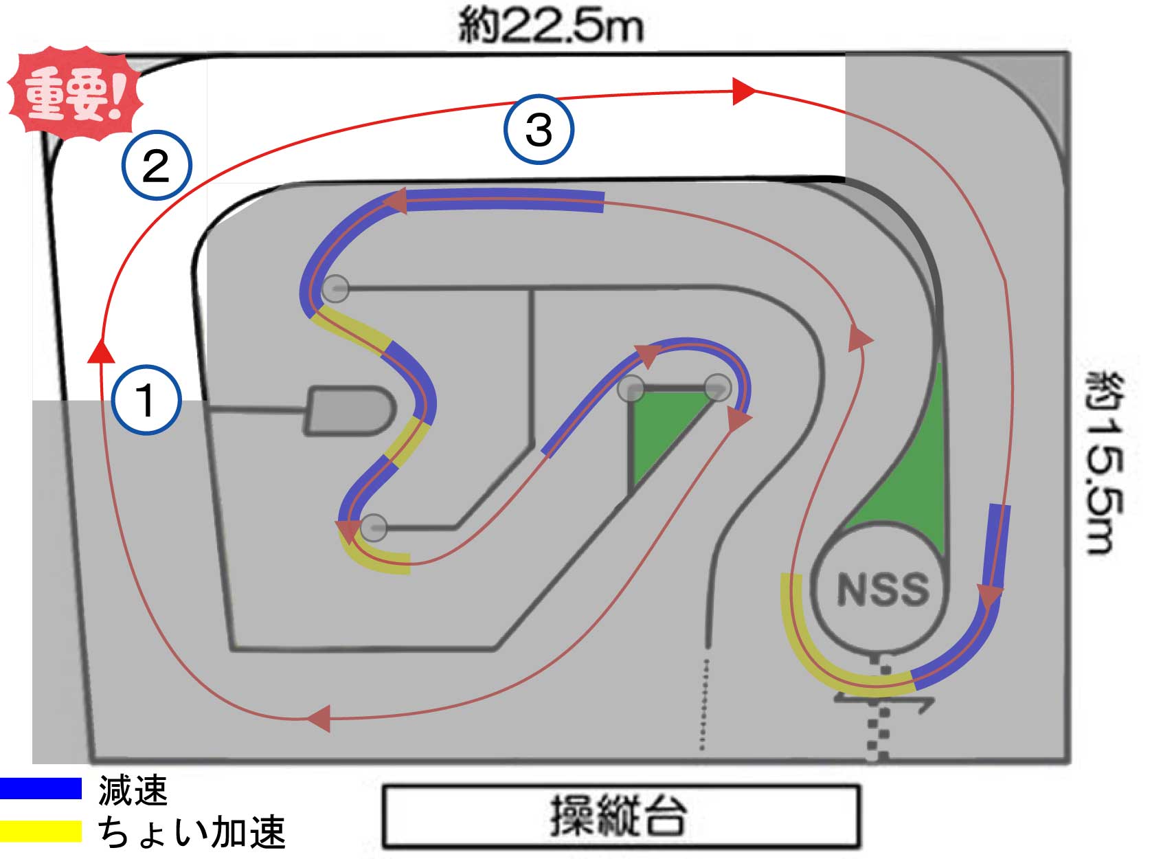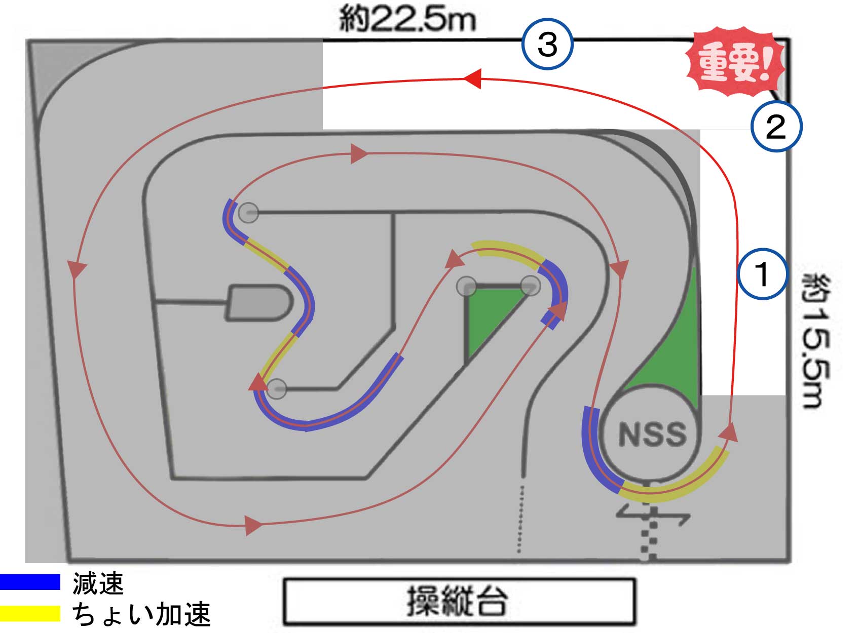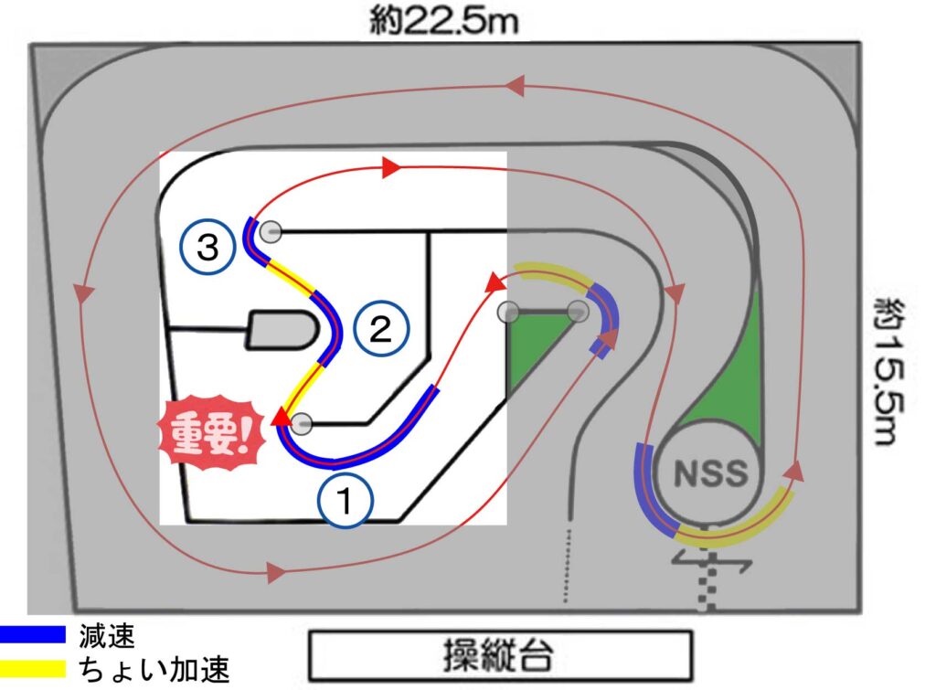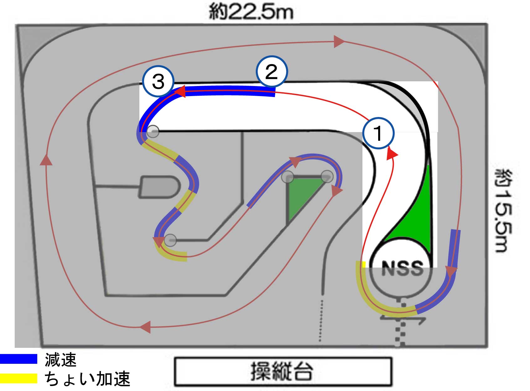①NSSコーナーの立ち上がりから右側に寄せる。