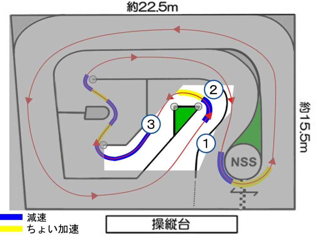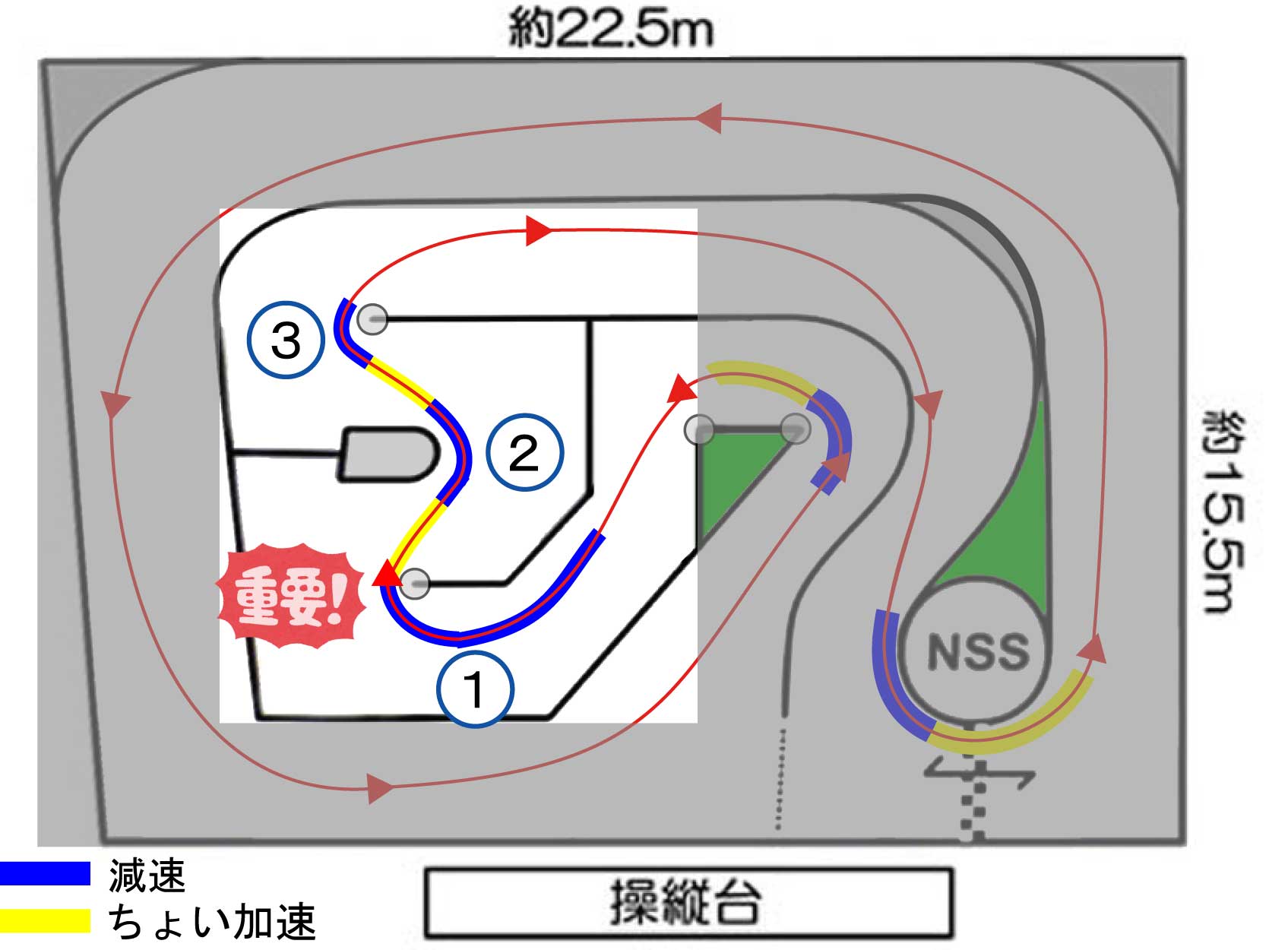 ②でツノの横をかすめるようにスピードに乗ることができれば、外周で0.2秒短縮できます。
