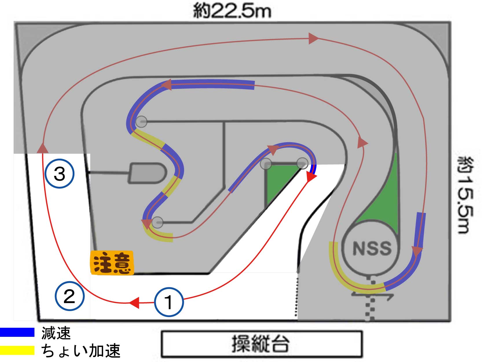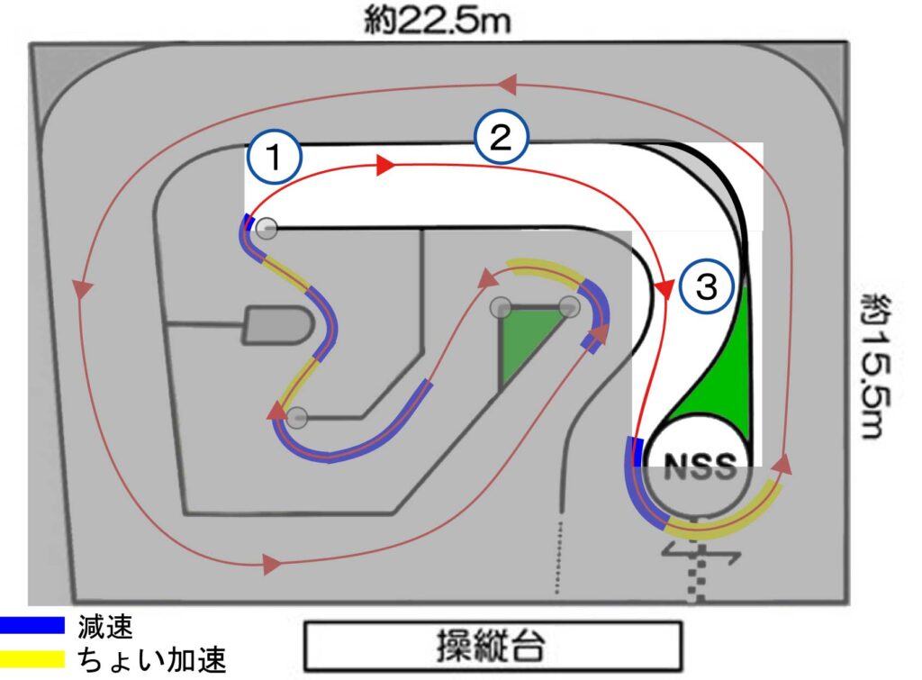 NSSコーナーの入り口は、早めにステアリングを入れても意外とインにぶつかりません。コーナーを抜けた後の立ち上がりはツノに備えて右に寄せましょう。