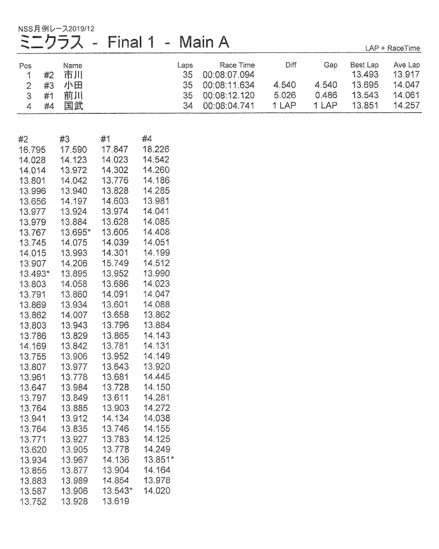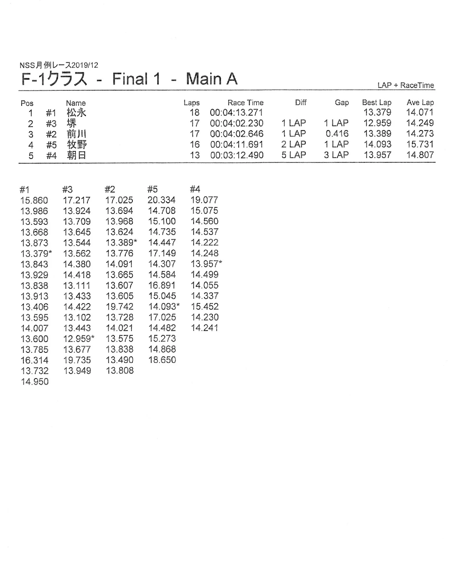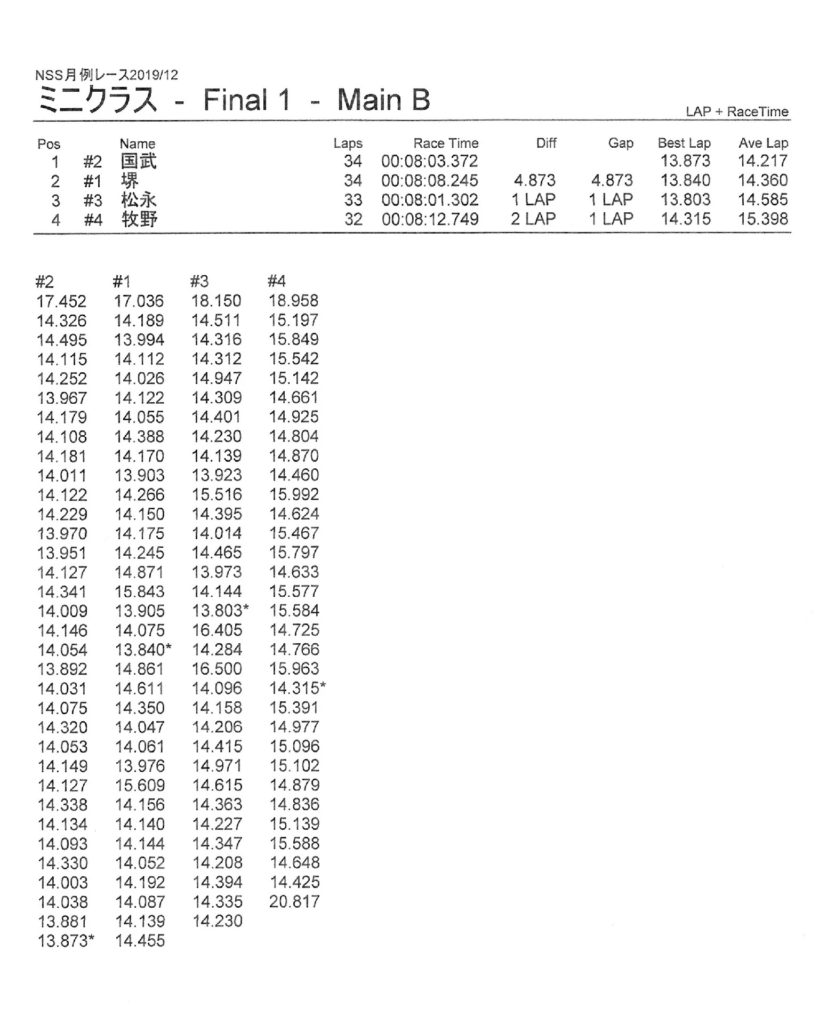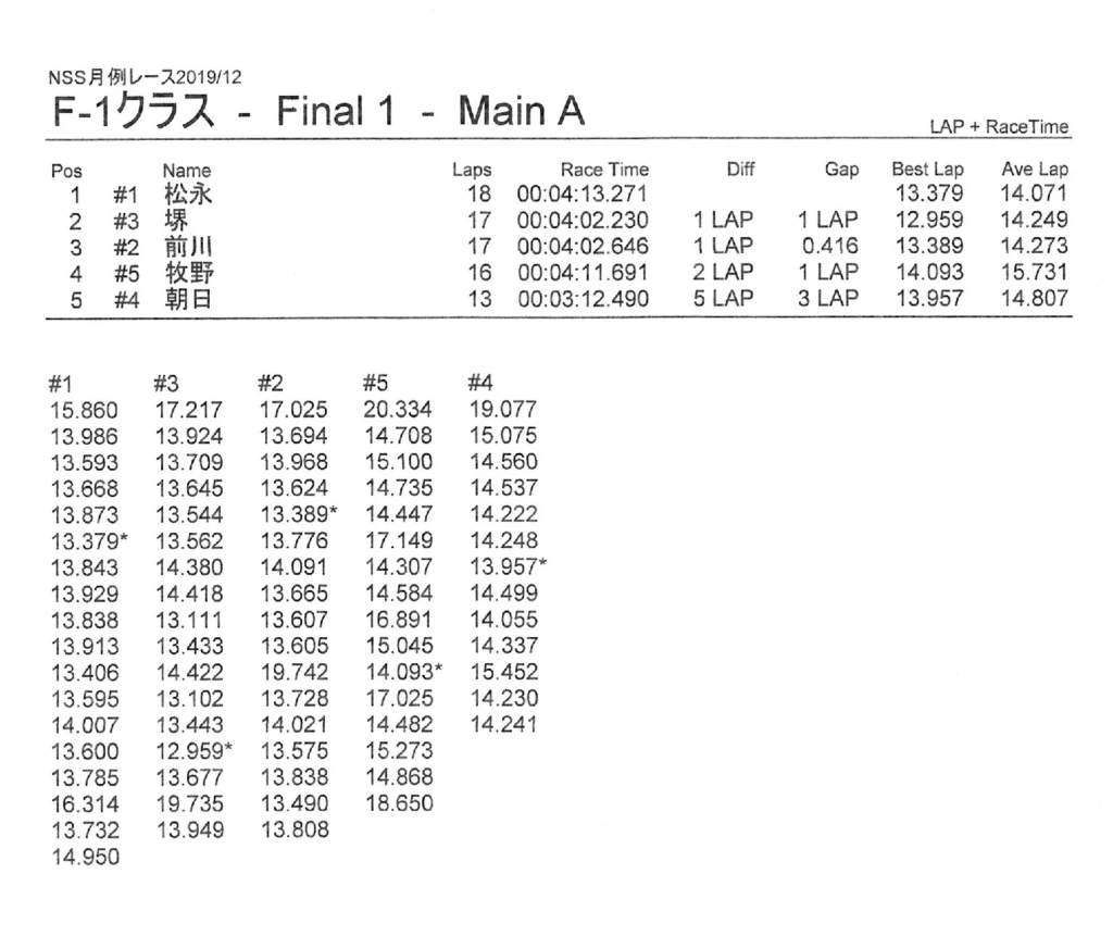 12月の月例レースの結果 公開日:2019年12月8日 レース結果 2019年12月8日に行われたNSスピードウェイ月例レースの結果を紹介します。 ミニクラスBメイン決勝 ミニクラスAメイン決勝 F 1クラスAメイン決勝 ツーリングクラスAメイン決勝 関連記事 6月・月例レース結果&動画8月・月例レース結果・動画ラリークロスレース結果&動画 2022/6/265月・月例レース結果・動画ラリークロスレースリザルトラリークロスレース結果&動画 2023/3/5 投稿ナビゲーション 11月の月例レースの結果ラリークロスレースリザルト