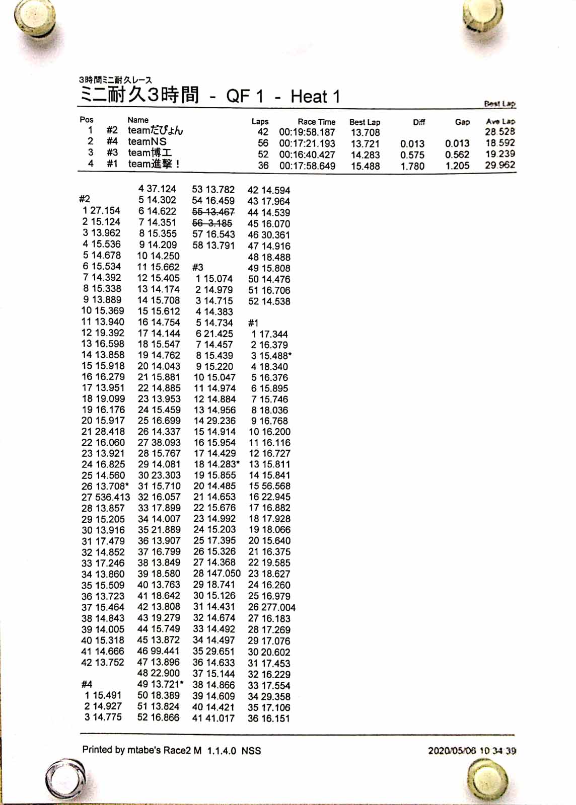 2020年5月ミニ3時間耐久レース結果 更新日:2022年5月7日 公開日:2020年5月6日 レース結果 優勝 teamだぴょん 727周 2位 teamNS 719周 3位 team博工 687周 4位 team進撃! 532周 3時間耐久レース:ダイジェスト動画など おまけ:予選結果 関連記事 月例レース結果・動画 2025/01/1311月・月例レース結果&動画7月・月例レース結果・動画12月の月例レースの結果2021年5月ミニ3時間耐久レース結果ラリークロスレースリザルト 投稿ナビゲーション 4月の月例レース結果・動画 2020/4/265月の月例レース結果・動画 2020/5/10