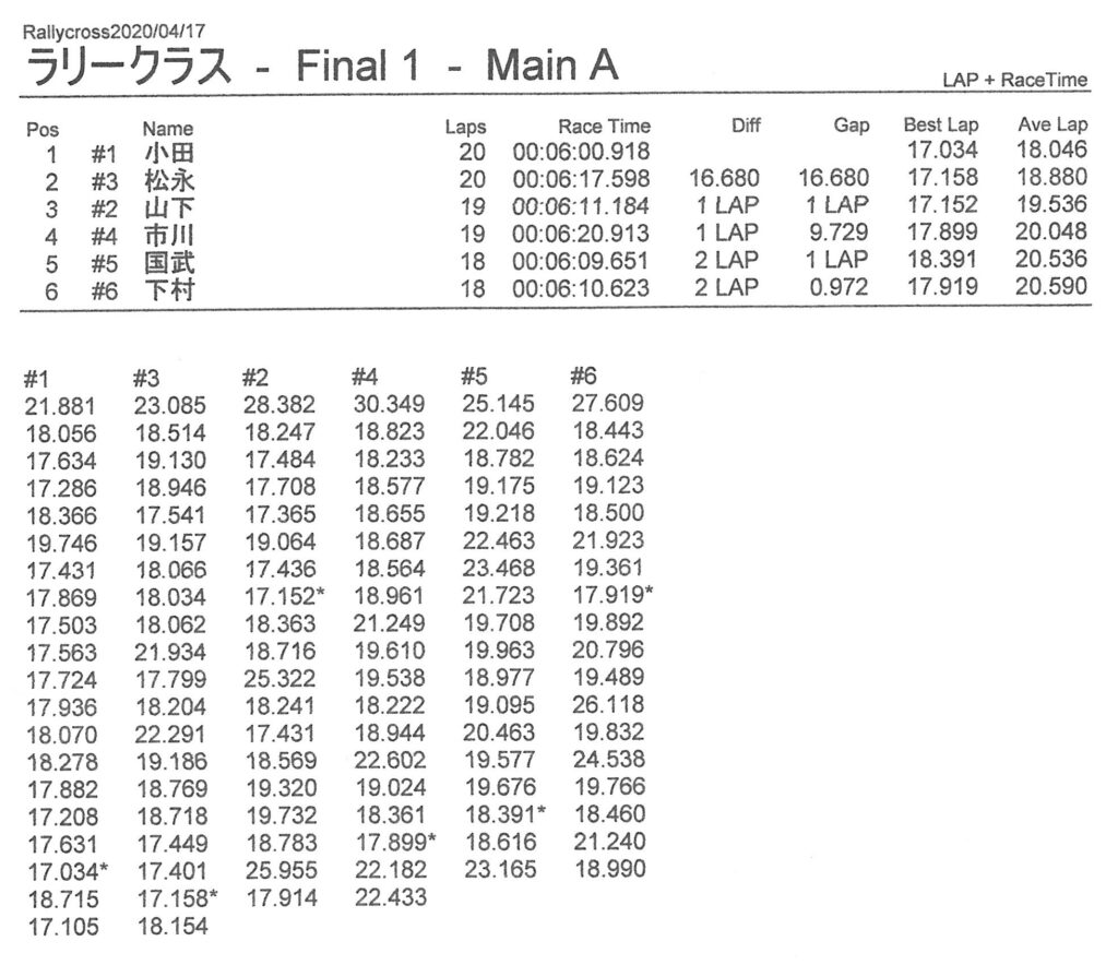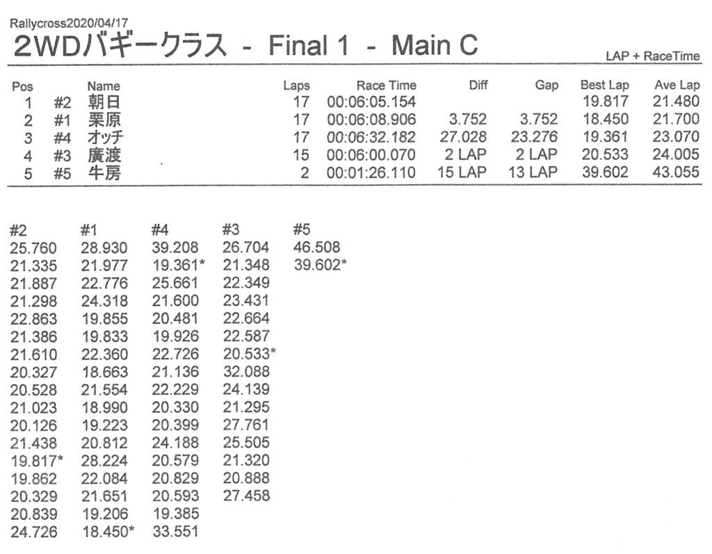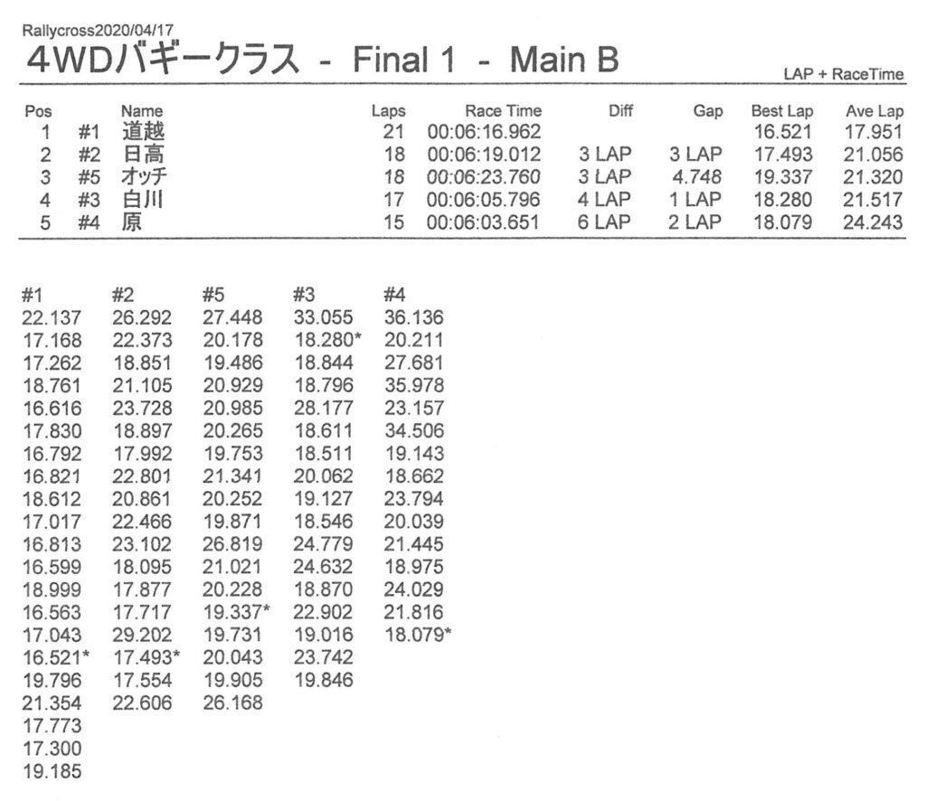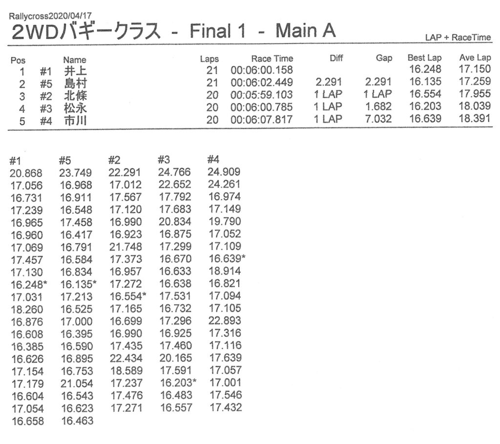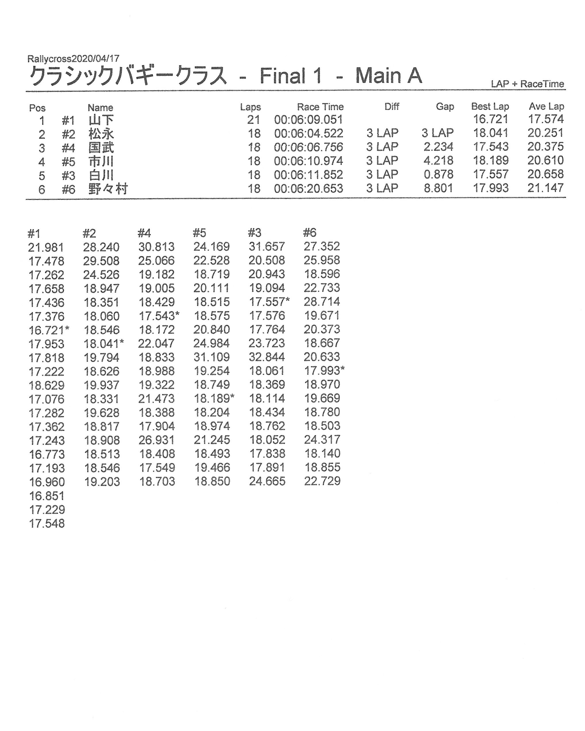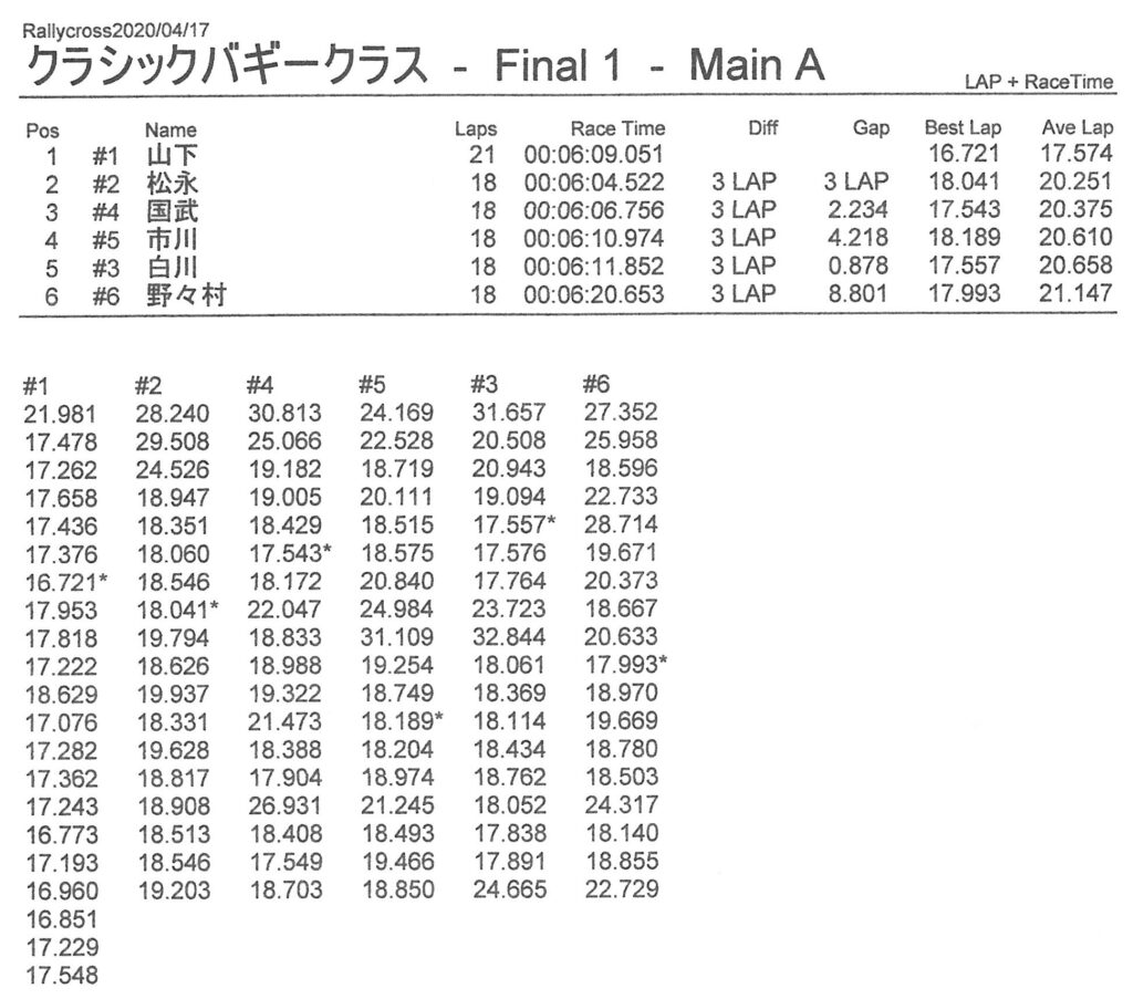 ラリークロスレース結果&動画 2021/4 更新日:2021年4月19日 公開日:2021年4月18日 レース結果 ラリークラス ラリークラスBメイン ラリークラスAメイン 2WDバギークラス 2WDバギークラスCメイン 2WDバギークラスBメイン 2WDバギークラスAメイン 4WDバギークラス 4WDバギークラスBメイン 4WDバギークラスAメイン クラシックバギークラス クラシックバギークラスBメイン ※クラシックバギークラスですが、Bメインでは特別参加でDT-03が2台一緒に走っています クラシックバギークラスAメイン 撮影機材不調により動画はありません。 おまけ(予選リザルト) ラリークラス 2WDバギークラス 4WDクラス クラシックバギークラス 関連記事 ラリークロスレース結果&動画 2022/2/27月例レース結果・動画 2024/09/08ラリークロスレース結果&動画 2021/65月・月例レース結果&動画ラリークロスレース結果&動画2021/2月例レース結果 ・動画 2024/06/02 投稿ナビゲーション 4月・月例レース結果&動画2021年5月ミニ3時間耐久レース結果