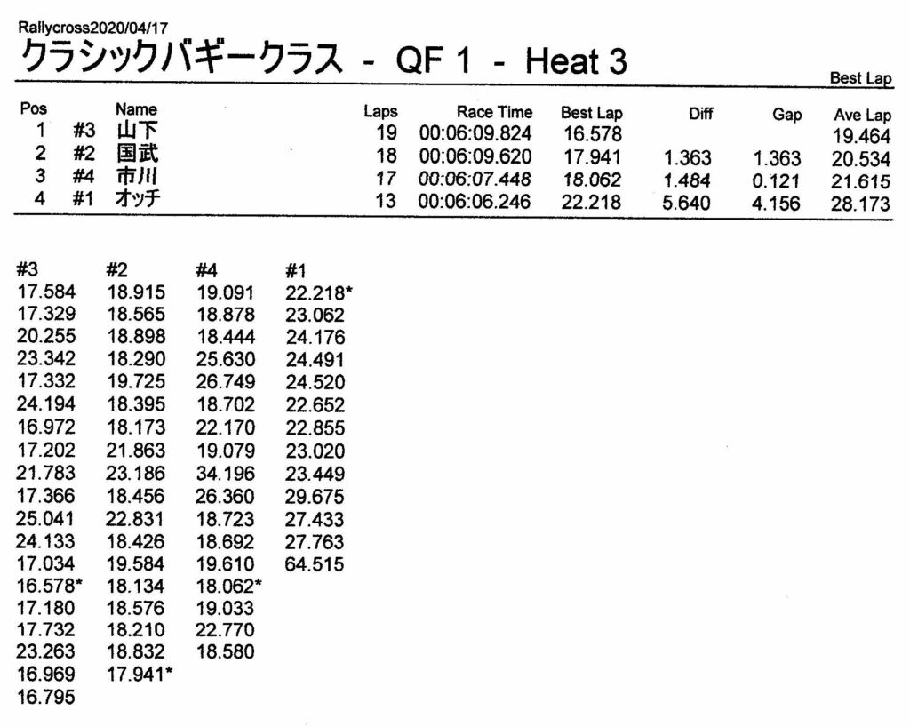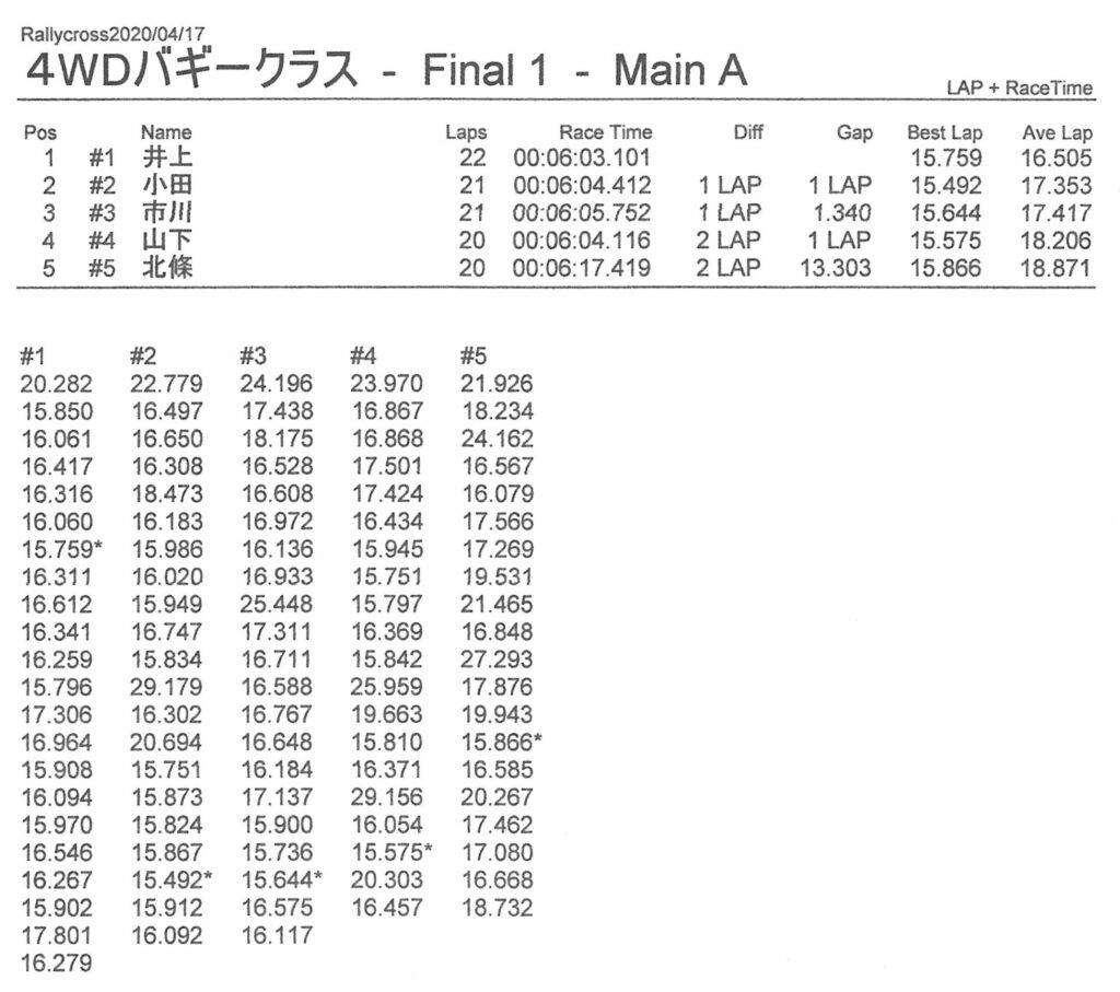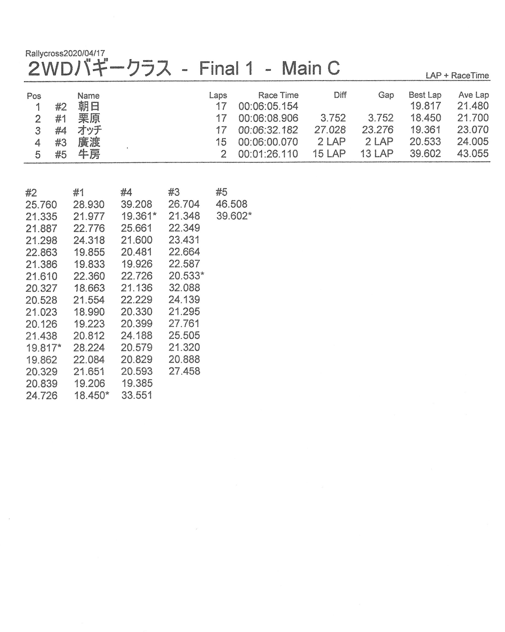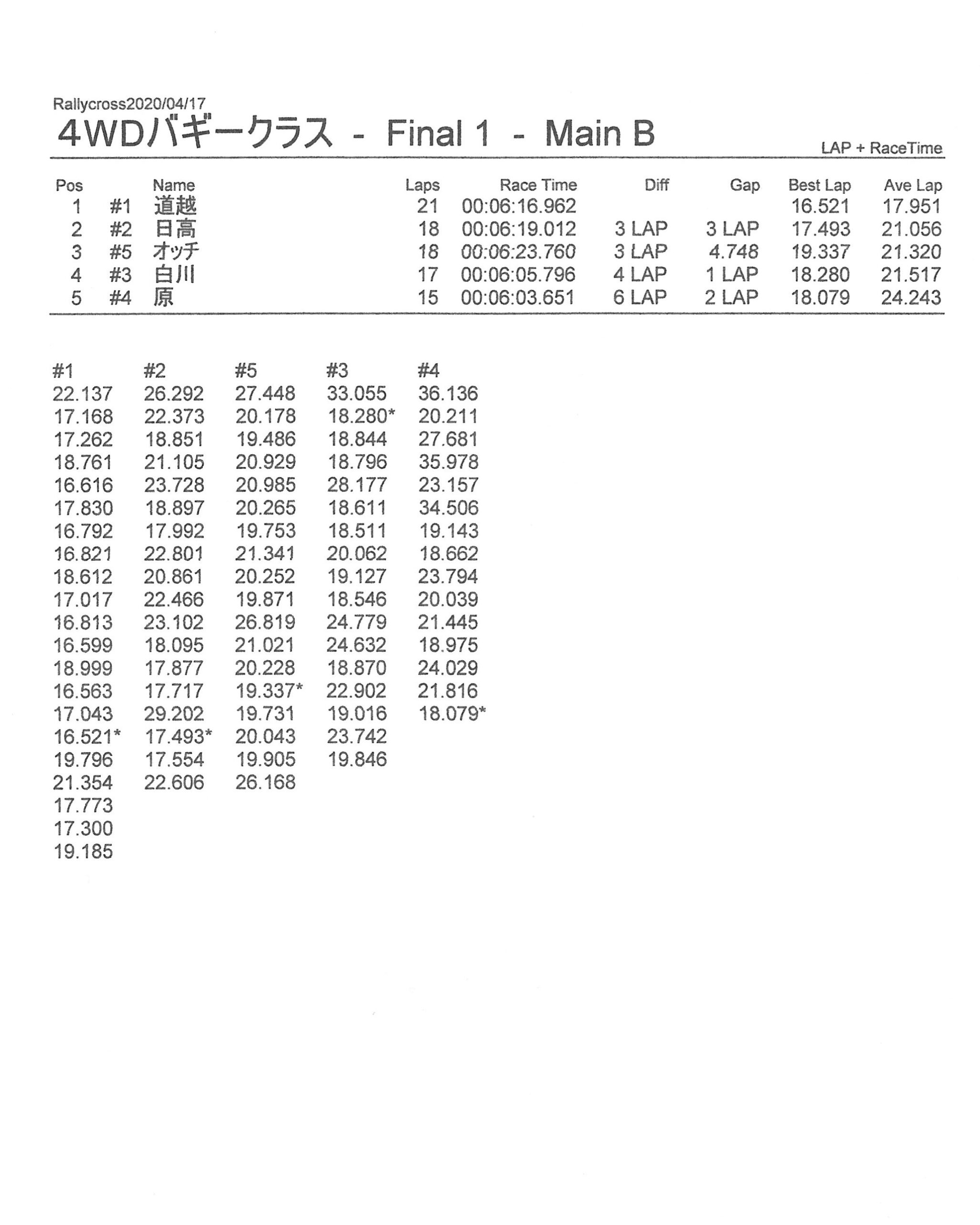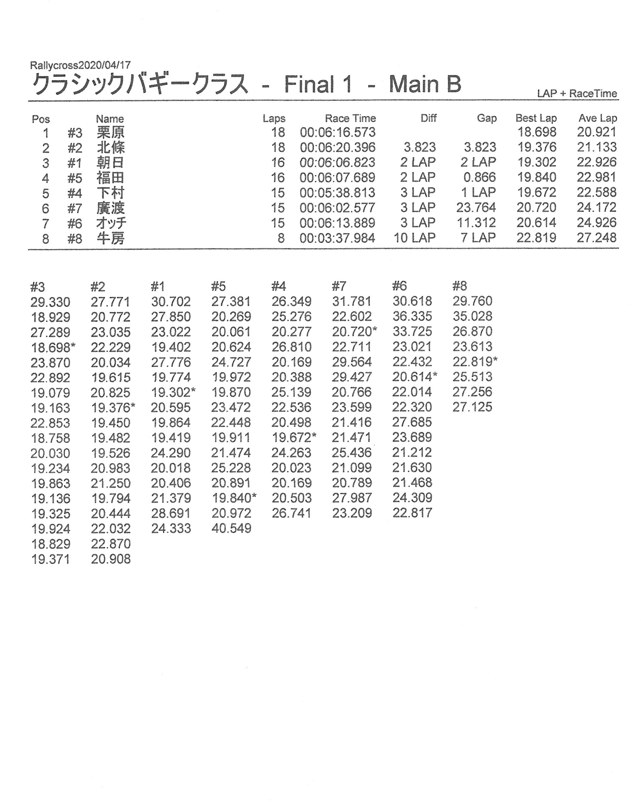 ラリークロスレース結果&動画 2021/4 更新日:2021年4月19日 公開日:2021年4月18日 レース結果 ラリークラス ラリークラスBメイン ラリークラスAメイン 2WDバギークラス 2WDバギークラスCメイン 2WDバギークラスBメイン 2WDバギークラスAメイン 4WDバギークラス 4WDバギークラスBメイン 4WDバギークラスAメイン クラシックバギークラス クラシックバギークラスBメイン ※クラシックバギークラスですが、Bメインでは特別参加でDT-03が2台一緒に走っています クラシックバギークラスAメイン 撮影機材不調により動画はありません。 おまけ(予選リザルト) ラリークラス 2WDバギークラス 4WDクラス クラシックバギークラス 関連記事 ラリークロスレース結果&動画 2022/2/27月例レース結果・動画 2024/09/08ラリークロスレース結果&動画 2021/65月・月例レース結果&動画ラリークロスレース結果&動画2021/2月例レース結果 ・動画 2024/06/02 投稿ナビゲーション 4月・月例レース結果&動画2021年5月ミニ3時間耐久レース結果