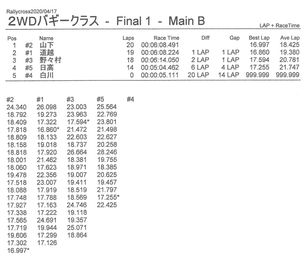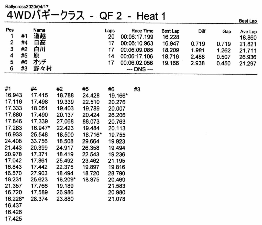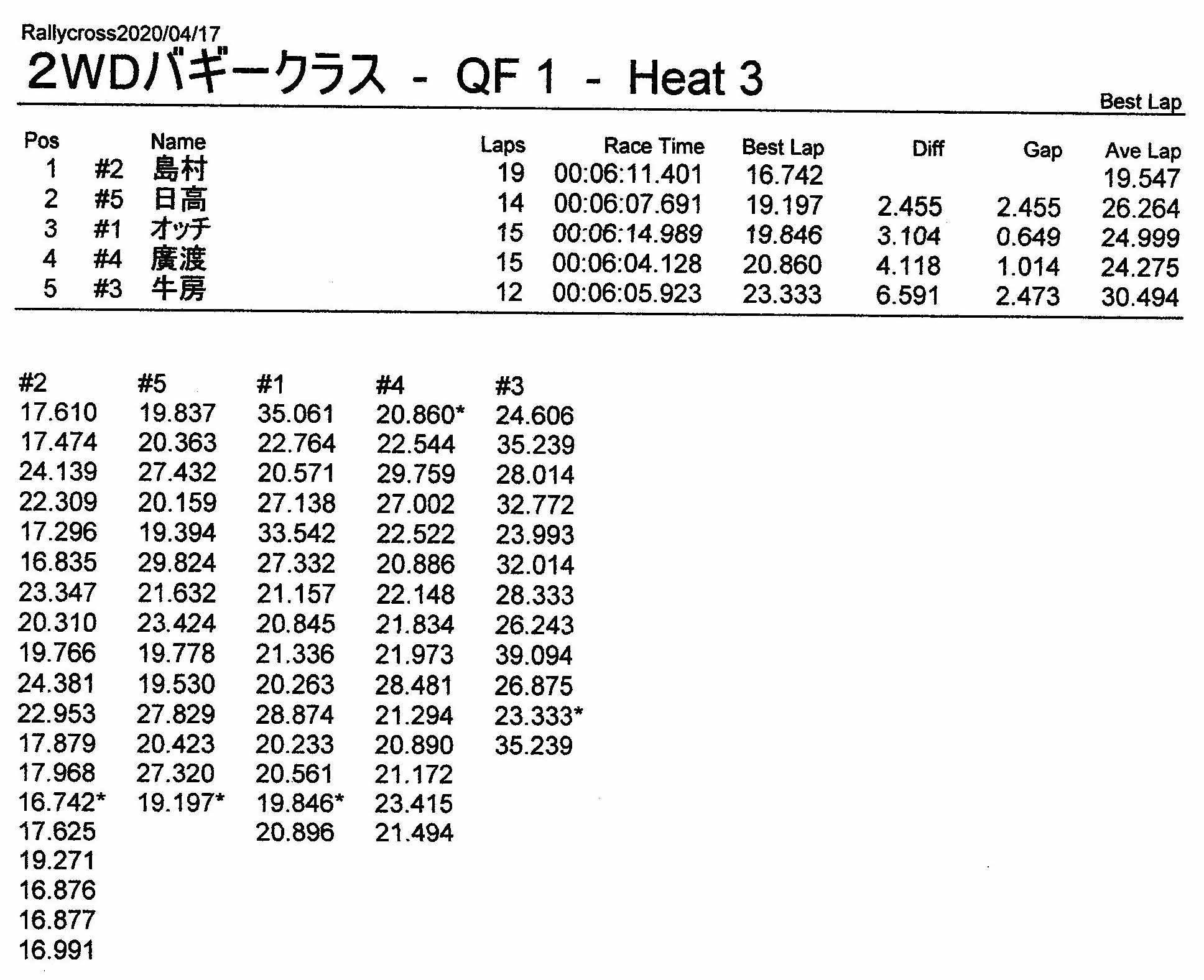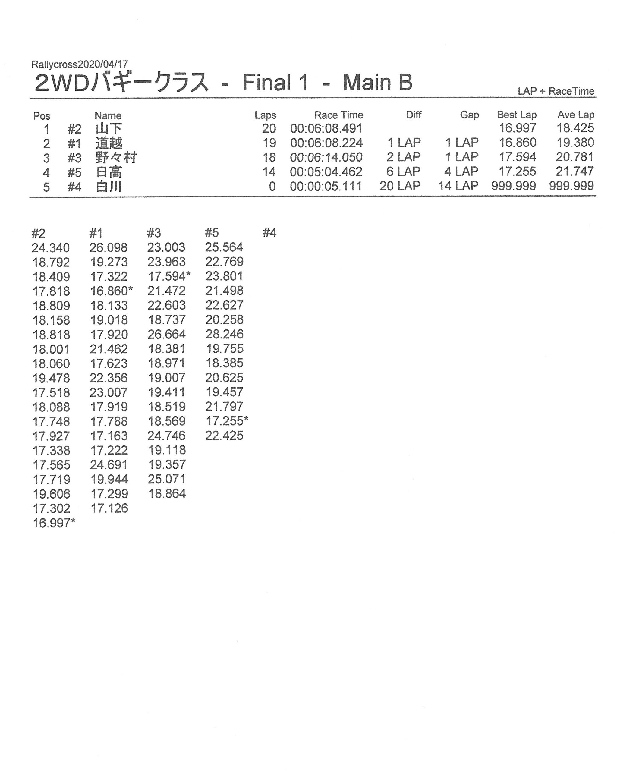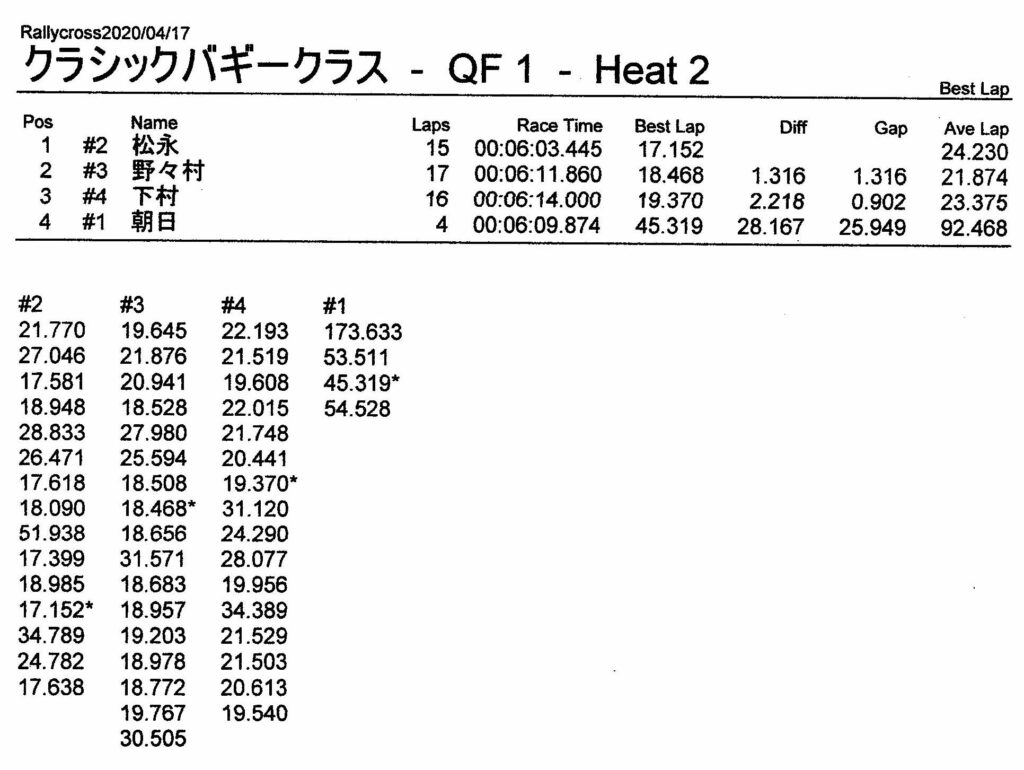 ラリークロスレース結果&動画 2021/4 更新日:2021年4月19日 公開日:2021年4月18日 レース結果 ラリークラス ラリークラスBメイン ラリークラスAメイン 2WDバギークラス 2WDバギークラスCメイン 2WDバギークラスBメイン 2WDバギークラスAメイン 4WDバギークラス 4WDバギークラスBメイン 4WDバギークラスAメイン クラシックバギークラス クラシックバギークラスBメイン ※クラシックバギークラスですが、Bメインでは特別参加でDT-03が2台一緒に走っています クラシックバギークラスAメイン 撮影機材不調により動画はありません。 おまけ(予選リザルト) ラリークラス 2WDバギークラス 4WDクラス クラシックバギークラス 関連記事 ラリークロスレース結果&動画 2022/2/27月例レース結果・動画 2024/09/08ラリークロスレース結果&動画 2021/65月・月例レース結果&動画ラリークロスレース結果&動画2021/2月例レース結果 ・動画 2024/06/02 投稿ナビゲーション 4月・月例レース結果&動画2021年5月ミニ3時間耐久レース結果