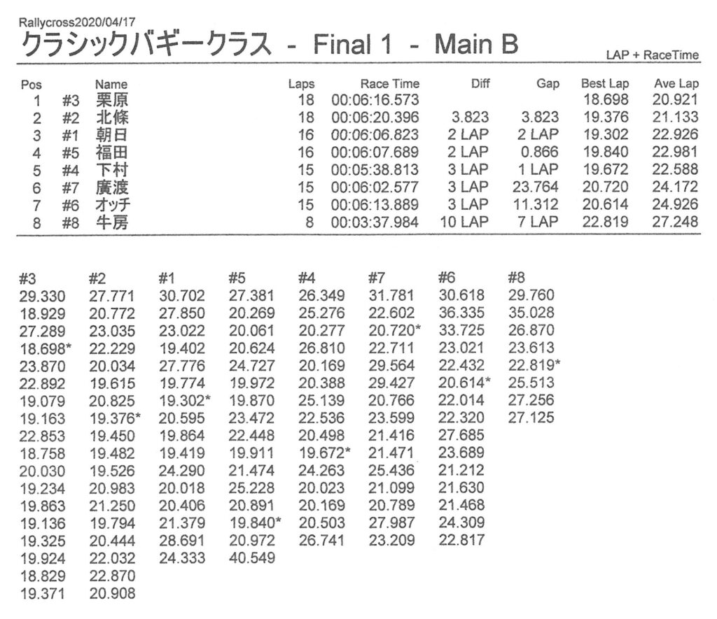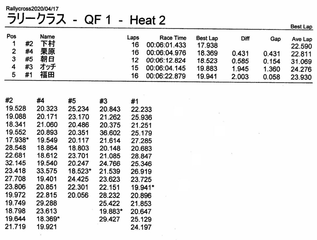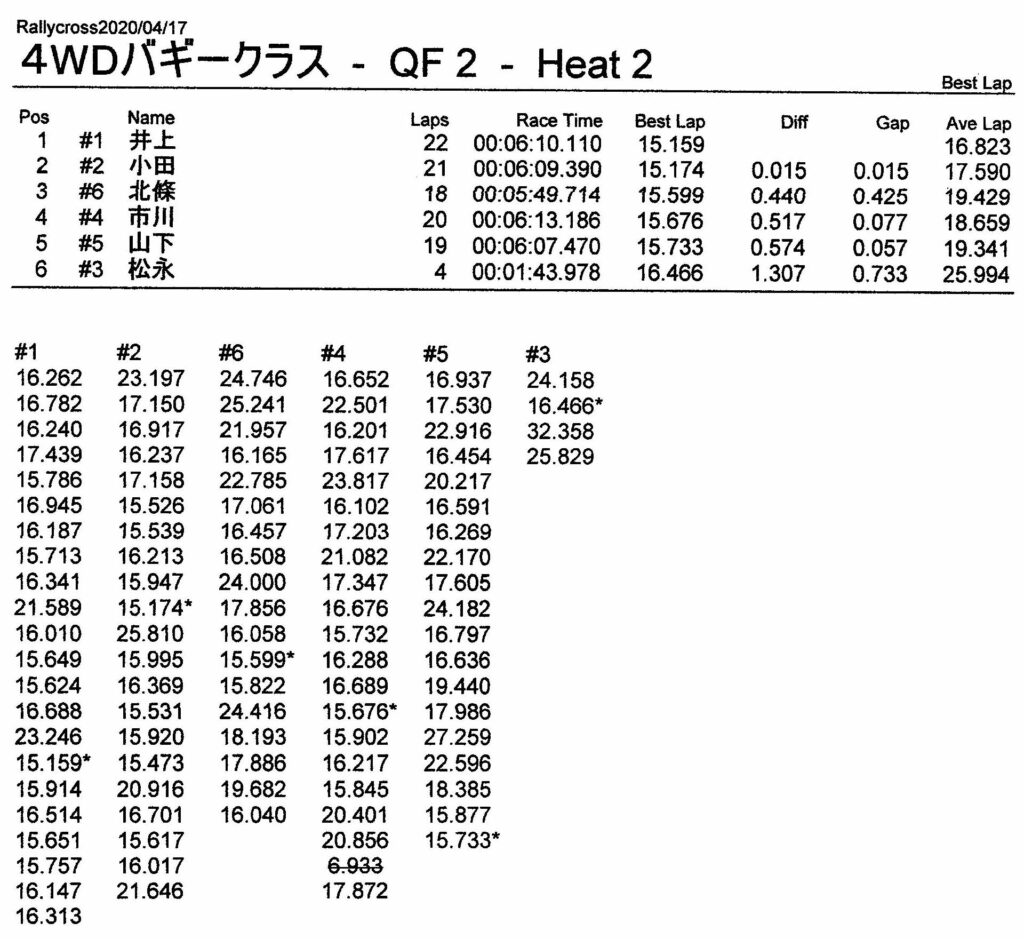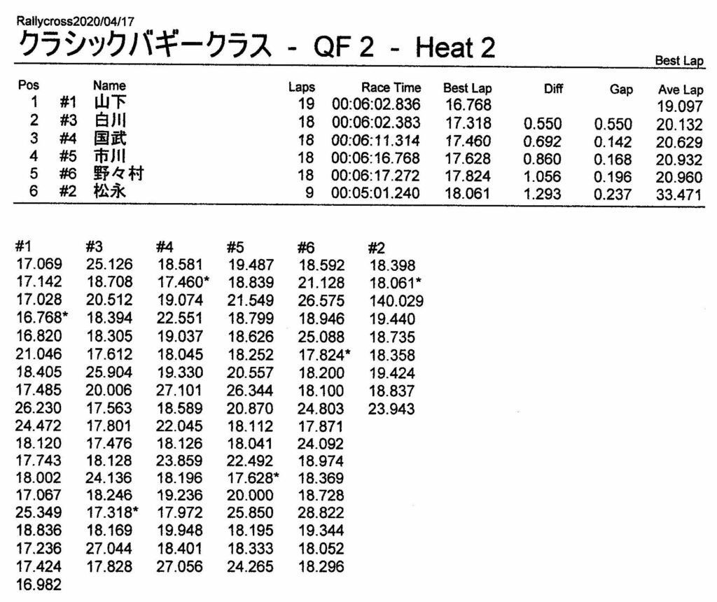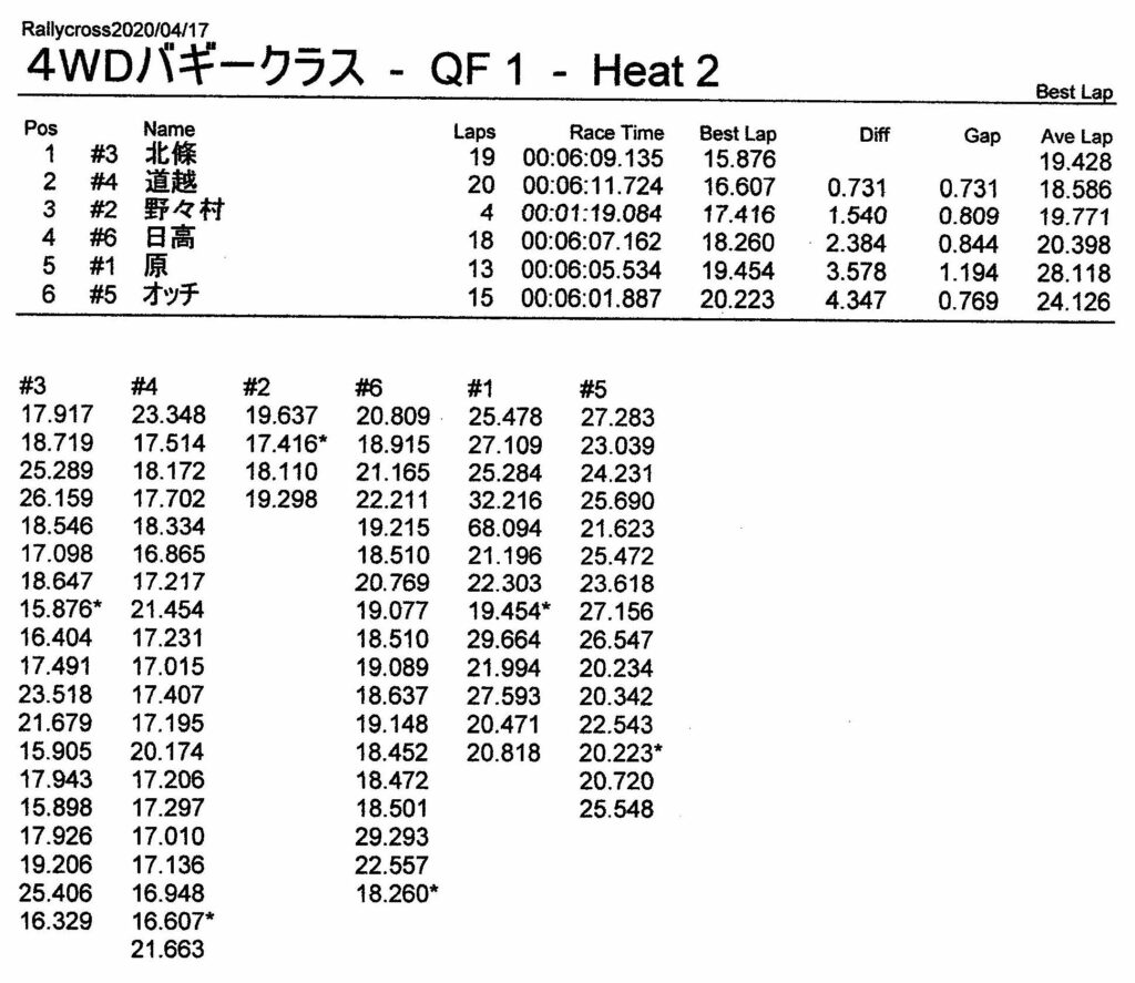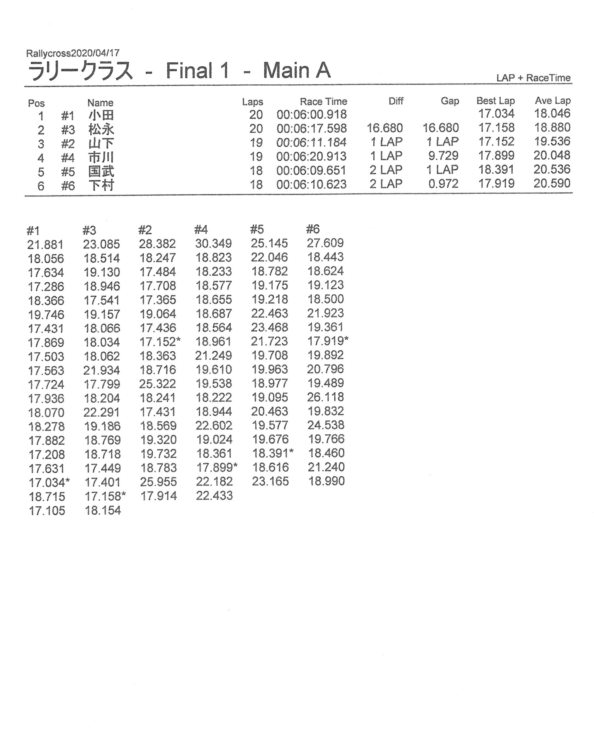 ラリークロスレース結果&動画 2021/4 更新日:2021年4月19日 公開日:2021年4月18日 レース結果 ラリークラス ラリークラスBメイン ラリークラスAメイン 2WDバギークラス 2WDバギークラスCメイン 2WDバギークラスBメイン 2WDバギークラスAメイン 4WDバギークラス 4WDバギークラスBメイン 4WDバギークラスAメイン クラシックバギークラス クラシックバギークラスBメイン ※クラシックバギークラスですが、Bメインでは特別参加でDT-03が2台一緒に走っています クラシックバギークラスAメイン 撮影機材不調により動画はありません。 おまけ(予選リザルト) ラリークラス 2WDバギークラス 4WDクラス クラシックバギークラス 関連記事 ラリークロスレース結果&動画 2022/2/27月例レース結果・動画 2024/09/08ラリークロスレース結果&動画 2021/65月・月例レース結果&動画ラリークロスレース結果&動画2021/2月例レース結果 ・動画 2024/06/02 投稿ナビゲーション 4月・月例レース結果&動画2021年5月ミニ3時間耐久レース結果