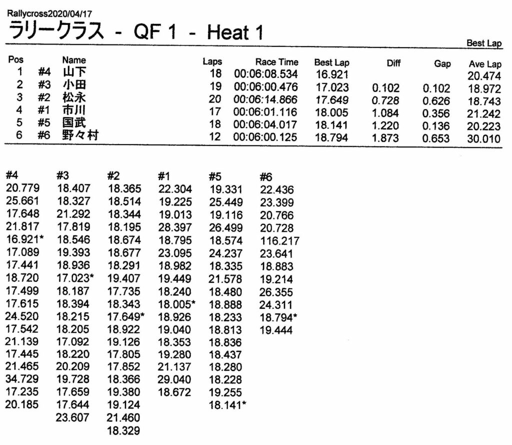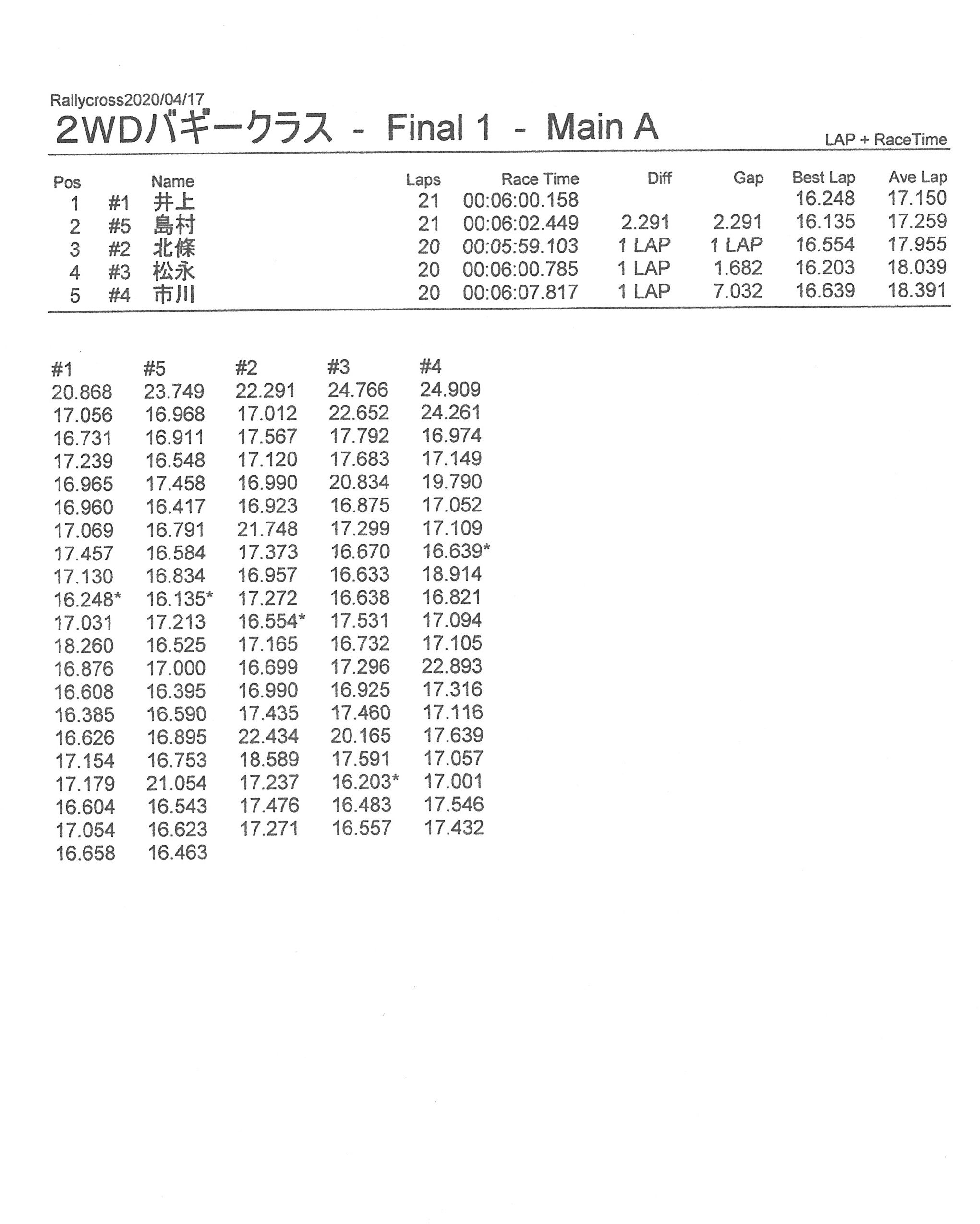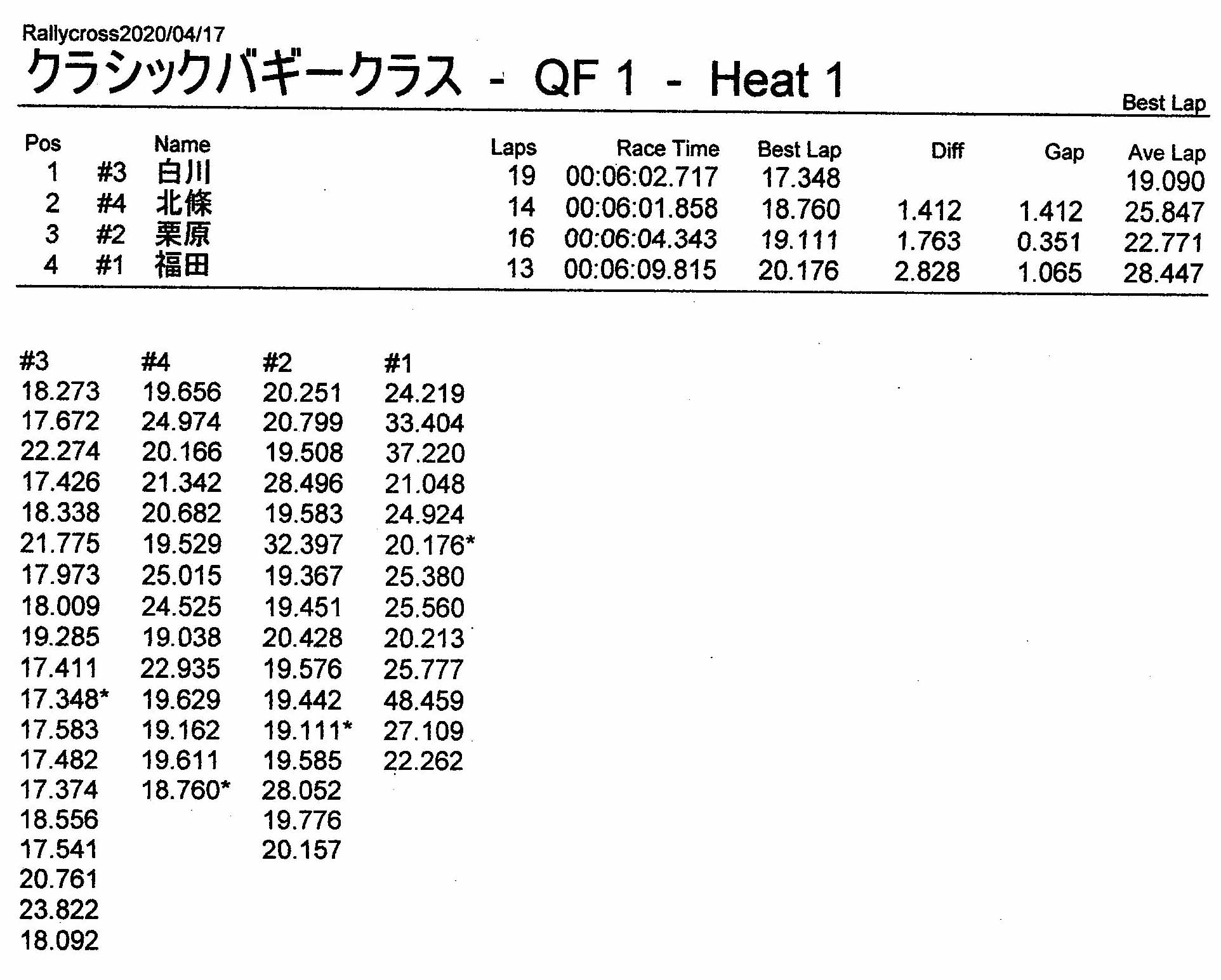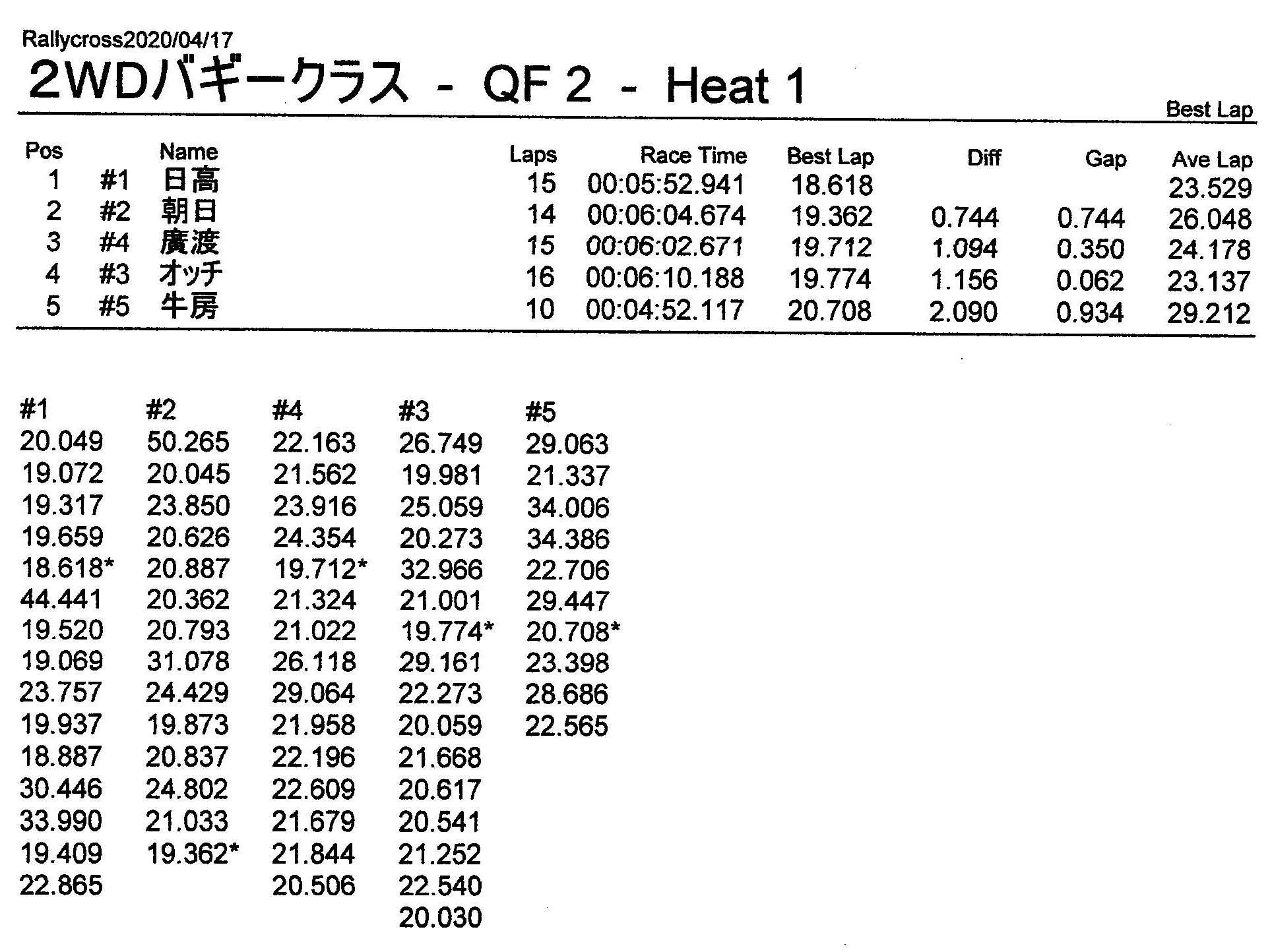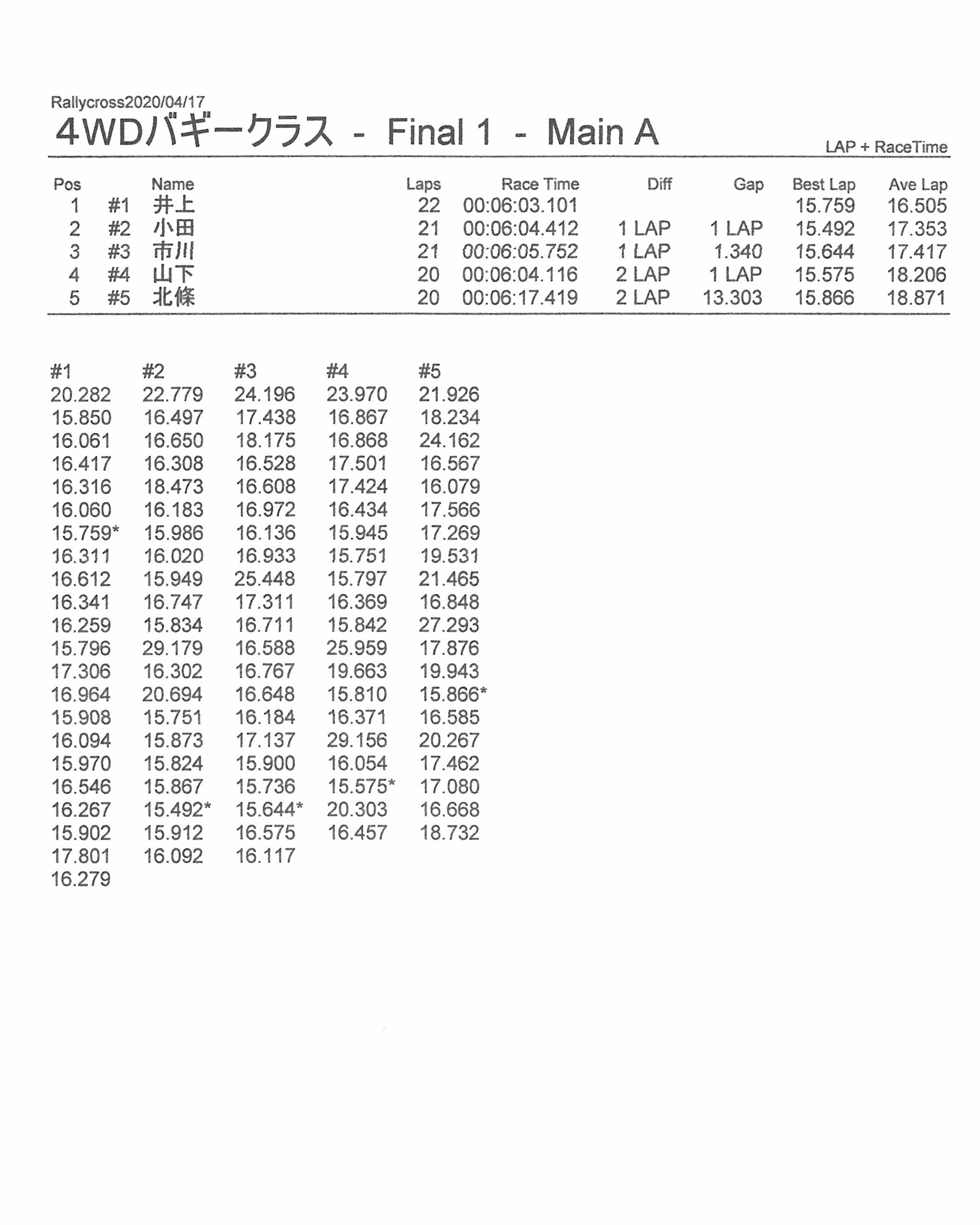 ラリークロスレース結果&動画 2021/4 更新日:2021年4月19日 公開日:2021年4月18日 レース結果 ラリークラス ラリークラスBメイン ラリークラスAメイン 2WDバギークラス 2WDバギークラスCメイン 2WDバギークラスBメイン 2WDバギークラスAメイン 4WDバギークラス 4WDバギークラスBメイン 4WDバギークラスAメイン クラシックバギークラス クラシックバギークラスBメイン ※クラシックバギークラスですが、Bメインでは特別参加でDT-03が2台一緒に走っています クラシックバギークラスAメイン 撮影機材不調により動画はありません。 おまけ(予選リザルト) ラリークラス 2WDバギークラス 4WDクラス クラシックバギークラス 関連記事 ラリークロスレース結果&動画 2022/2/27月例レース結果・動画 2024/09/08ラリークロスレース結果&動画 2021/65月・月例レース結果&動画ラリークロスレース結果&動画2021/2月例レース結果 ・動画 2024/06/02 投稿ナビゲーション 4月・月例レース結果&動画2021年5月ミニ3時間耐久レース結果