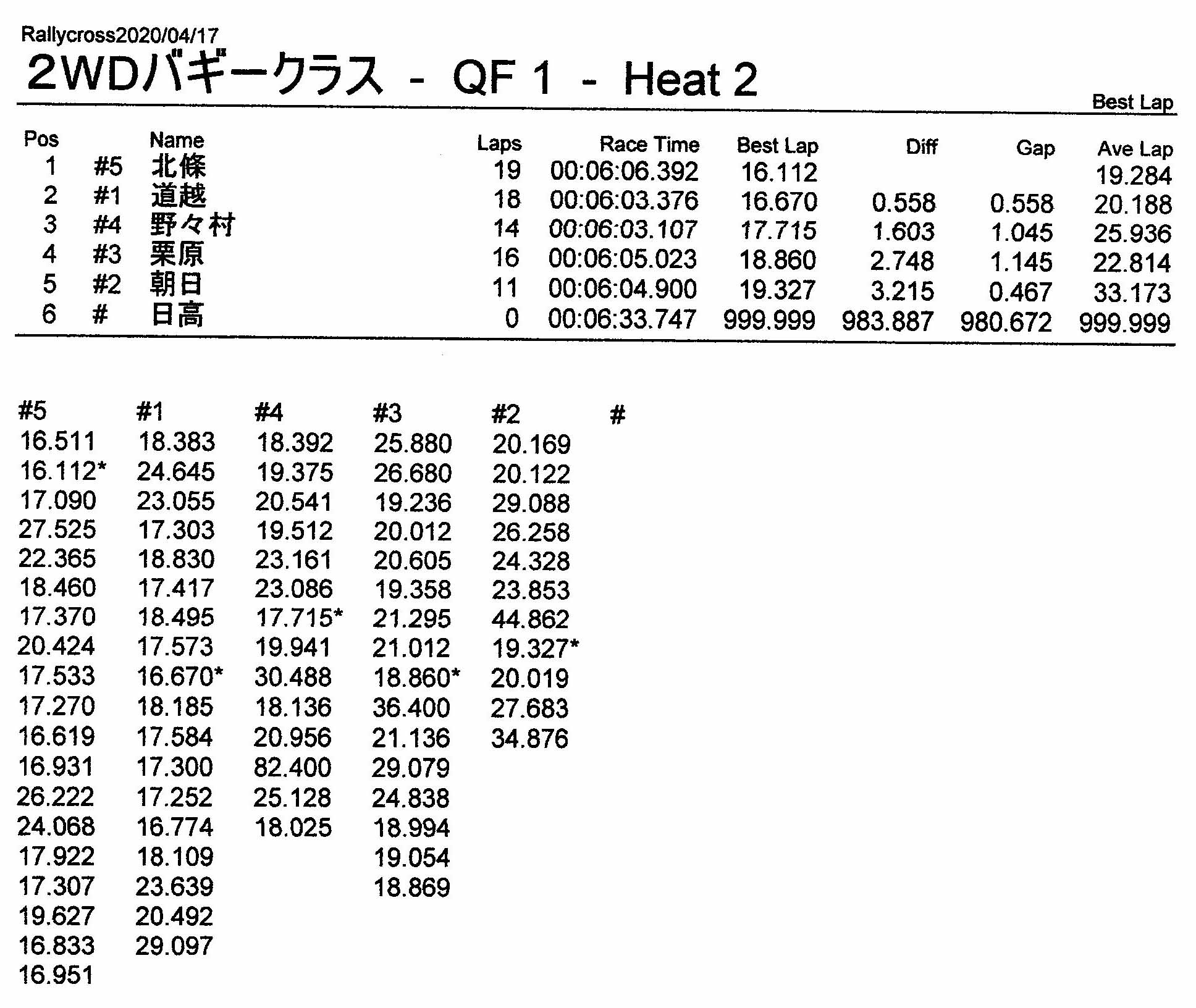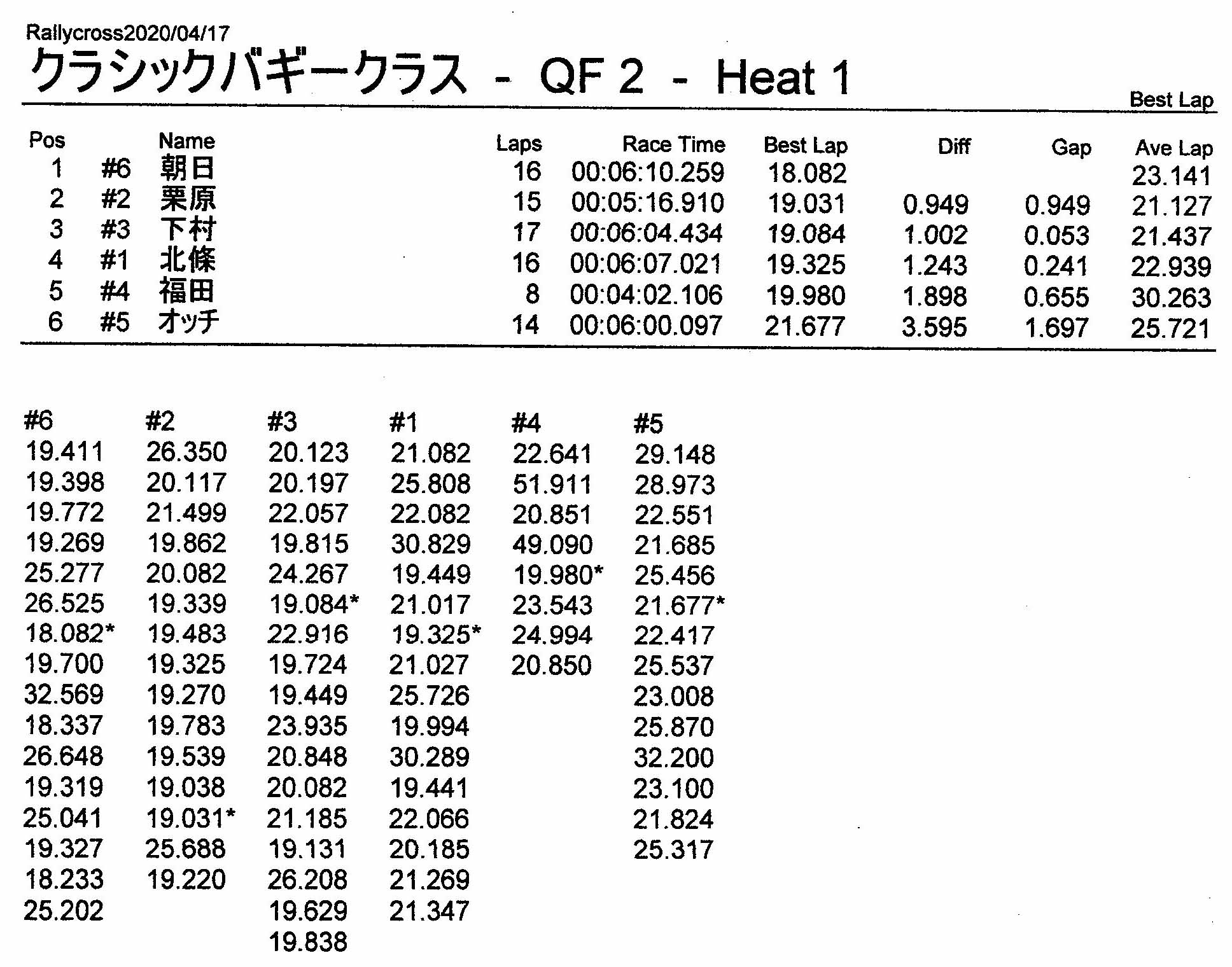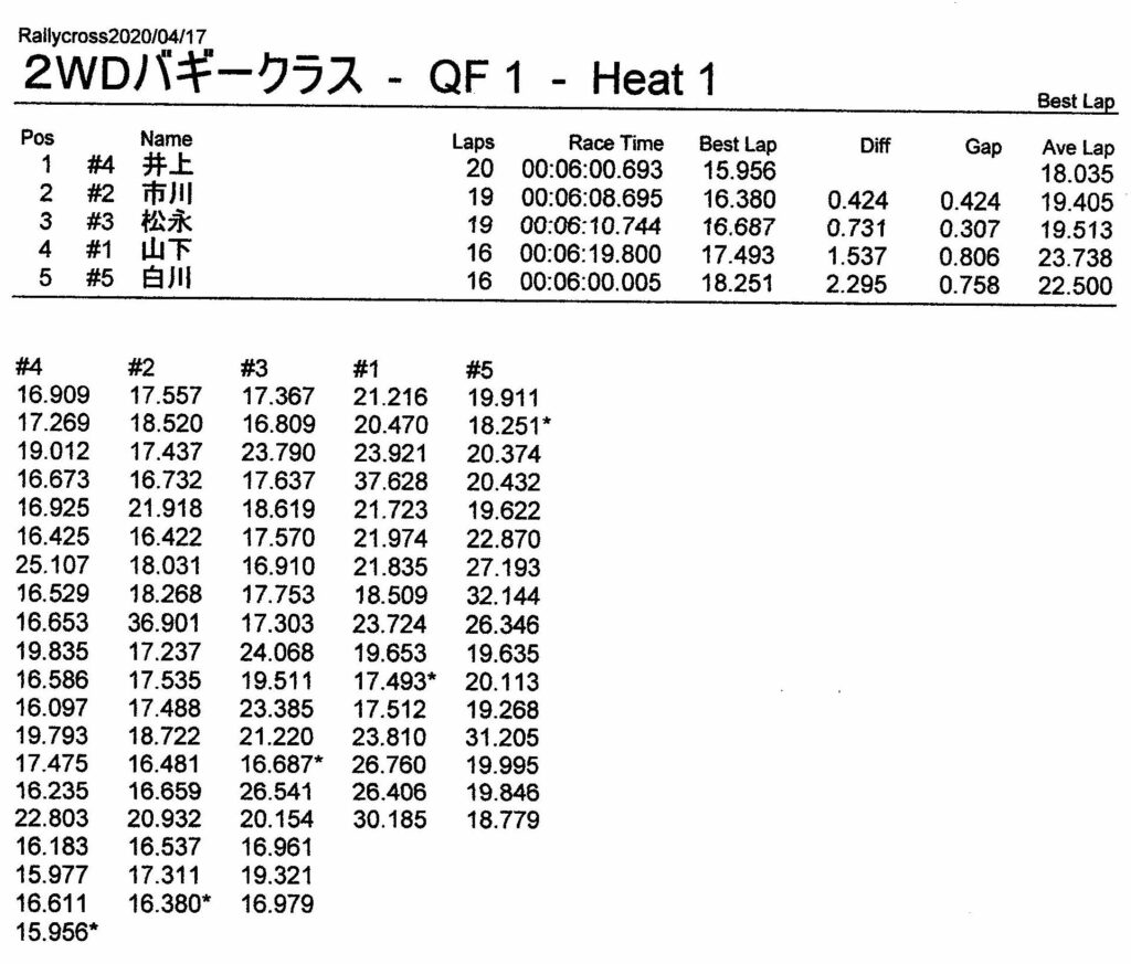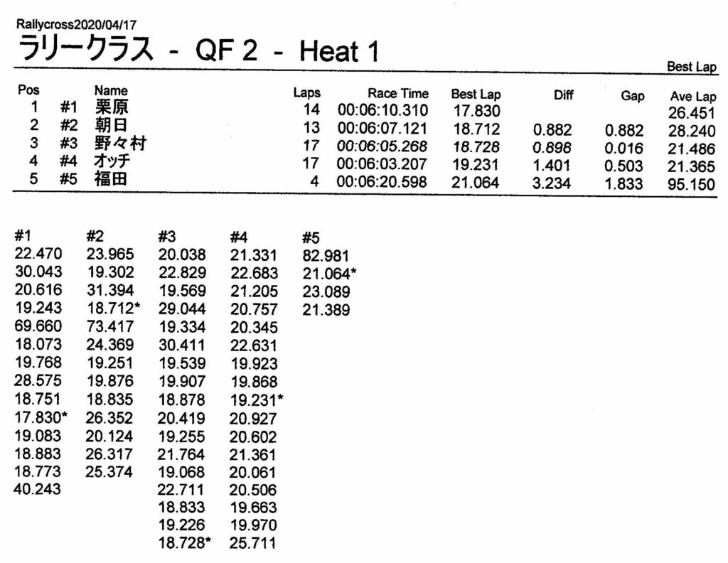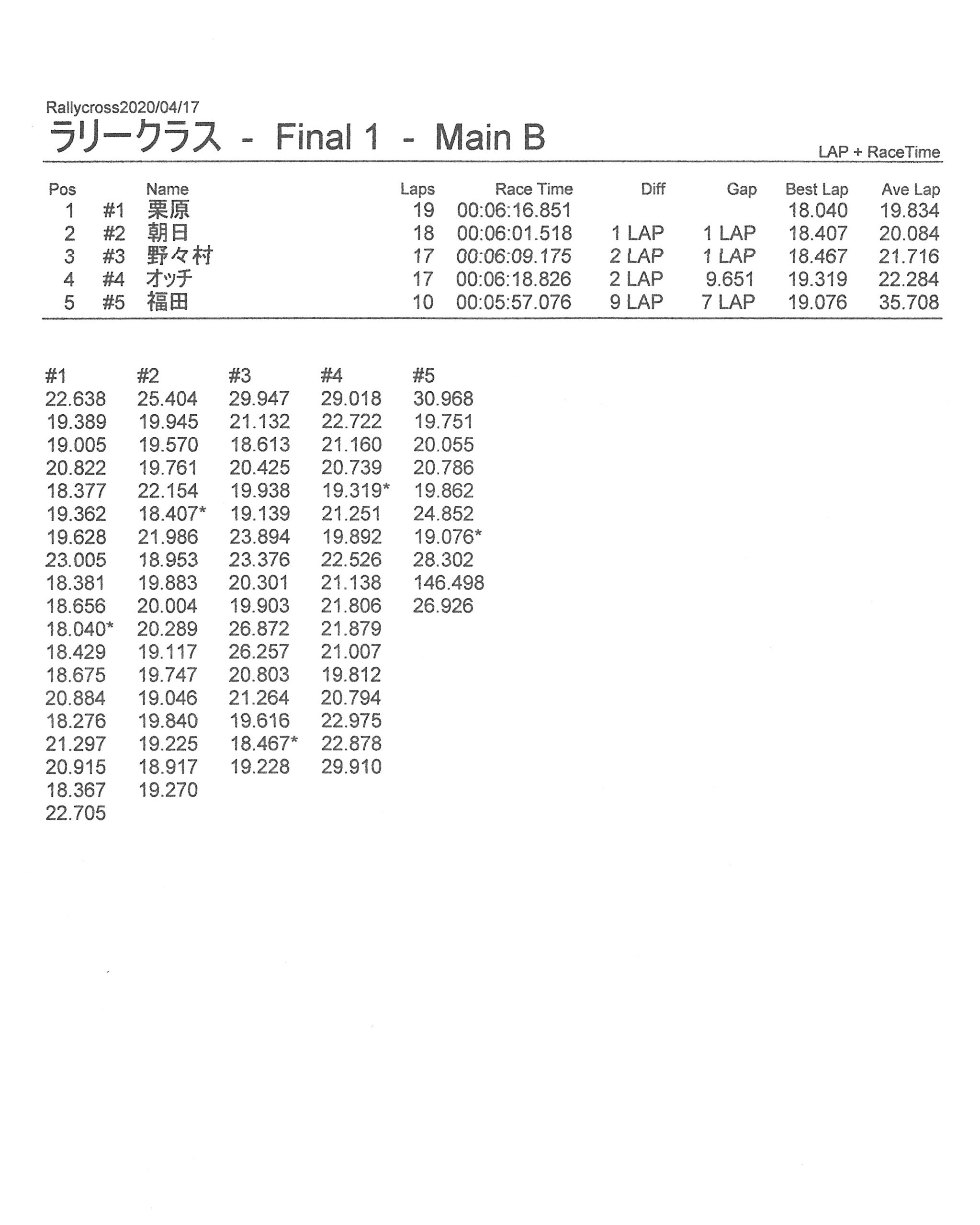 ラリークロスレース結果&動画 2021/4 更新日:2021年4月19日 公開日:2021年4月18日 レース結果 ラリークラス ラリークラスBメイン ラリークラスAメイン 2WDバギークラス 2WDバギークラスCメイン 2WDバギークラスBメイン 2WDバギークラスAメイン 4WDバギークラス 4WDバギークラスBメイン 4WDバギークラスAメイン クラシックバギークラス クラシックバギークラスBメイン ※クラシックバギークラスですが、Bメインでは特別参加でDT-03が2台一緒に走っています クラシックバギークラスAメイン 撮影機材不調により動画はありません。 おまけ(予選リザルト) ラリークラス 2WDバギークラス 4WDクラス クラシックバギークラス 関連記事 ラリークロスレース結果&動画 2022/2/27月例レース結果・動画 2024/09/08ラリークロスレース結果&動画 2021/65月・月例レース結果&動画ラリークロスレース結果&動画2021/2月例レース結果 ・動画 2024/06/02 投稿ナビゲーション 4月・月例レース結果&動画2021年5月ミニ3時間耐久レース結果
