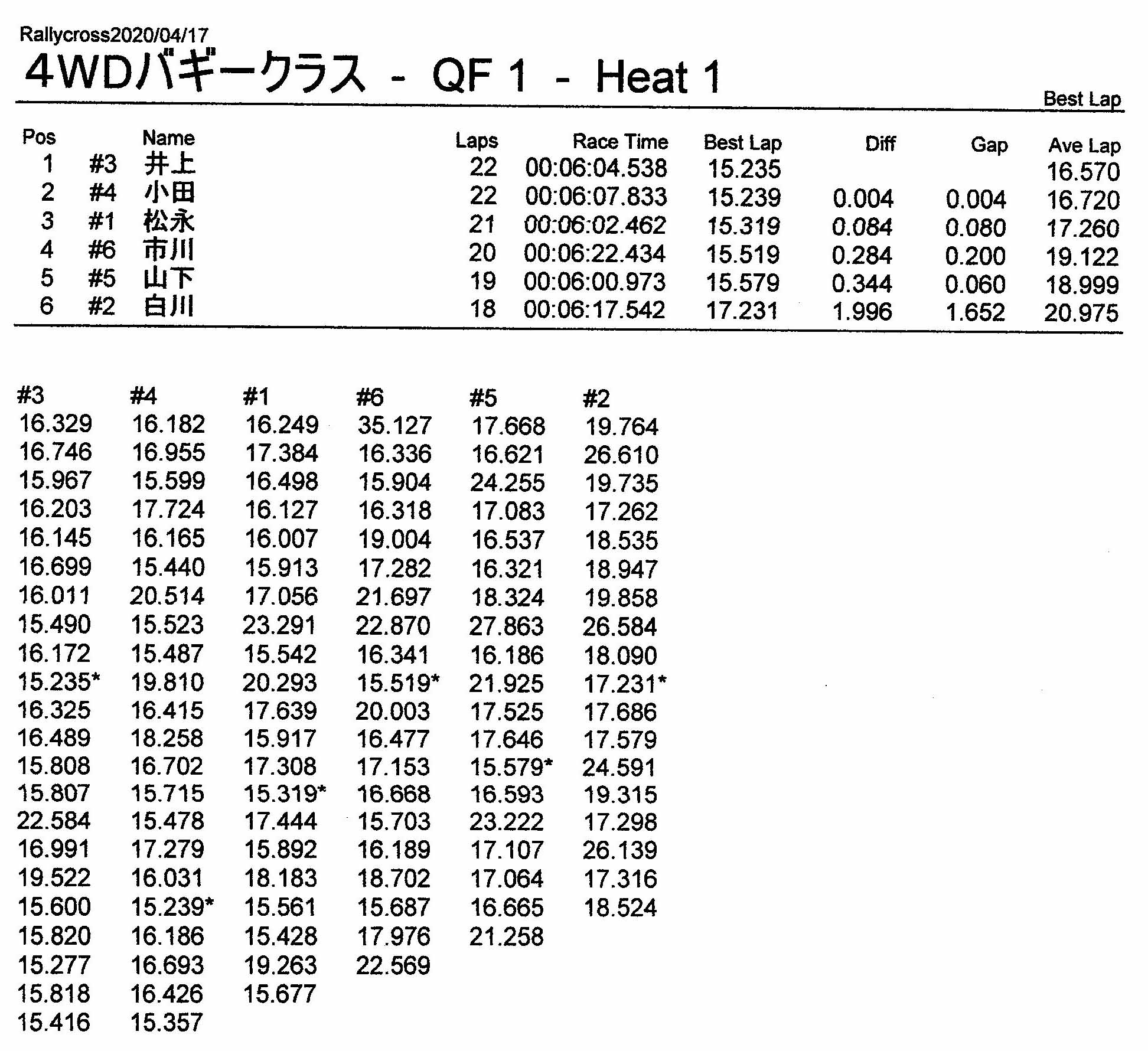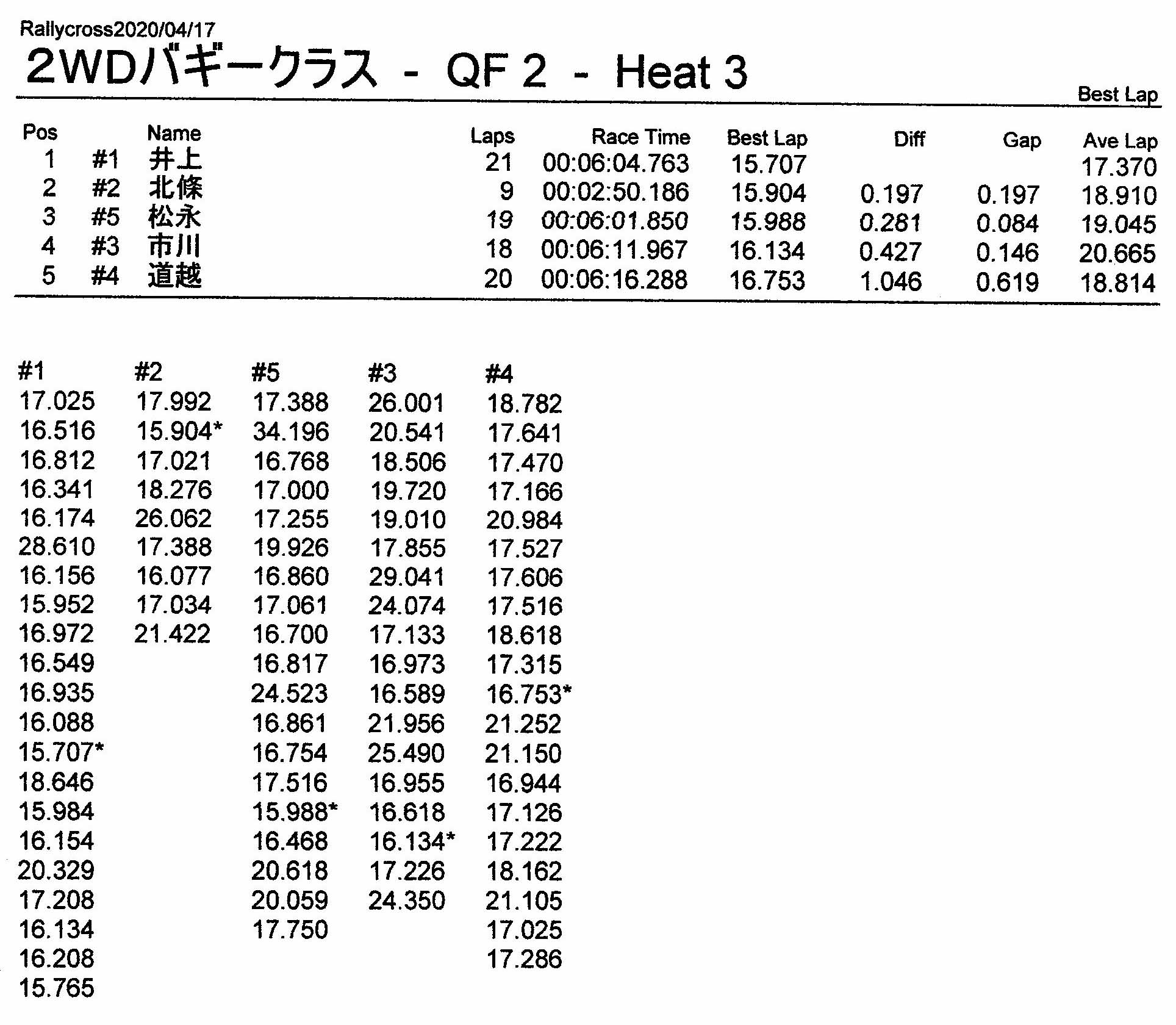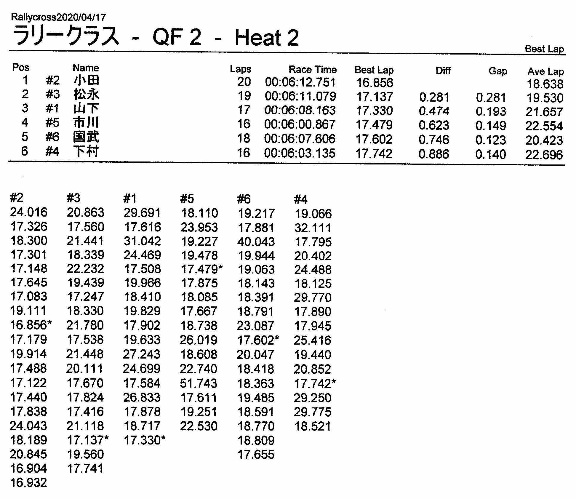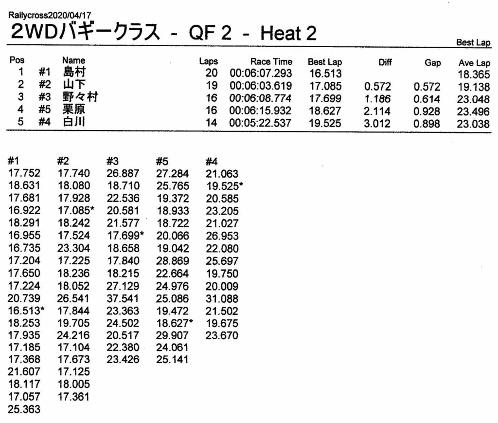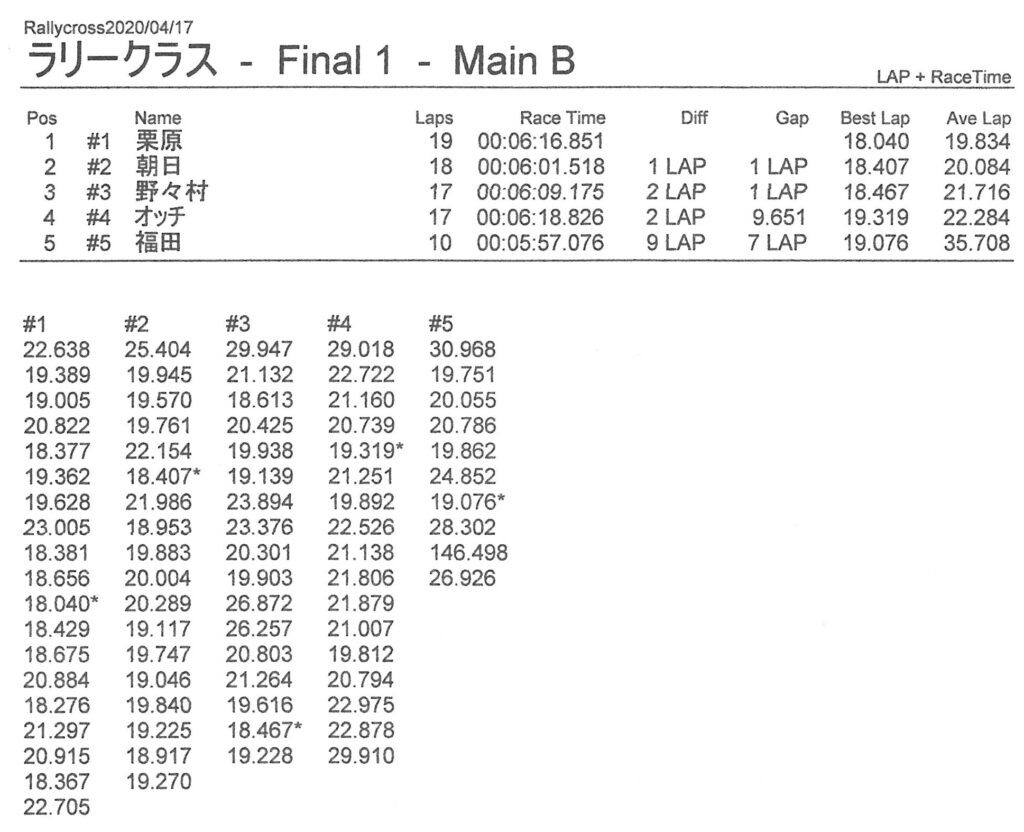 ラリークロスレース結果&動画 2021/4 更新日:2021年4月19日 公開日:2021年4月18日 レース結果 ラリークラス ラリークラスBメイン ラリークラスAメイン 2WDバギークラス 2WDバギークラスCメイン 2WDバギークラスBメイン 2WDバギークラスAメイン 4WDバギークラス 4WDバギークラスBメイン 4WDバギークラスAメイン クラシックバギークラス クラシックバギークラスBメイン ※クラシックバギークラスですが、Bメインでは特別参加でDT-03が2台一緒に走っています クラシックバギークラスAメイン 撮影機材不調により動画はありません。 おまけ(予選リザルト) ラリークラス 2WDバギークラス 4WDクラス クラシックバギークラス 関連記事 ラリークロスレース結果&動画 2022/2/27月例レース結果・動画 2024/09/08ラリークロスレース結果&動画 2021/65月・月例レース結果&動画ラリークロスレース結果&動画2021/2月例レース結果 ・動画 2024/06/02 投稿ナビゲーション 4月・月例レース結果&動画2021年5月ミニ3時間耐久レース結果