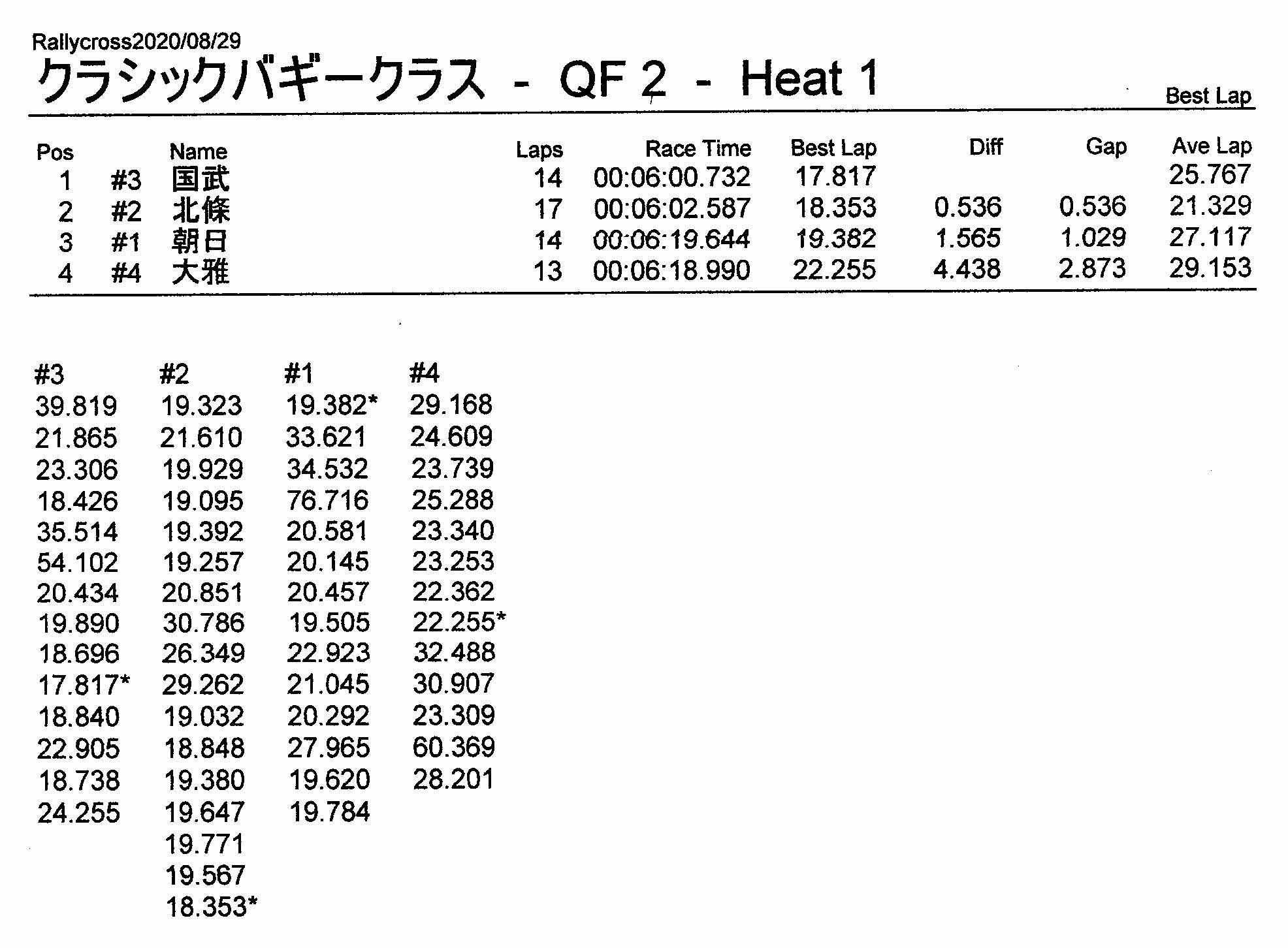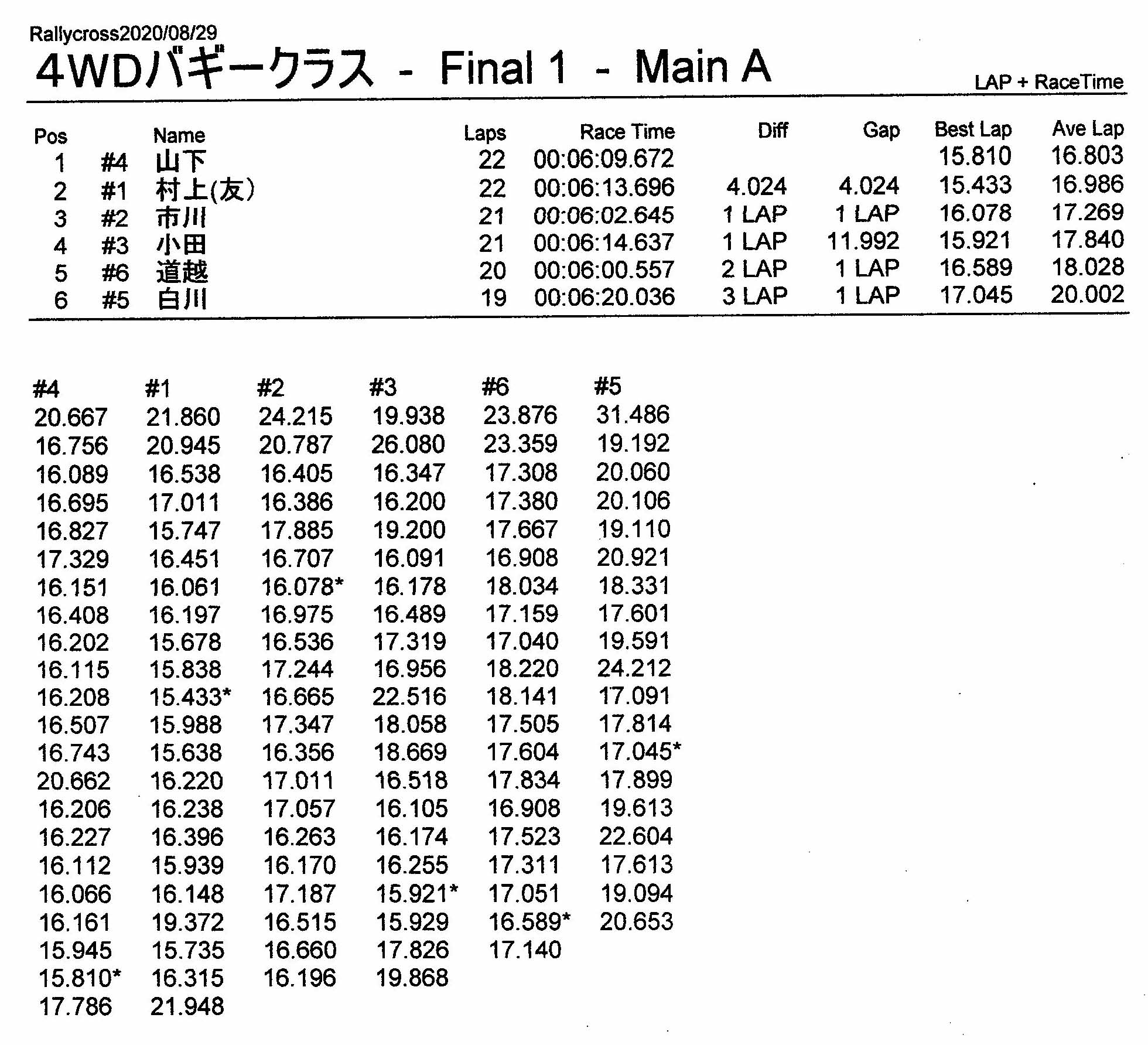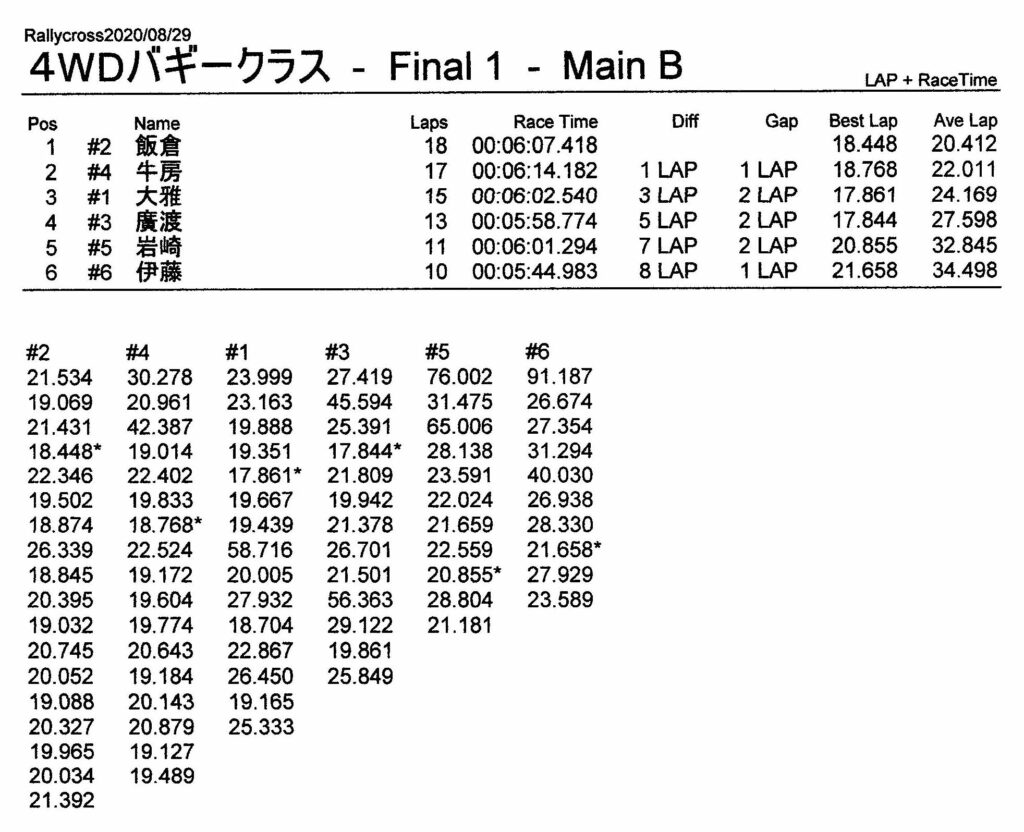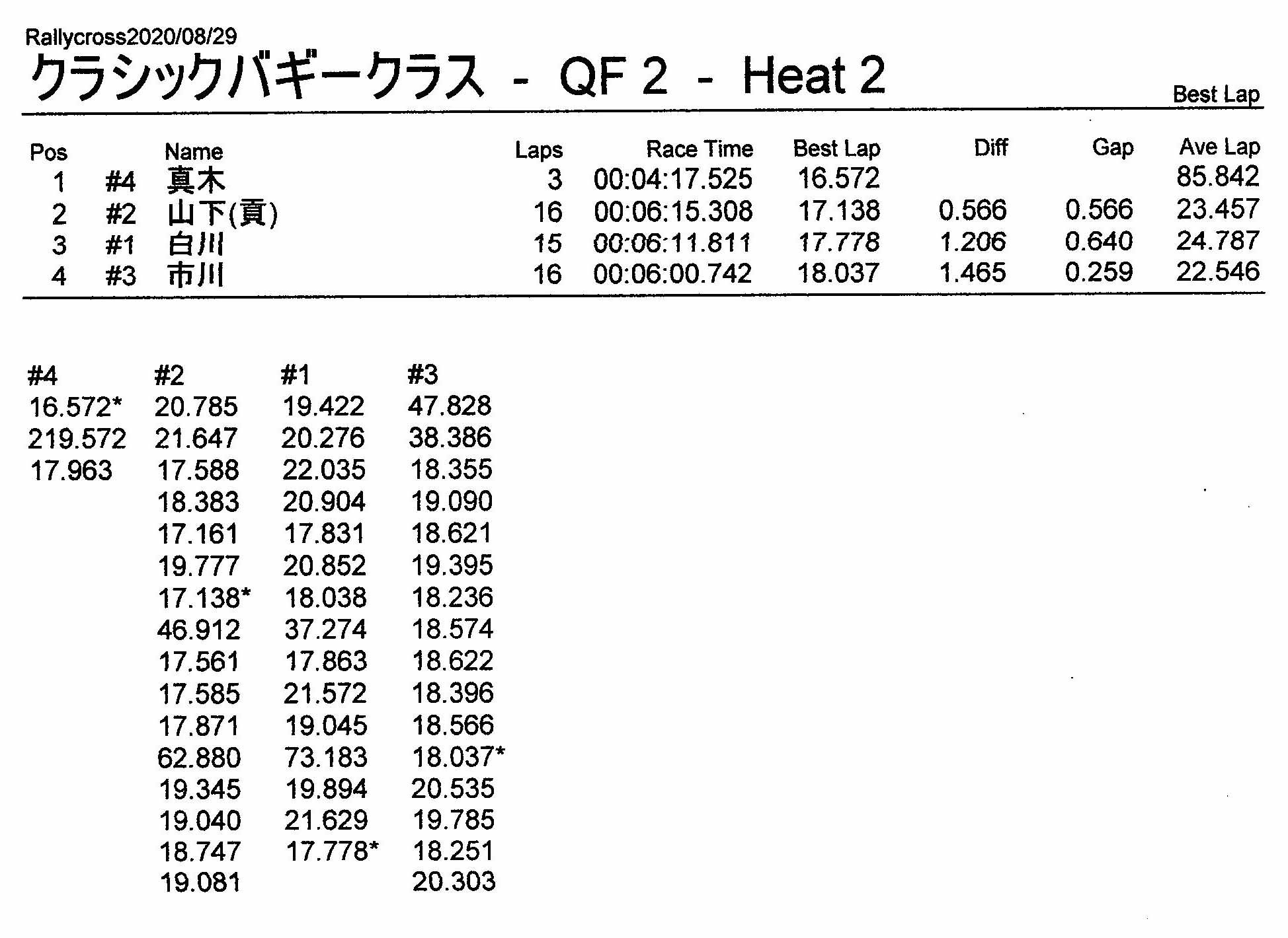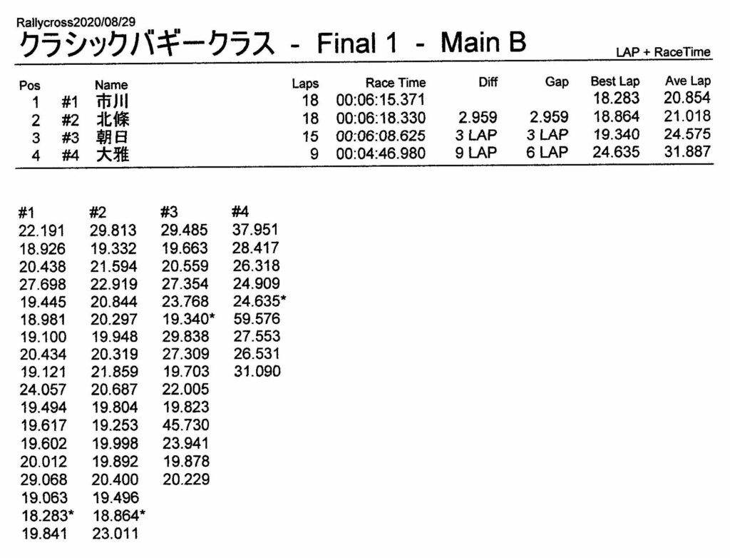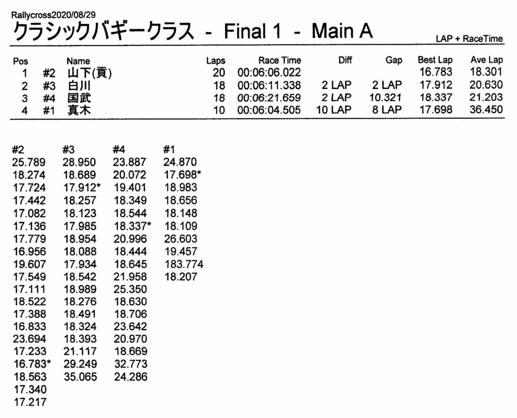 ラリークロスレース結果&動画 2021/8/29 公開日:2021年8月29日 レース結果 ラリークラス ラリークラスBメイン ラリークラスAメイン 2WDバギークラス 2WDバギークラスBメイン 機材不調により動画前半のみ 2WDバギークラスAメイン 機材不調により動画ありません。 4WDバギークラス 4WDバギークラスBメイン 4WDバギークラスAメイン クラシックバギークラス クラシックバギークラスBメイン クラシックバギークラスAメイン おまけ(予選リザルト) ラリークラス 2WDクラス 4WDクラス クラシックバギークラス 関連記事 ラリークロス結果&動画-2024-04-282月・月例レース結果&動画ラリークロスレース結果&動画 2021/412月の月例レースの結果ラリークロスを延期したのに、晴れたので模擬レース・結果月例レース結果・動画 2025/01/13 投稿ナビゲーション 7月・月例レース結果&動画9月・月例レース結果&動画