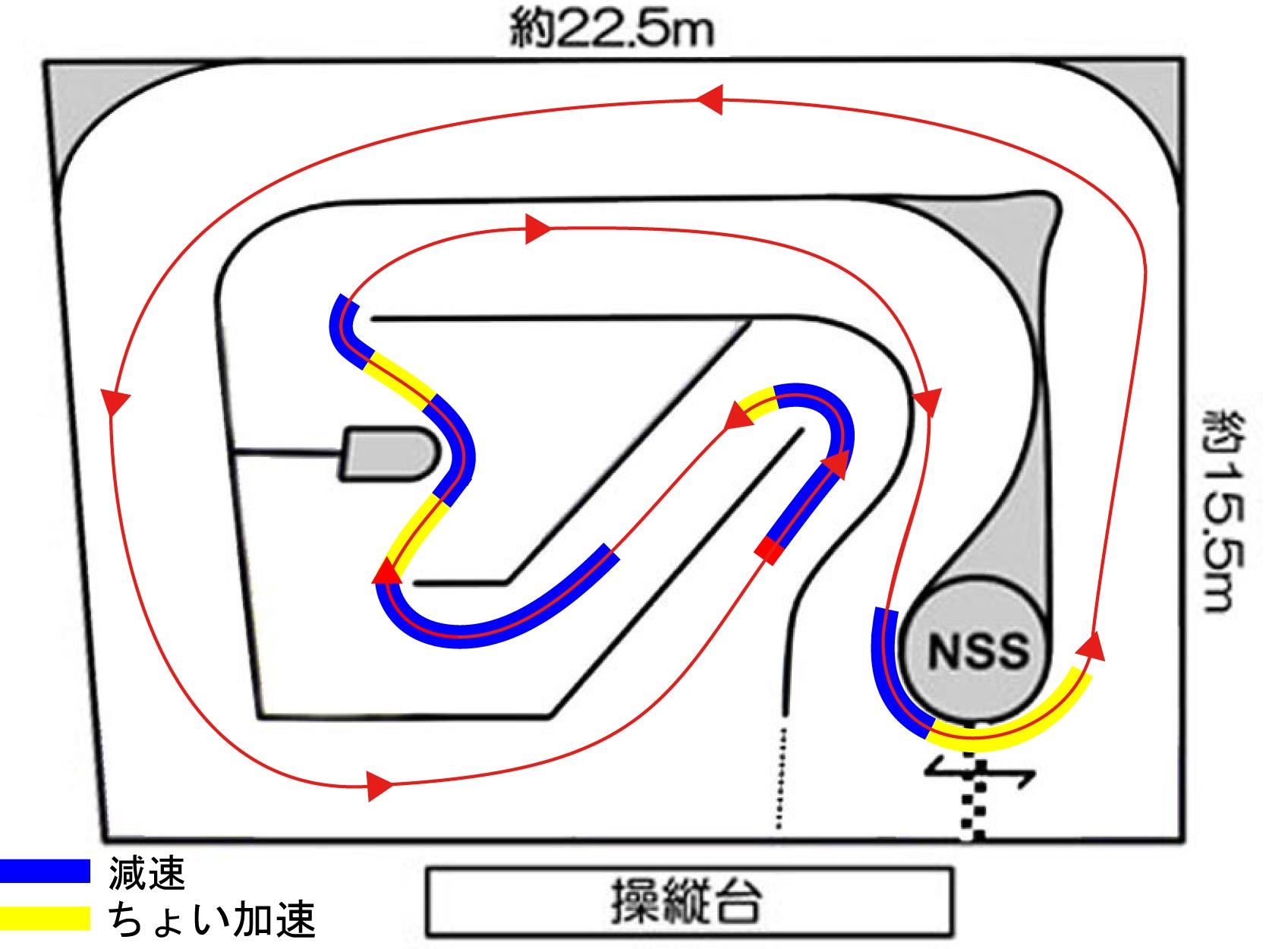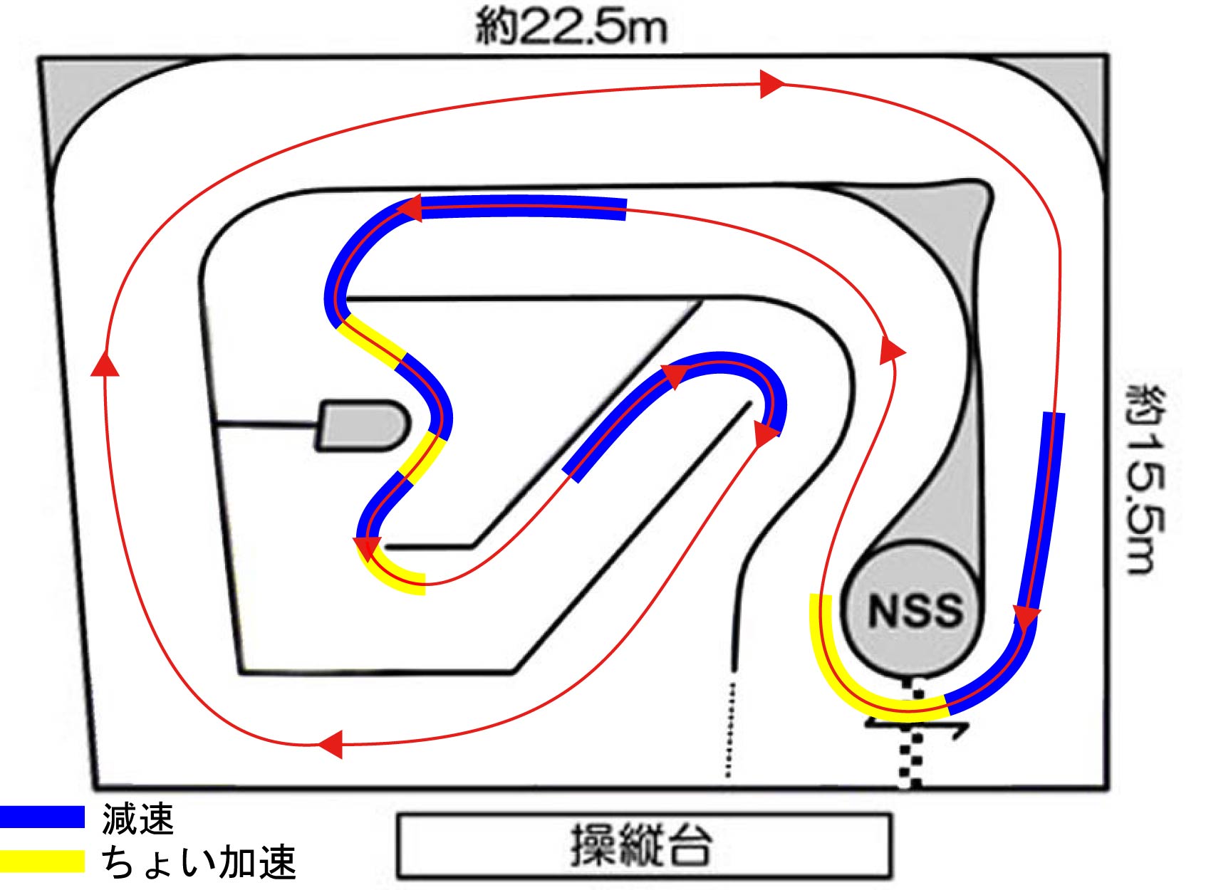 ハーフスロットルは下の図の青いラインと黄色のラインで上手く使うと速く走れます。(ハーフスロットルの代わりに煽りスロットルでも良い)
