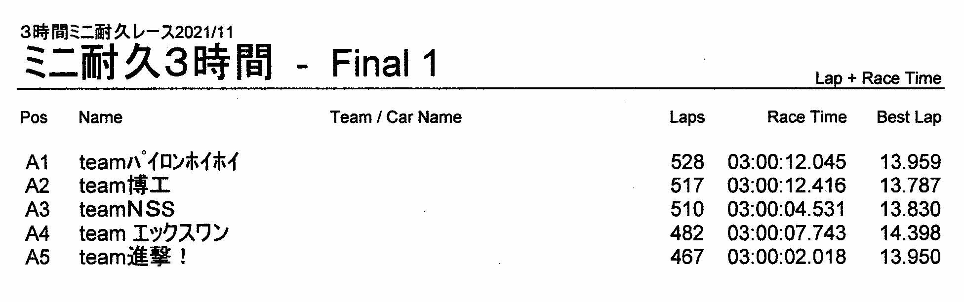 2021年11月ミニ3時間耐久レース結果 更新日:2021年11月24日 公開日:2021年11月23日 レース結果 優勝 528周 team パイロンホイホイ DSC_0246 第二位 517周 team 博工 第三位 510周 team NSS 第四位 482周 team エックスワン 第五位 467周 team 進撃! レースダイジェスト動画 レースダイジェスト動画2 トロフィーと景品 リザルト 関連記事 ラリークロス結果&動画-2025-01-034月・月例レース結果&動画3月・月例レース結果&動画10月・月例レース結果&動画ラリークロス結果 2025.02.2410月・月例レース結果&動画 投稿ナビゲーション 11月・月例レース結果&動画12月・月例レース結果&動画