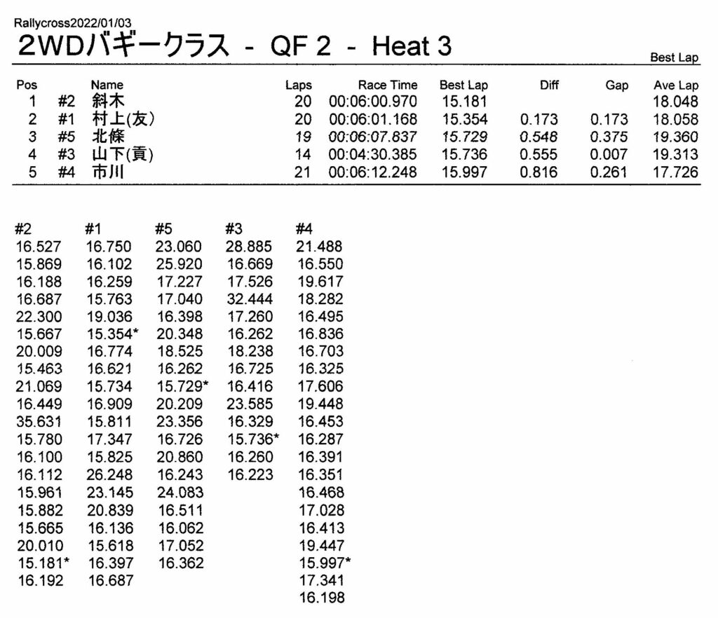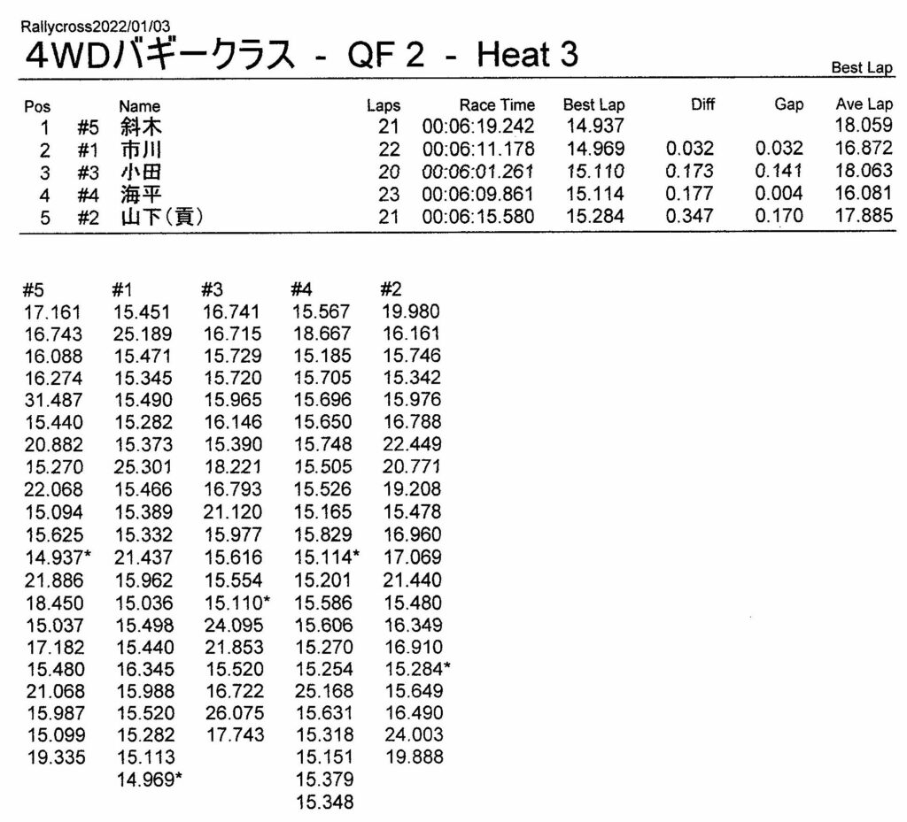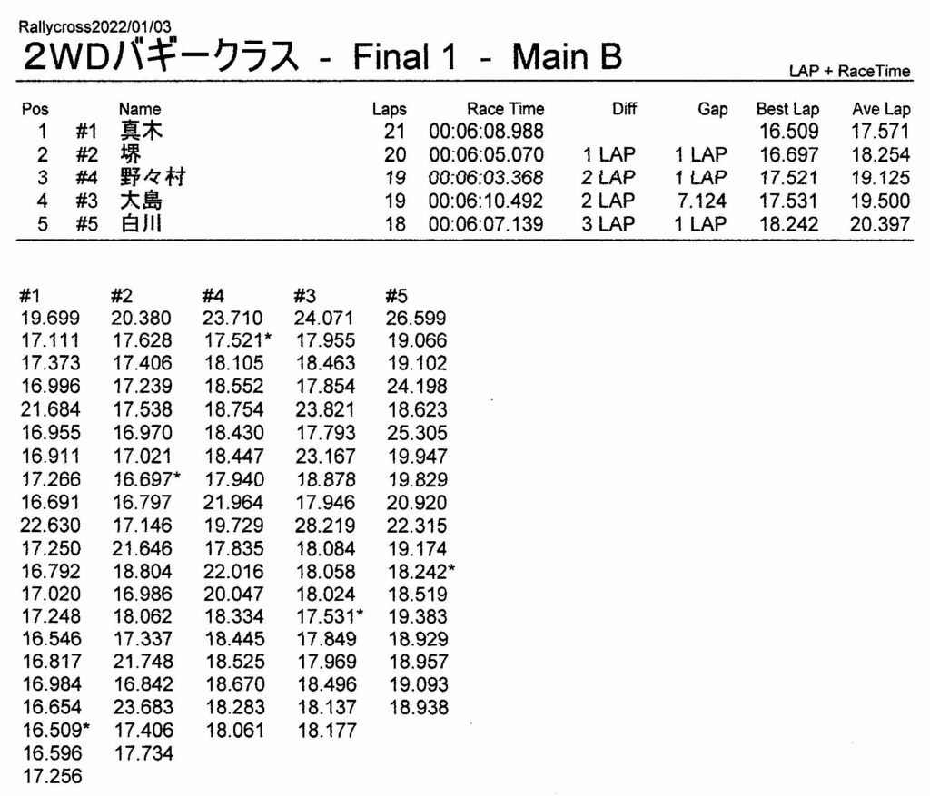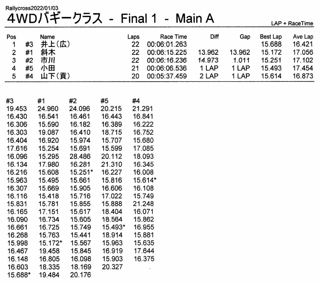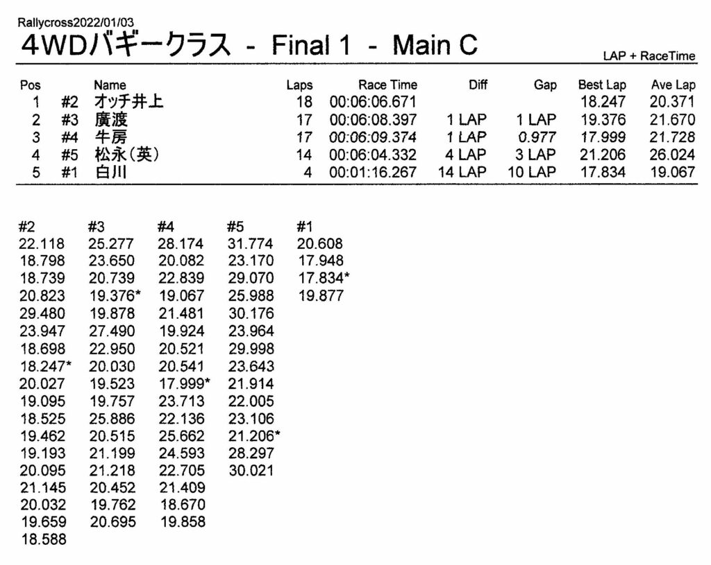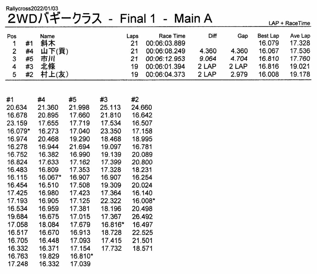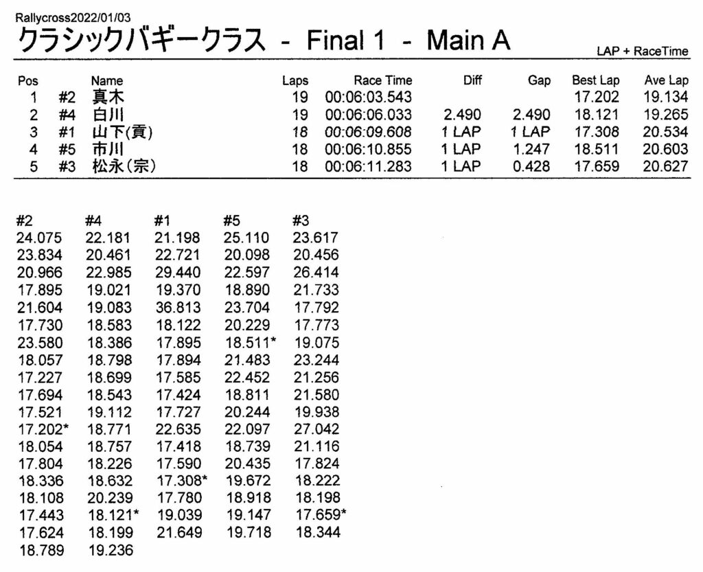 ラリークロスレース結果&動画 2022/1/3 公開日:2022年1月3日 レース結果 ラリークラス ラリークラスCメイン ラリークラスBメイン ラリークラスAメイン 2WDバギークラス 2WDバギークラスCメイン 2WDバギークラスBメイン 2WDバギークラスAメイン 4WDバギークラス 4WDバギークラスCメイン 4WDバギークラスBメイン 4WDバギークラスAメイン クラシックバギークラス クラシックバギークラスBメイン クラシックバギークラスAメイン おまけ(予選リザルト) ラリークラス 2WDクラス 4WDクラス クラシックバギークラス 関連記事 3月・月例レース結果・動画ラリークロスレース結果&動画 2021/61月の月例レース結果・動画11月の月例レースの結果月例レース結果 ・動画 2024/04/142020年5月ミニ3時間耐久レース結果 投稿ナビゲーション 12月・月例レース結果&動画1月・月例レース結果&動画