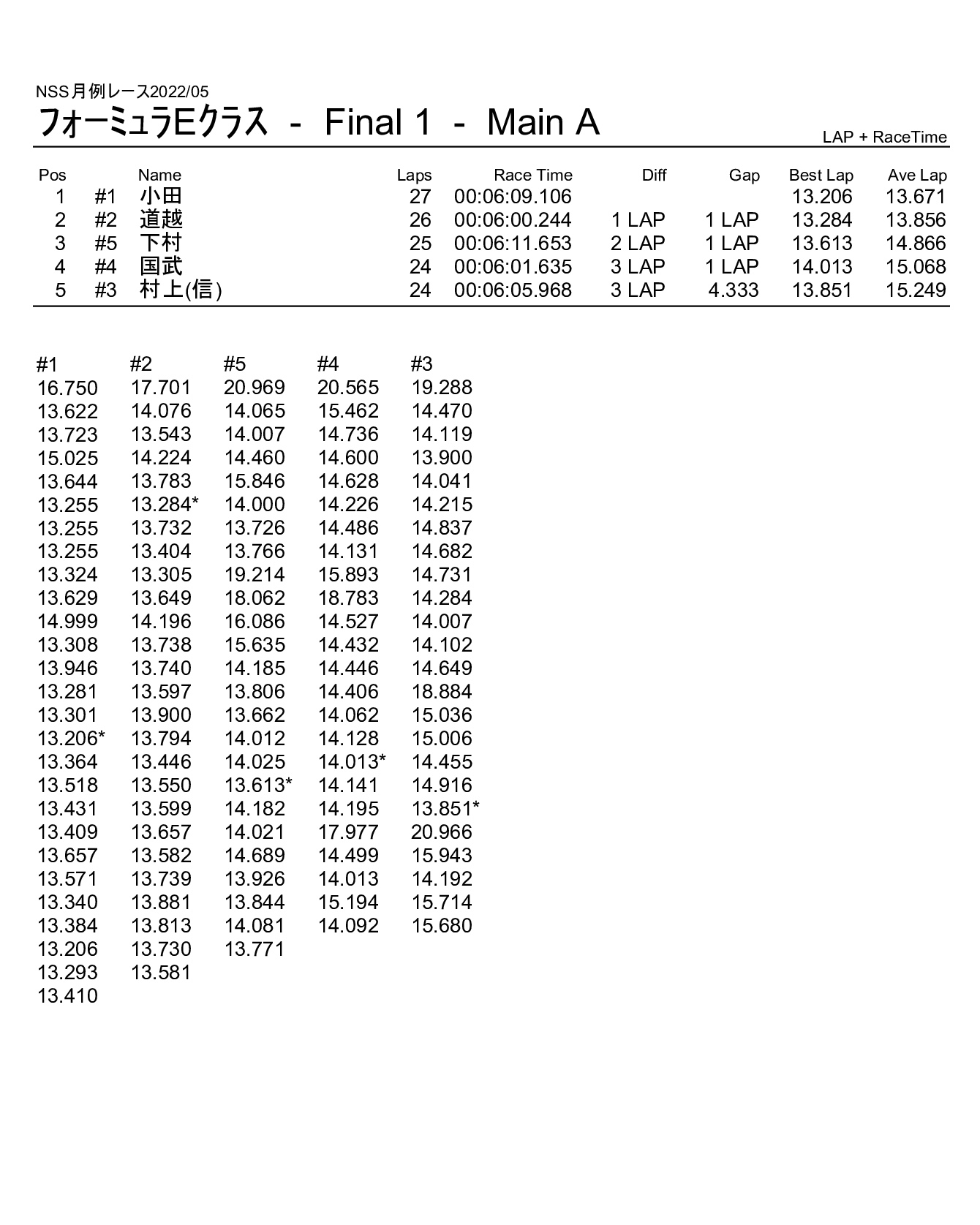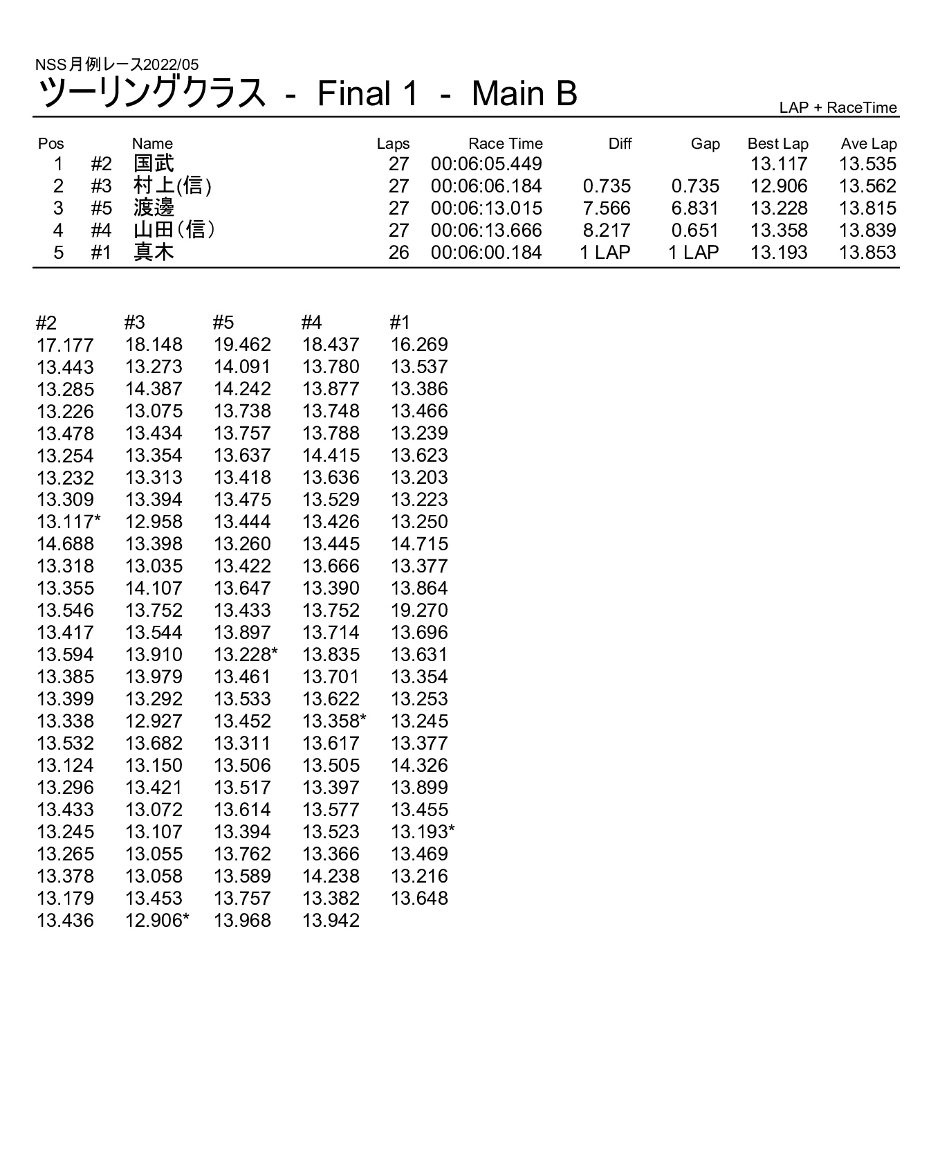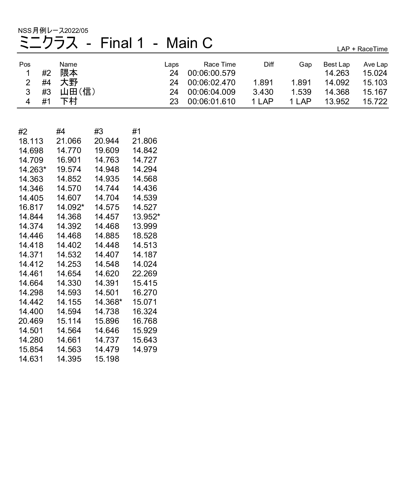 5月・月例レース結果&動画 公開日:2022年5月16日 レース結果 ミニクラス ミニクラスCメイン ミニクラスBメイン ミニクラスAメイン F-1クラスAメイン ツーリングクラス ツーリングクラスCメイン ツーリングクラスBメイン ツーリングクラスAメイン フォーミュラEクラス フォーミュラEクラスAメイン おまけ(予選リザルト) ミニクラス F-1クラス ツーリングクラス フォーミュラEクラス 関連記事 3月の月例レース結果・動画2020/3/158月・月例レース結果・動画11月の月例レース結果&動画2020年5月ミニ3時間耐久レース結果8月・月例レース結果&動画12月の月例レースの結果 投稿ナビゲーション 2022年5月ミニ3時間耐久レース結果6月・月例レース結果&動画