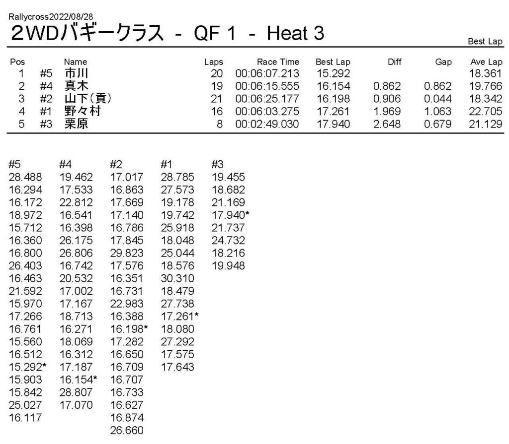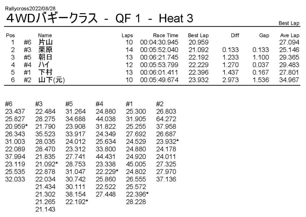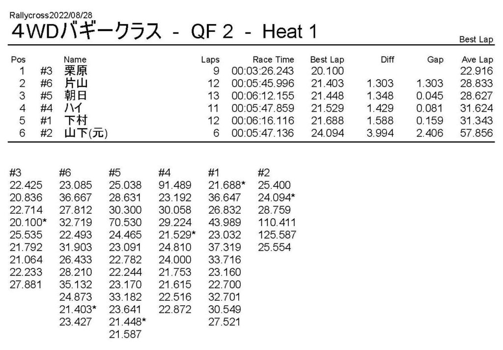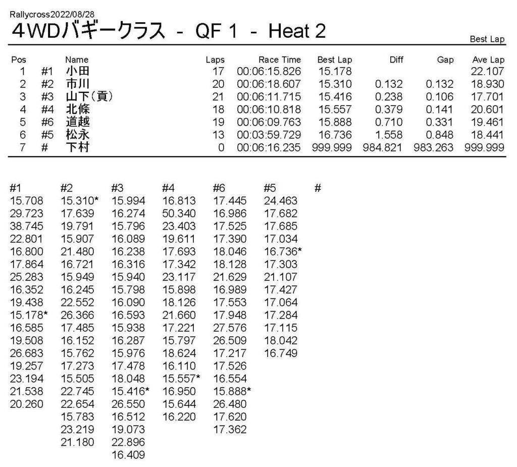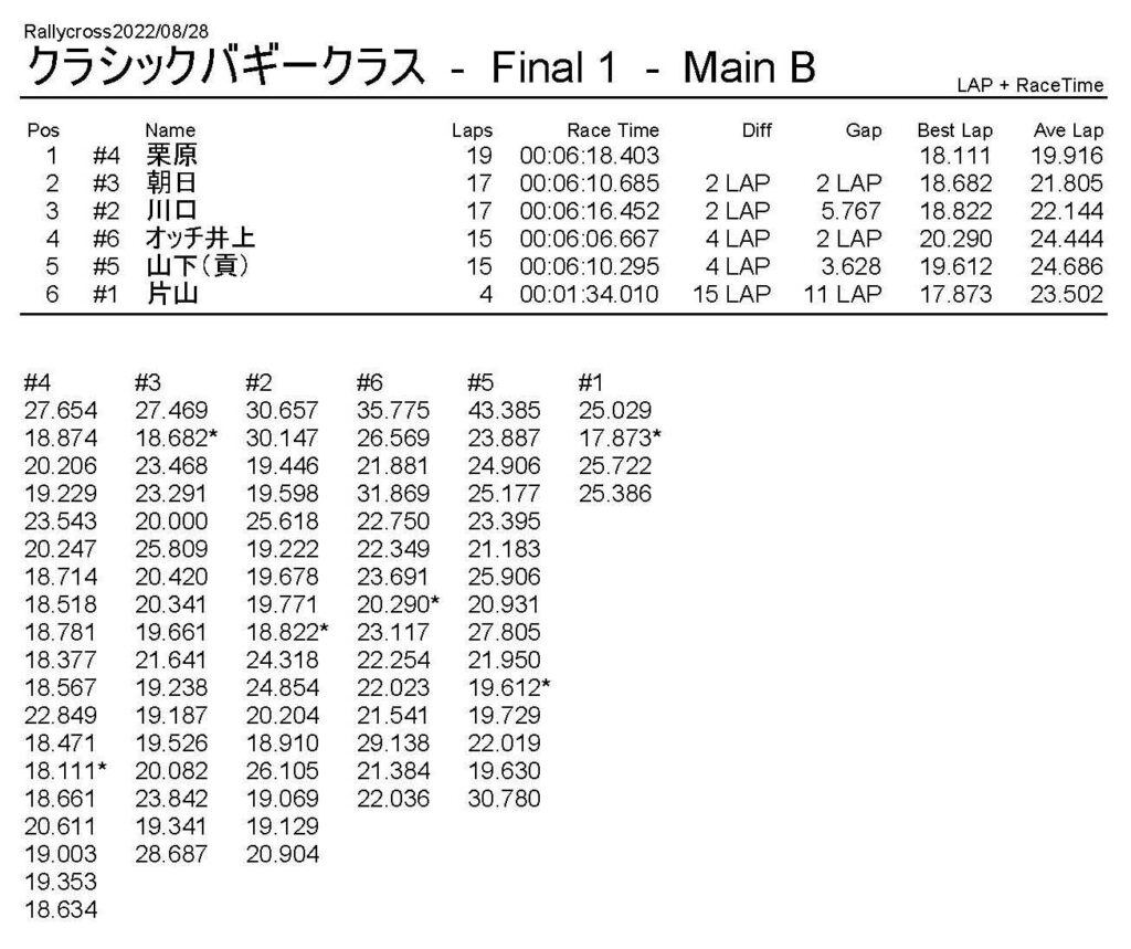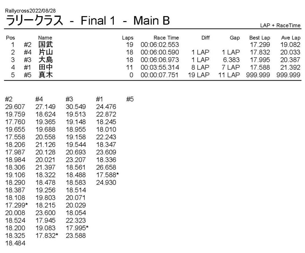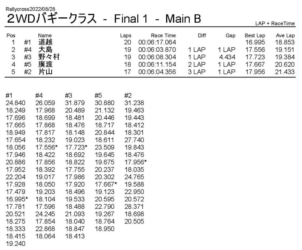 ラリークロスレース結果&動画 2022/8/28 公開日:2022年8月29日 レース結果 ラリークラス ラリークラスDメイン ラリークラスCメイン ラリークラスBメイン ラリークラスAメイン 2WDバギークラス 2WDバギークラスCメイン 2WDバギークラスBメイン 2WDバギークラスAメイン 4WDバギークラス 4WDバギークラスCメイン 4WDバギークラスBメイン 4WDバギークラスAメイン クラシックバギークラス クラシックバギークラスBメイン クラシックバギークラスAメイン おまけ(予選リザルト) ラリークラス 2WDクラス 4WDクラス クラシックバギークラス 関連記事 6月の月例レース結果・動画 2020/6/79月・月例レース結果&動画ラリークロスレース結果&動画 2023/4/23月例レース結果・動画 2025/01/13ラリークロスレース結果&動画 2022/1/3ラリークロスレースリザルト 投稿ナビゲーション 8月・月例レース結果&動画9月・月例レース結果&動画