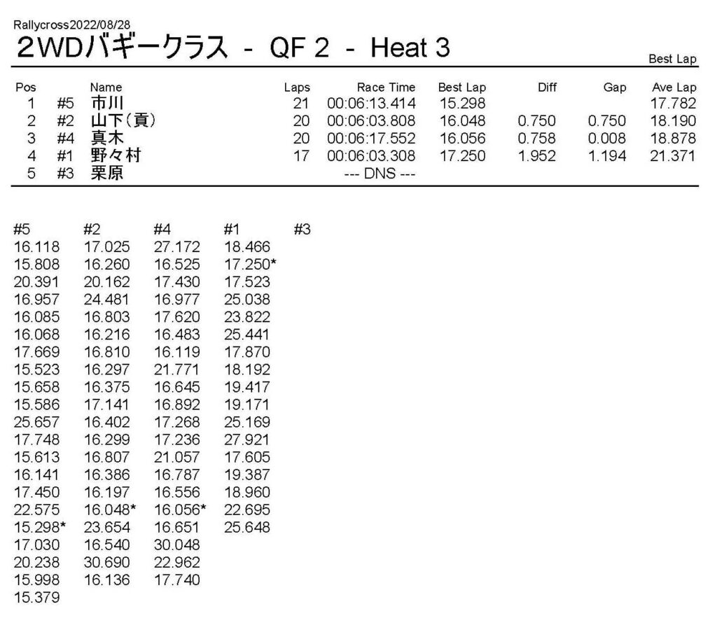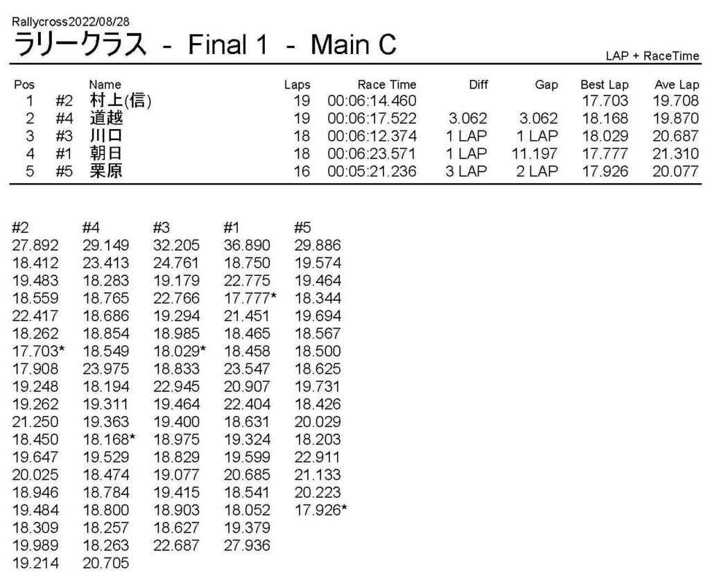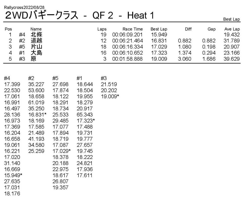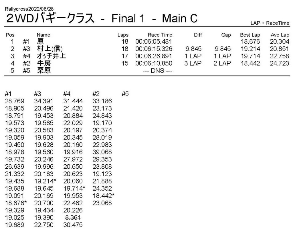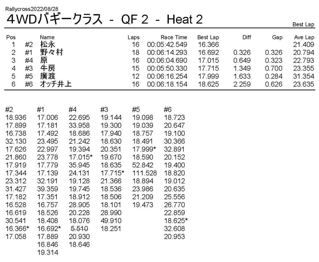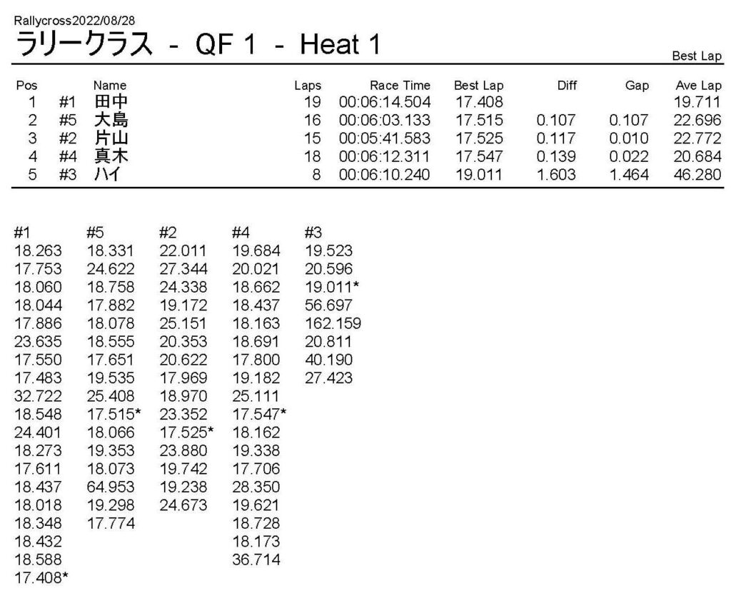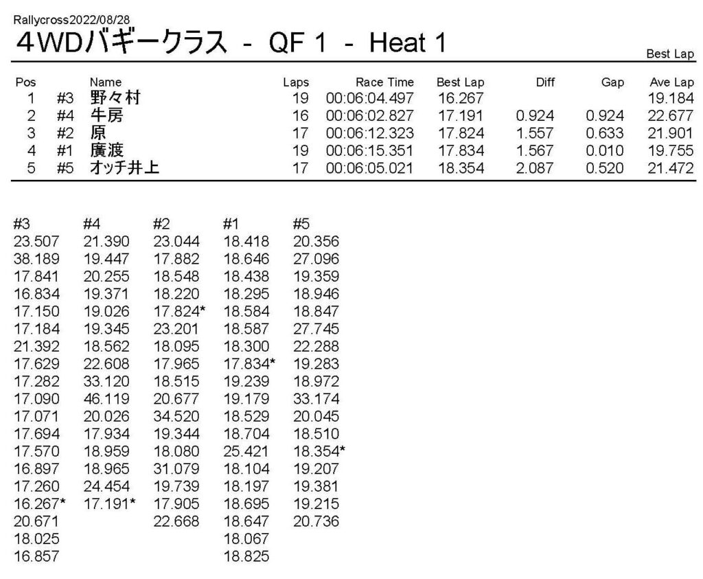 ラリークロスレース結果&動画 2022/8/28 公開日:2022年8月29日 レース結果 ラリークラス ラリークラスDメイン ラリークラスCメイン ラリークラスBメイン ラリークラスAメイン 2WDバギークラス 2WDバギークラスCメイン 2WDバギークラスBメイン 2WDバギークラスAメイン 4WDバギークラス 4WDバギークラスCメイン 4WDバギークラスBメイン 4WDバギークラスAメイン クラシックバギークラス クラシックバギークラスBメイン クラシックバギークラスAメイン おまけ(予選リザルト) ラリークラス 2WDクラス 4WDクラス クラシックバギークラス 関連記事 6月の月例レース結果・動画 2020/6/79月・月例レース結果&動画ラリークロスレース結果&動画 2023/4/23月例レース結果・動画 2025/01/13ラリークロスレース結果&動画 2022/1/3ラリークロスレースリザルト 投稿ナビゲーション 8月・月例レース結果&動画9月・月例レース結果&動画