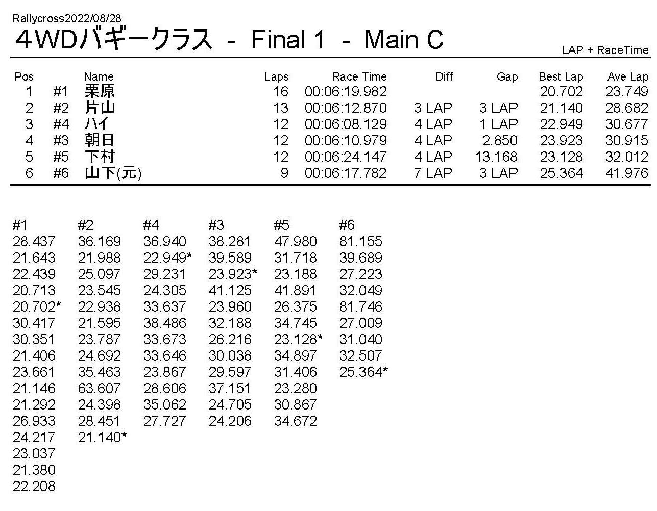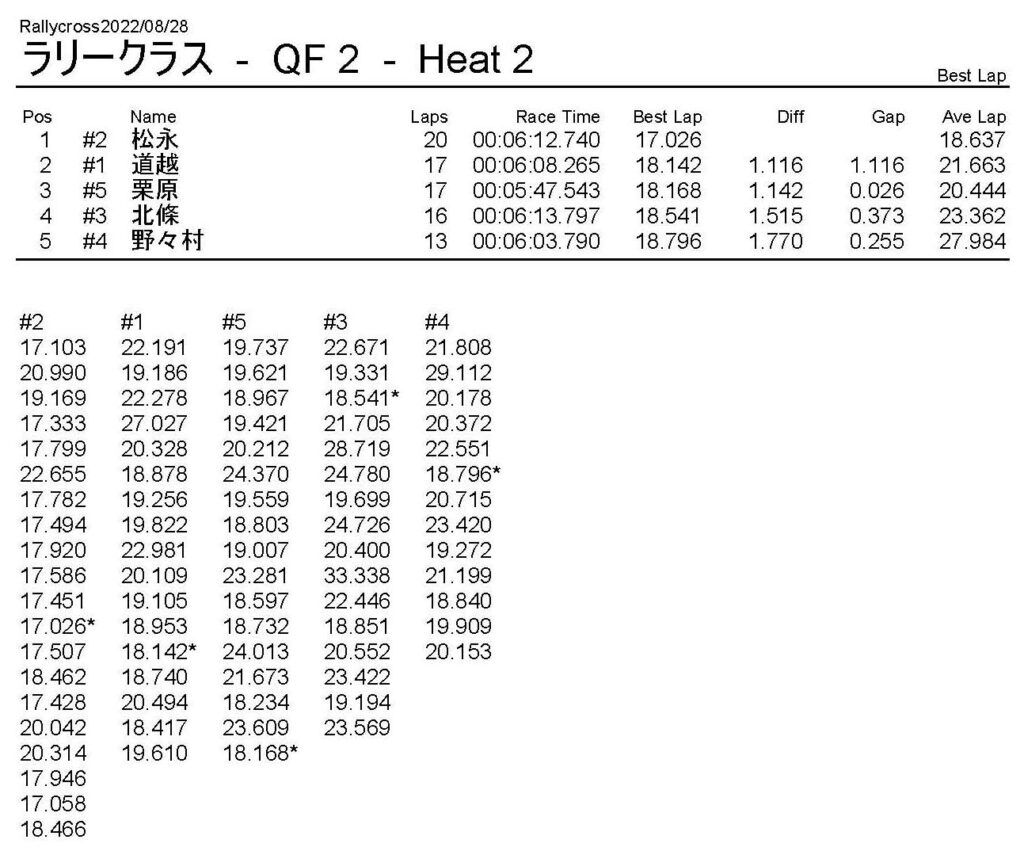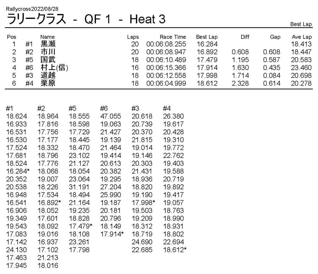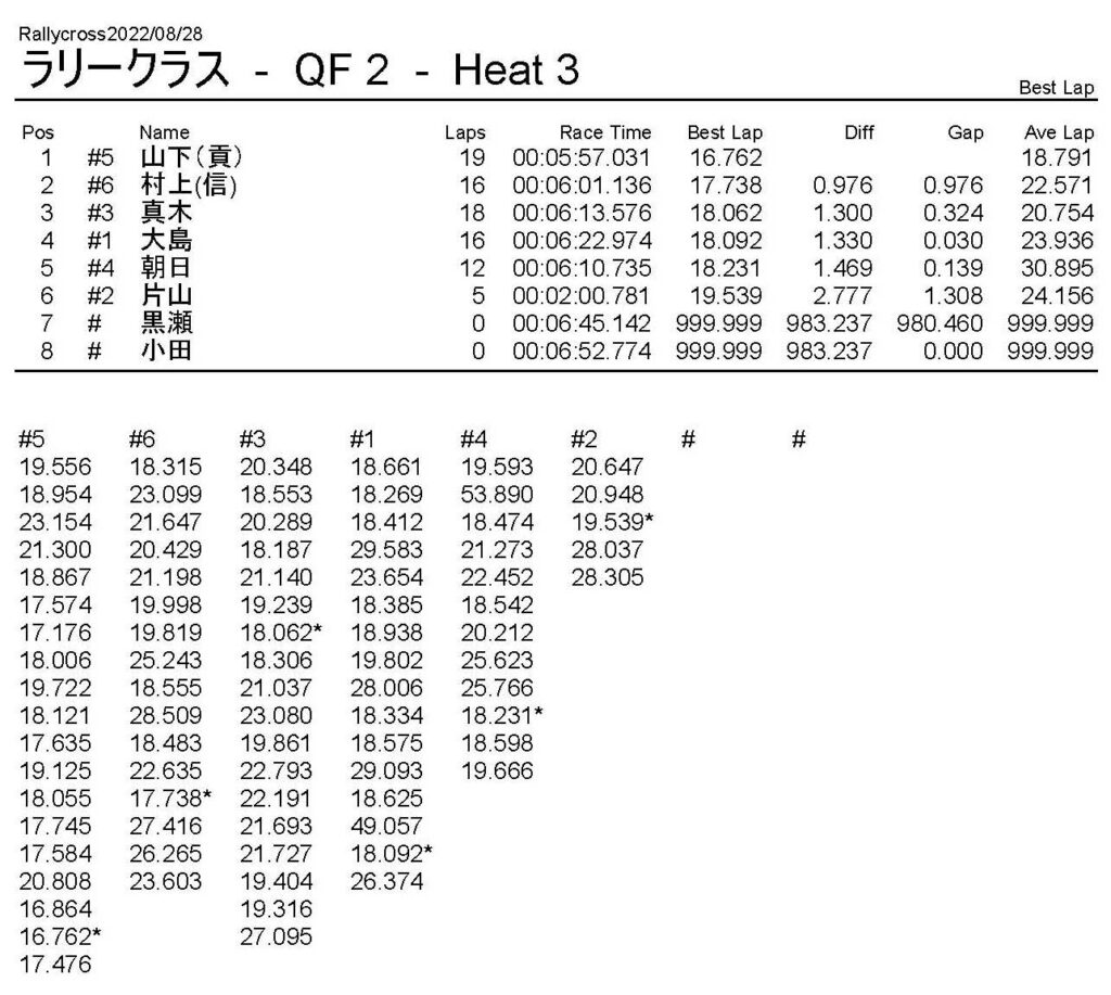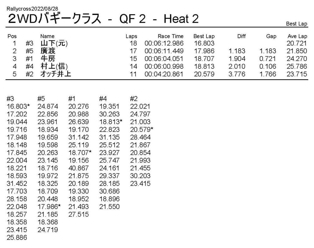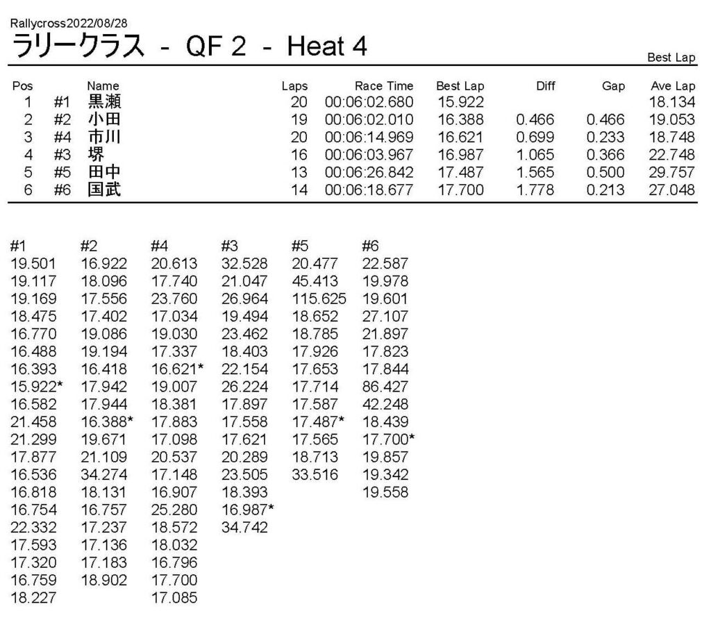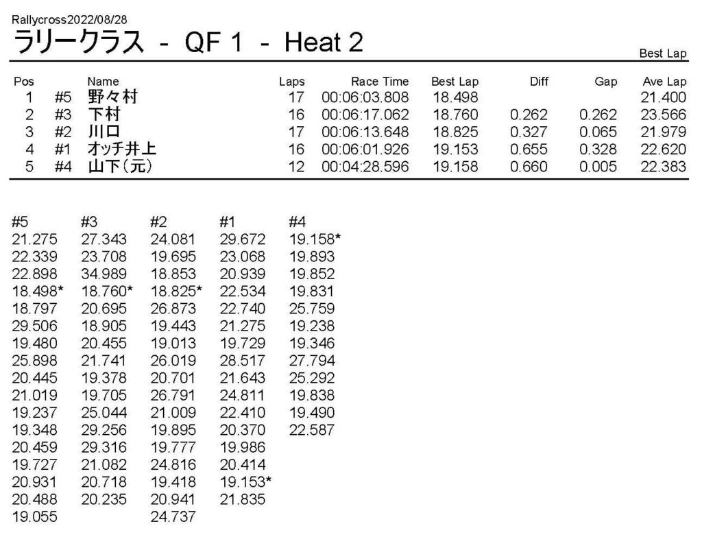 ラリークロスレース結果&動画 2022/8/28 公開日:2022年8月29日 レース結果 ラリークラス ラリークラスDメイン ラリークラスCメイン ラリークラスBメイン ラリークラスAメイン 2WDバギークラス 2WDバギークラスCメイン 2WDバギークラスBメイン 2WDバギークラスAメイン 4WDバギークラス 4WDバギークラスCメイン 4WDバギークラスBメイン 4WDバギークラスAメイン クラシックバギークラス クラシックバギークラスBメイン クラシックバギークラスAメイン おまけ(予選リザルト) ラリークラス 2WDクラス 4WDクラス クラシックバギークラス 関連記事 6月の月例レース結果・動画 2020/6/79月・月例レース結果&動画ラリークロスレース結果&動画 2023/4/23月例レース結果・動画 2025/01/13ラリークロスレース結果&動画 2022/1/3ラリークロスレースリザルト 投稿ナビゲーション 8月・月例レース結果&動画9月・月例レース結果&動画