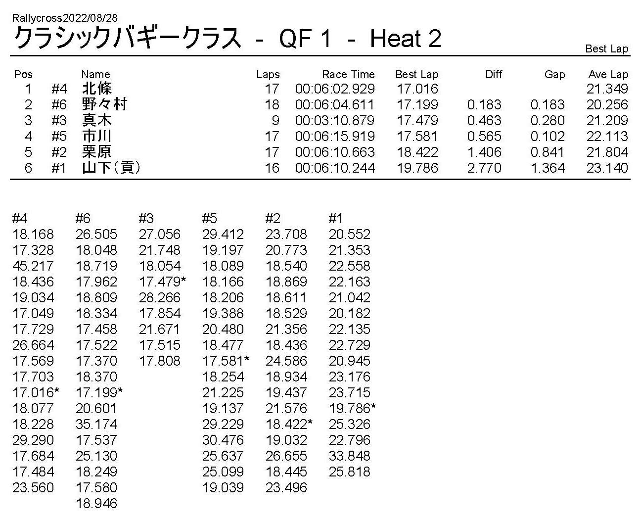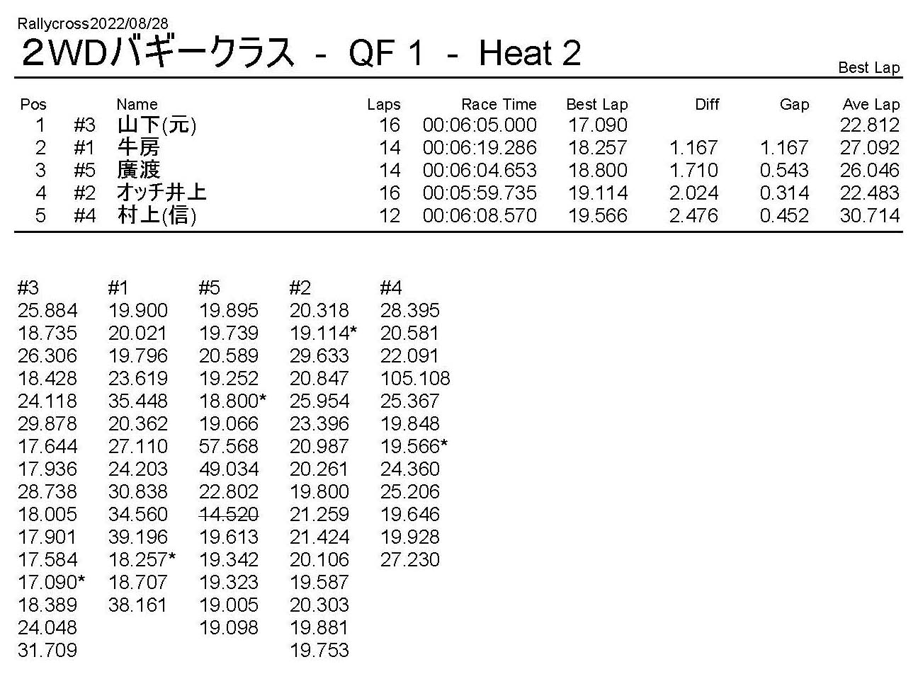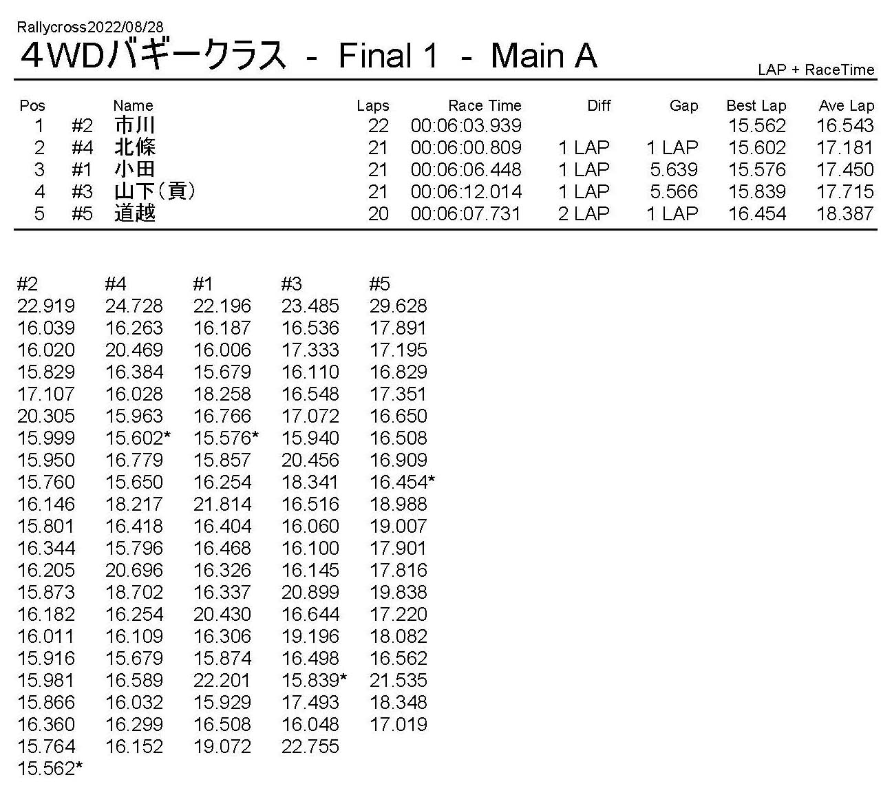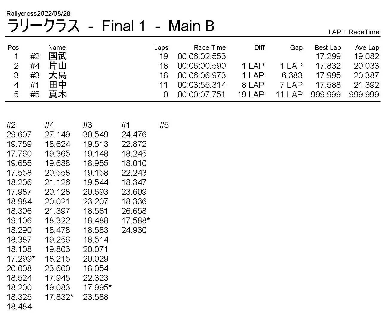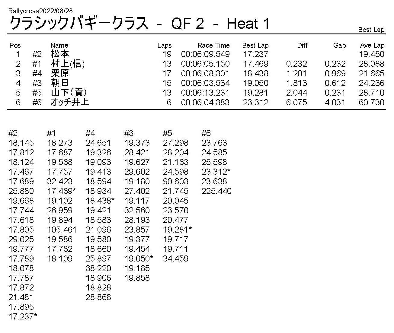 ラリークロスレース結果&動画 2022/8/28 公開日:2022年8月29日 レース結果 ラリークラス ラリークラスDメイン ラリークラスCメイン ラリークラスBメイン ラリークラスAメイン 2WDバギークラス 2WDバギークラスCメイン 2WDバギークラスBメイン 2WDバギークラスAメイン 4WDバギークラス 4WDバギークラスCメイン 4WDバギークラスBメイン 4WDバギークラスAメイン クラシックバギークラス クラシックバギークラスBメイン クラシックバギークラスAメイン おまけ(予選リザルト) ラリークラス 2WDクラス 4WDクラス クラシックバギークラス 関連記事 6月の月例レース結果・動画 2020/6/79月・月例レース結果&動画ラリークロスレース結果&動画 2023/4/23月例レース結果・動画 2025/01/13ラリークロスレース結果&動画 2022/1/3ラリークロスレースリザルト 投稿ナビゲーション 8月・月例レース結果&動画9月・月例レース結果&動画