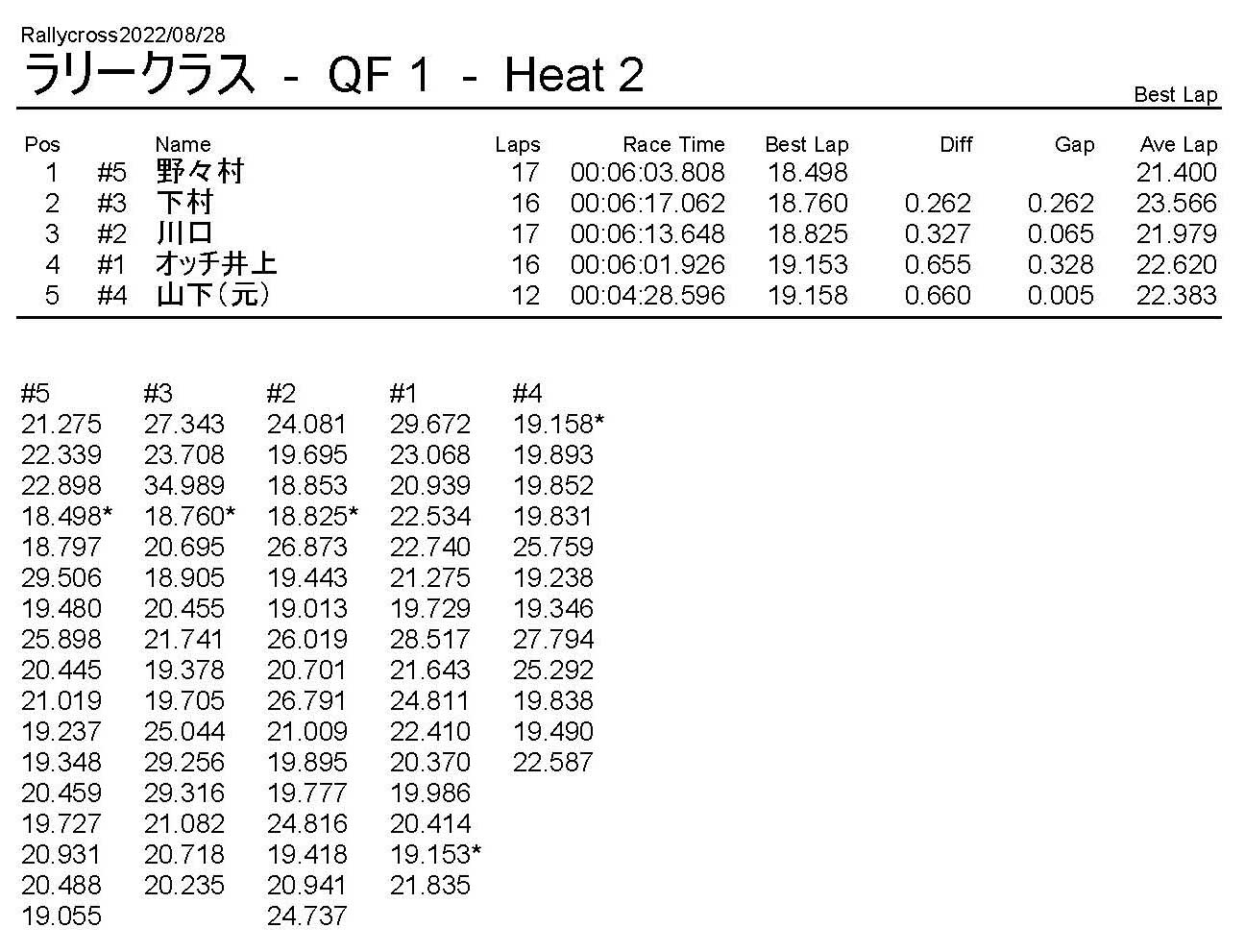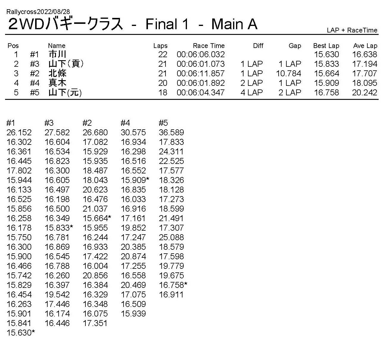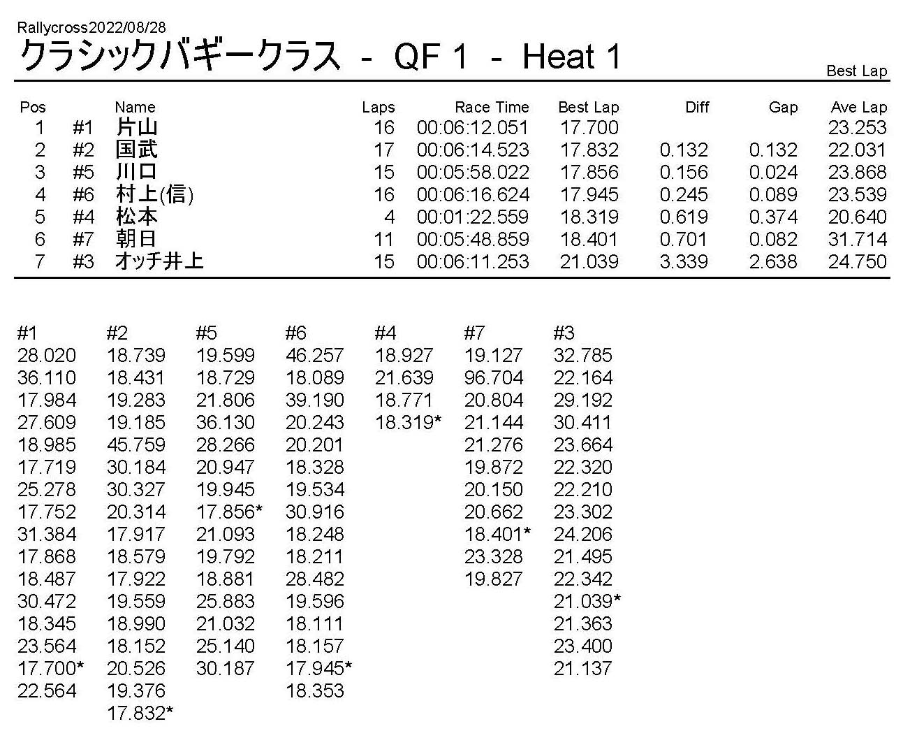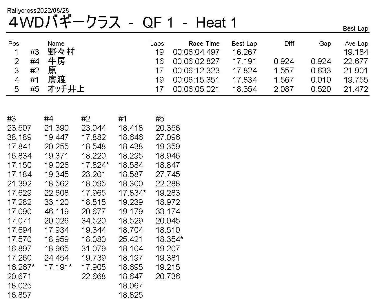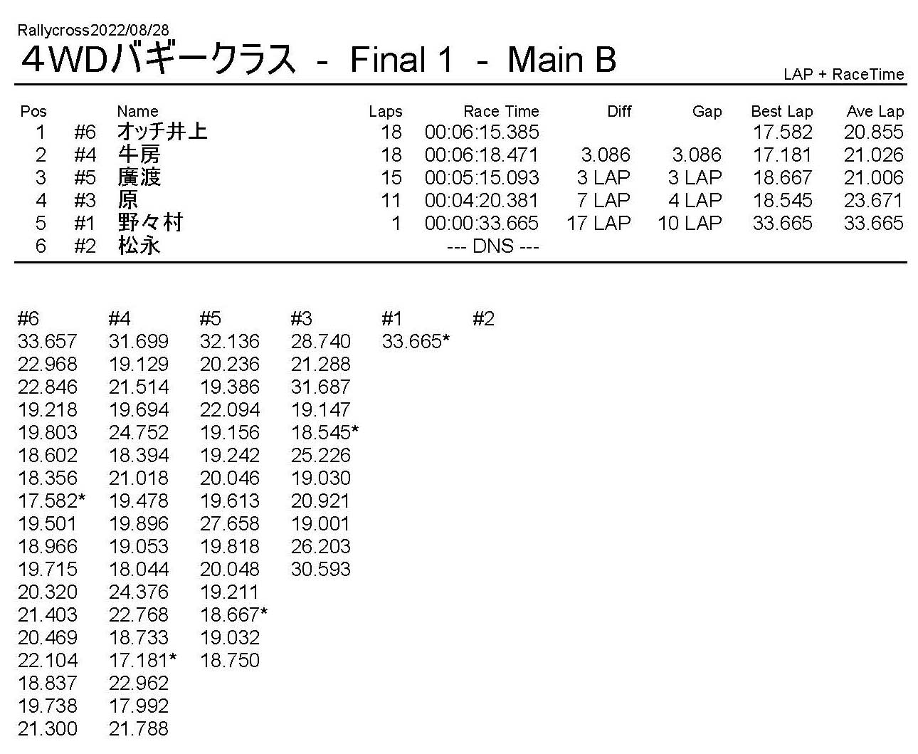 ラリークロスレース結果&動画 2022/8/28 公開日:2022年8月29日 レース結果 ラリークラス ラリークラスDメイン ラリークラスCメイン ラリークラスBメイン ラリークラスAメイン 2WDバギークラス 2WDバギークラスCメイン 2WDバギークラスBメイン 2WDバギークラスAメイン 4WDバギークラス 4WDバギークラスCメイン 4WDバギークラスBメイン 4WDバギークラスAメイン クラシックバギークラス クラシックバギークラスBメイン クラシックバギークラスAメイン おまけ(予選リザルト) ラリークラス 2WDクラス 4WDクラス クラシックバギークラス 関連記事 6月の月例レース結果・動画 2020/6/79月・月例レース結果&動画ラリークロスレース結果&動画 2023/4/23月例レース結果・動画 2025/01/13ラリークロスレース結果&動画 2022/1/3ラリークロスレースリザルト 投稿ナビゲーション 8月・月例レース結果&動画9月・月例レース結果&動画