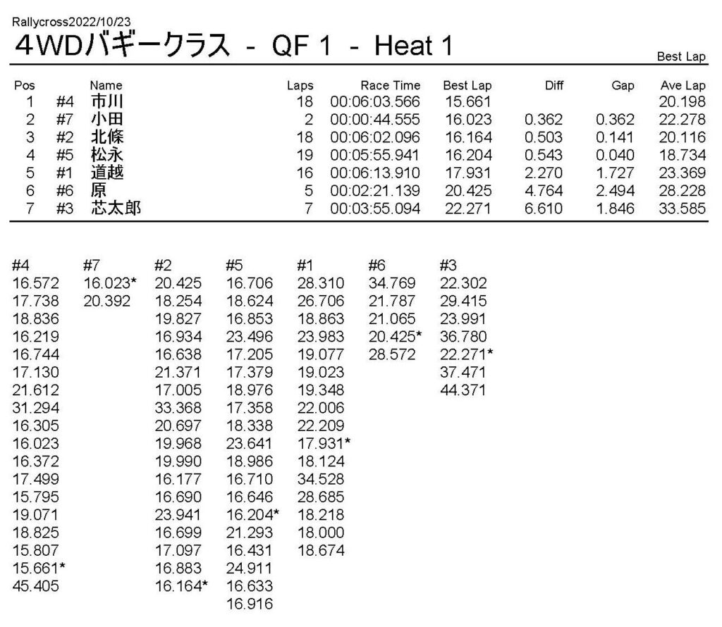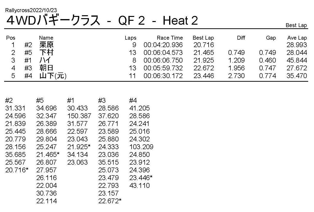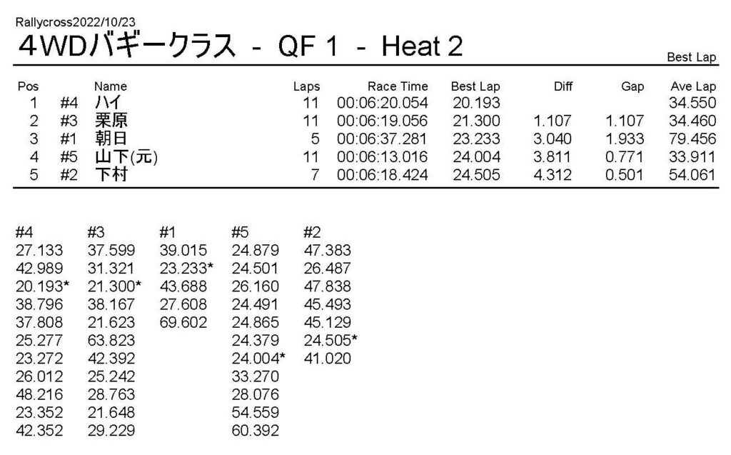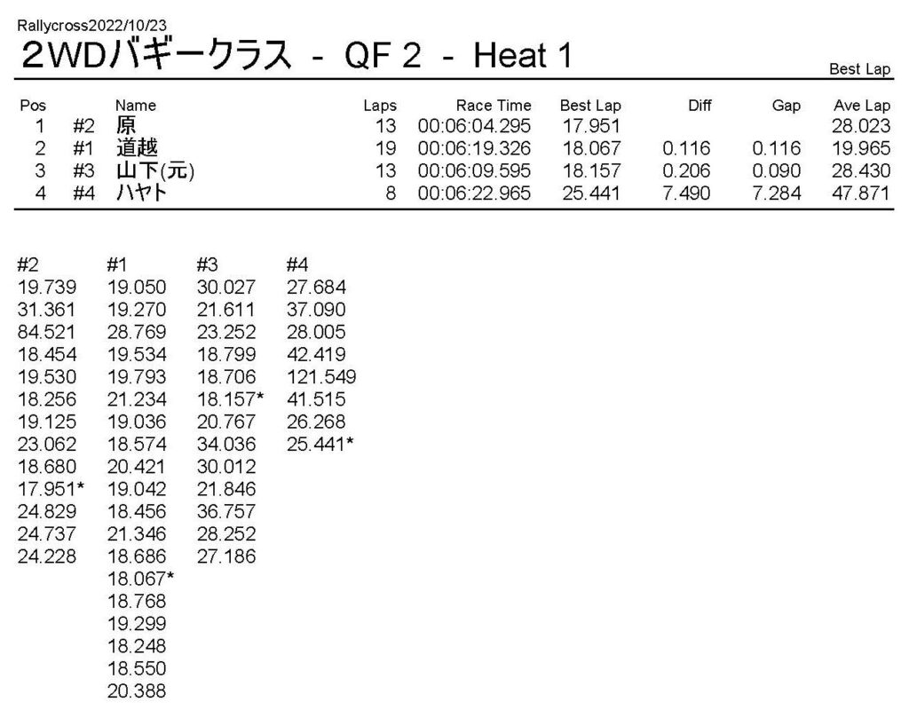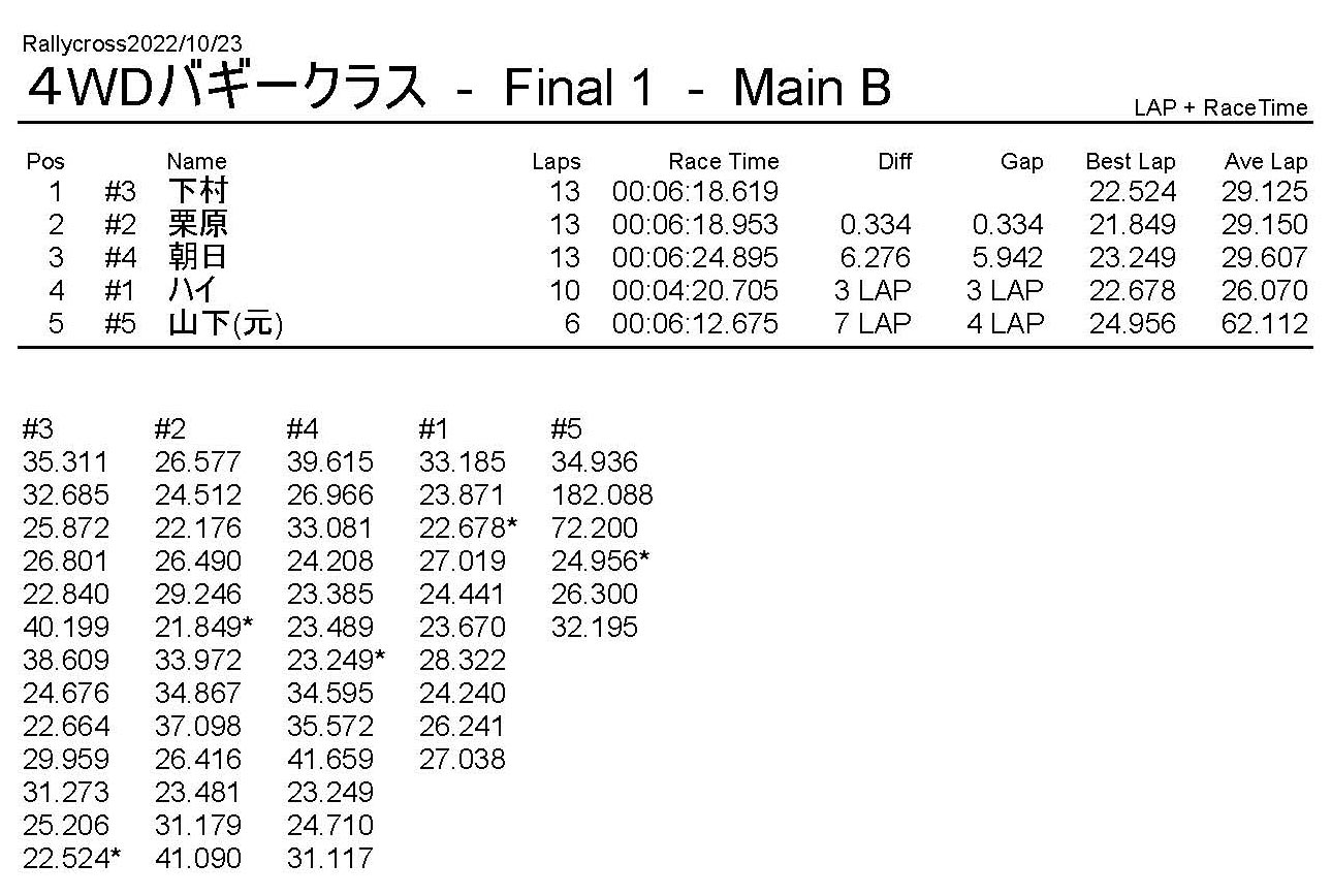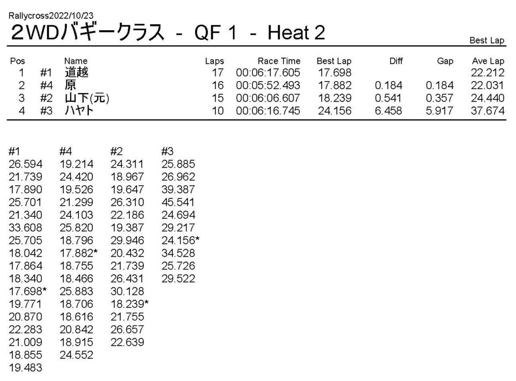 ラリークロスレース結果&動画 2022/10/23 公開日:2022年10月23日 レース結果 ラリークラス ラリークラスCメイン ラリークラスBメイン 撮影機材不調により動画はありません。 ラリークラスAメイン 2WDバギークラス 2WDバギークラスBメイン 2WDバギークラスAメイン 4WDバギークラス 4WDバギークラスBメイン 4WDバギークラスAメイン クラシックバギークラス クラシックバギークラスAメイン おまけ(予選リザルト) ラリークラス 2WDクラス 4WDクラス クラシックバギークラス 関連記事 ラリークロスレース結果&動画 2022/6/26ラリークロスレース結果&動画 2021/10/24ラリークロスレース結果&動画 2022/1/36月・月例レース結果・動画4月・月例レース結果・動画6月の月例レース結果・動画 2020/6/7 投稿ナビゲーション 10月・月例レース結果&動画11月・月例レース結果&動画