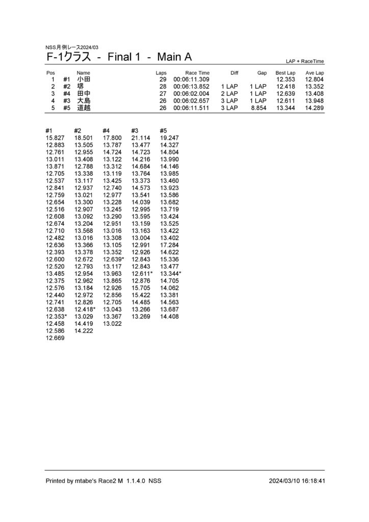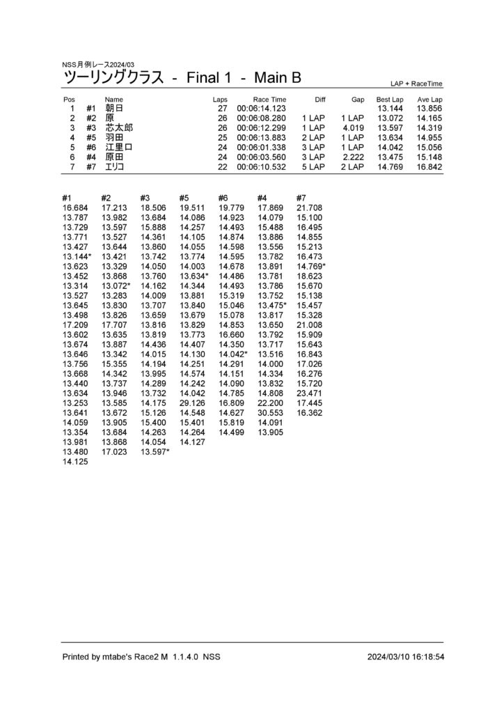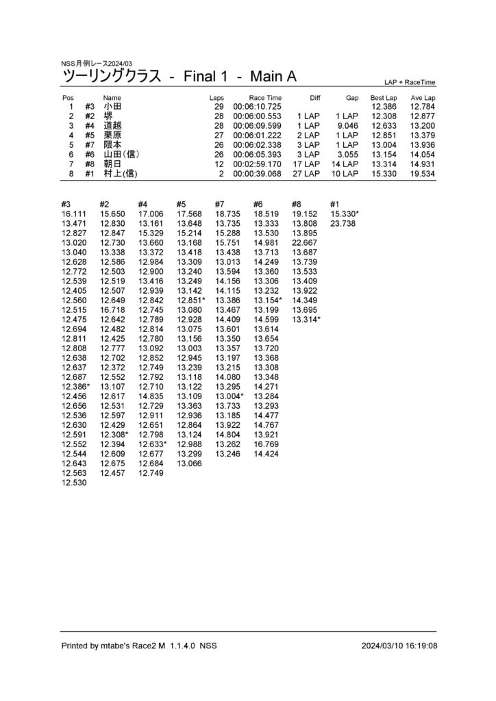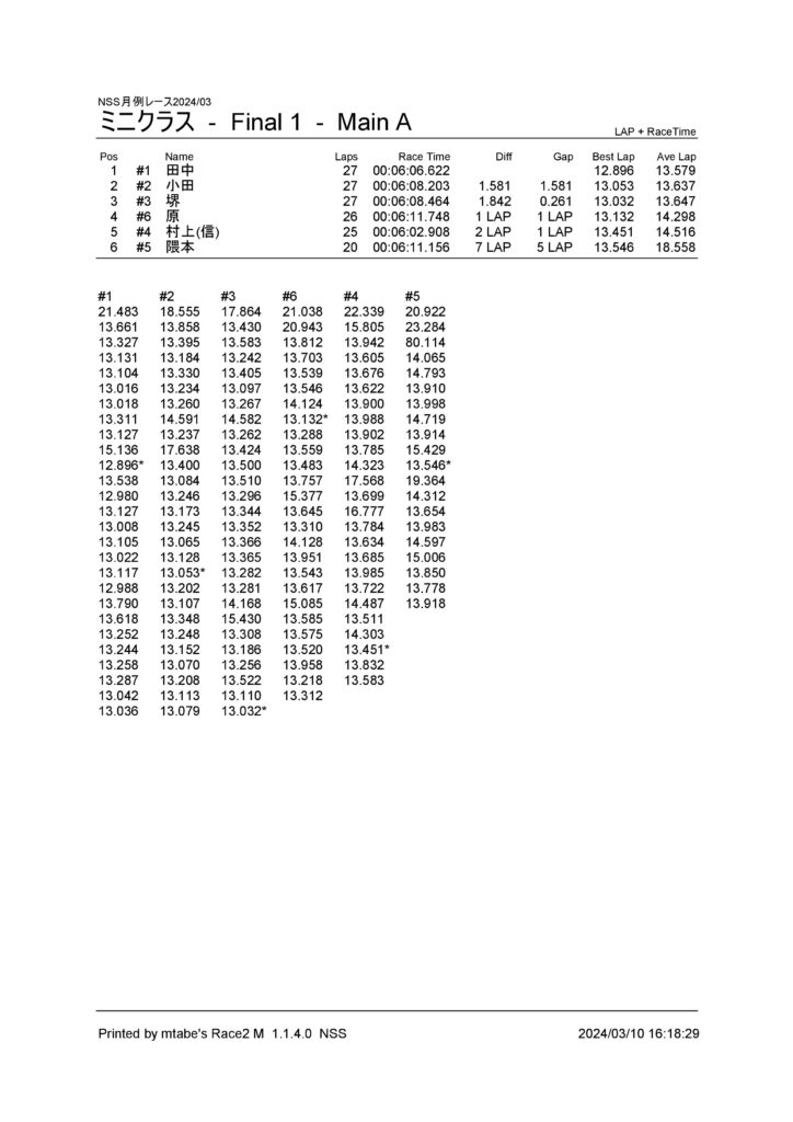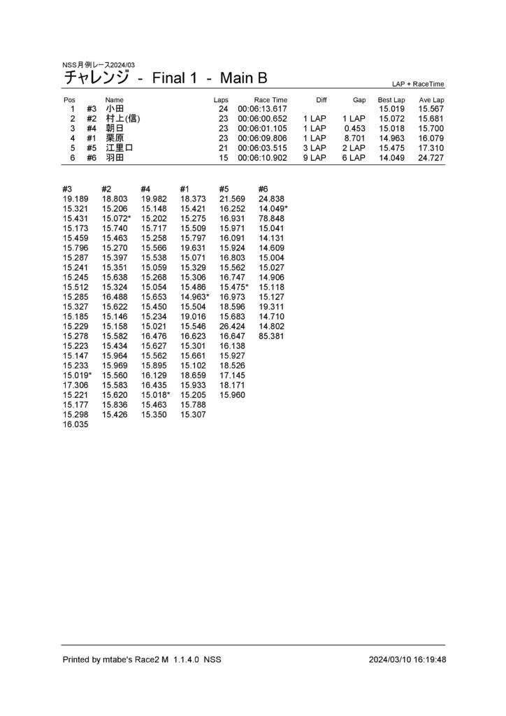 3月・月例レース結果 更新日:2024年3月11日 公開日:2024年3月10日 レース結果 ミニクラス ミニクラスBメイン ミニクラスAメイン F-1クラスAメイン F-1クラスAメイン ツーリングクラス ツーリングクラスBメイン 動画はありません。 ツーリングクラスAメイン フォーミュラEクラス フォーミュラEクラスAメイン チャレンジクラス チャレンジクラスBメイン チャレンジクラスAメイン 関連記事 ラリークロスレース結果&動画 2023/4/23ラリークロス結果・動画11月・月例レース結果&動画11月の月例レースの結果ラリークロスレース結果&動画 2022/10/235月・月例レース結果&動画 投稿ナビゲーション ラリークロス結果&動画-2024-02-25月例レース結果 ・動画 2024/04/14