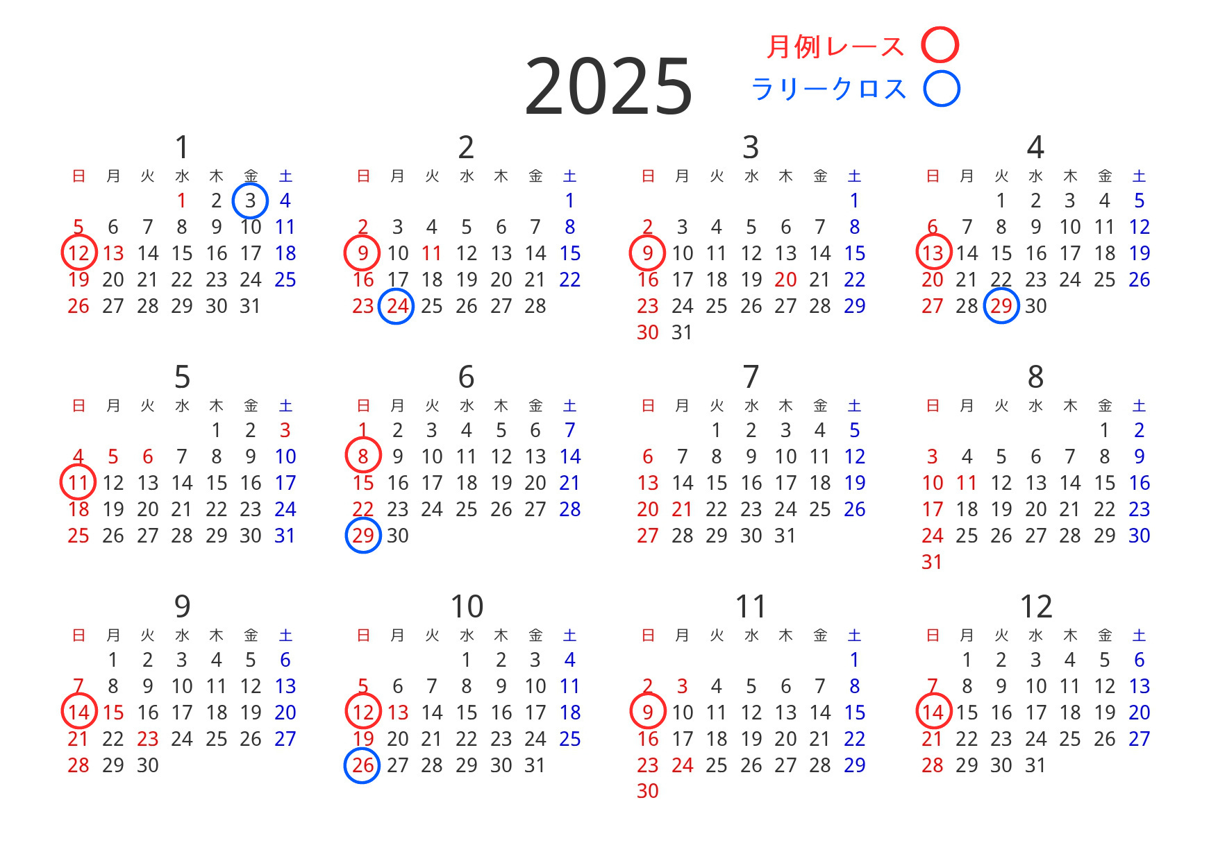 2025年のレーススケジュール 公開日:2024年11月30日 レース開催のお知らせ 2025年のレーススケジュールは次の通りです。 赤丸が月例レースの日で、青丸がラリークロスの日です。 2025年レースカレンダー 関連記事 フォーミュラ・Eクラスを新設します。レーススケジュール変更のお知らせ新春ラリークロスレース開催のお知らせ2022年下半期のレーススケジュールラリークロスは中止しましたNSSレース日程のお知らせ 投稿ナビゲーション 2024年のレーススケジュール