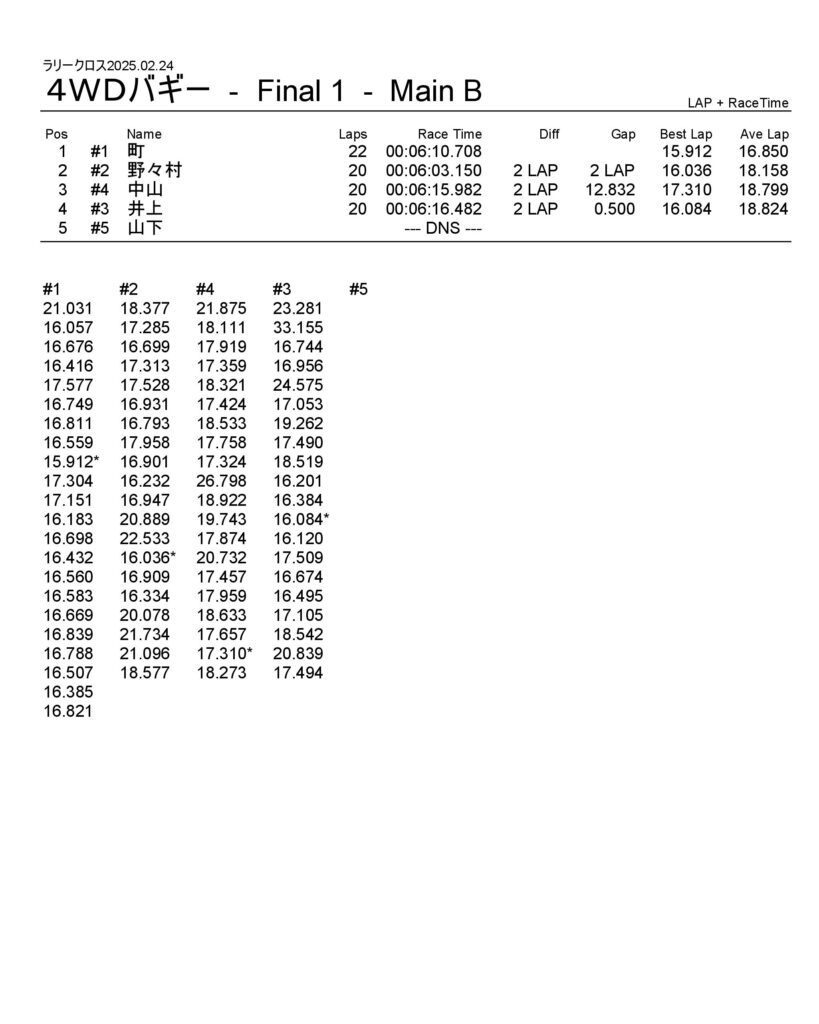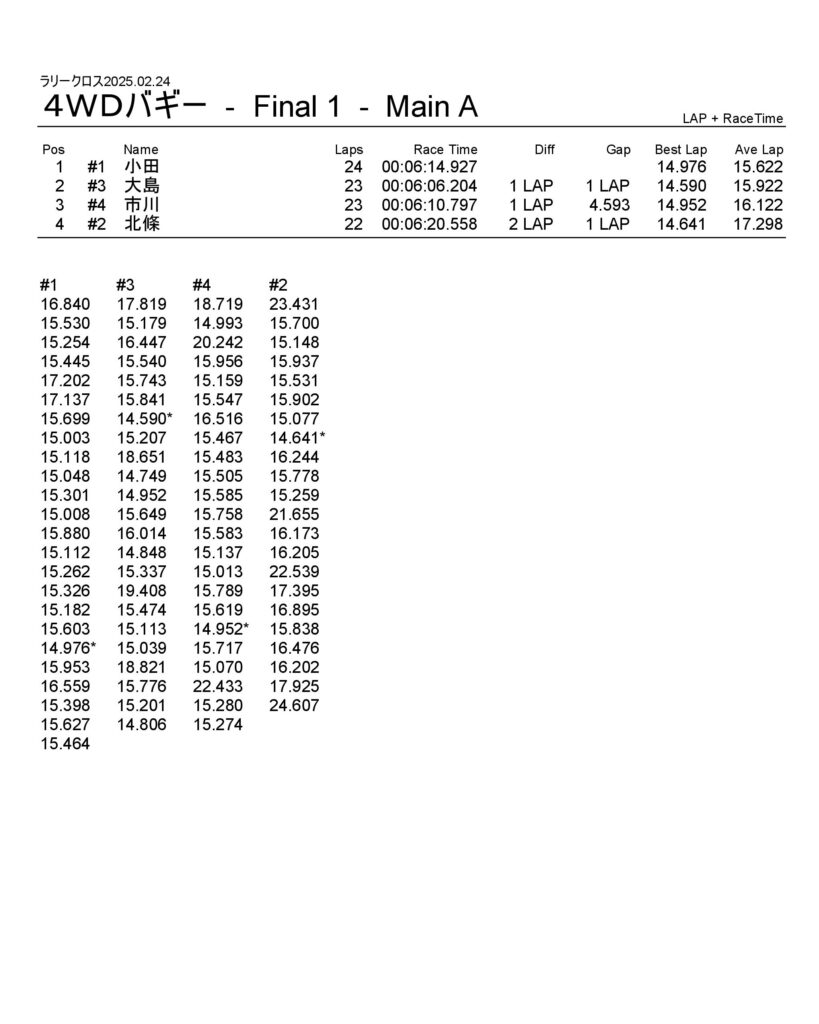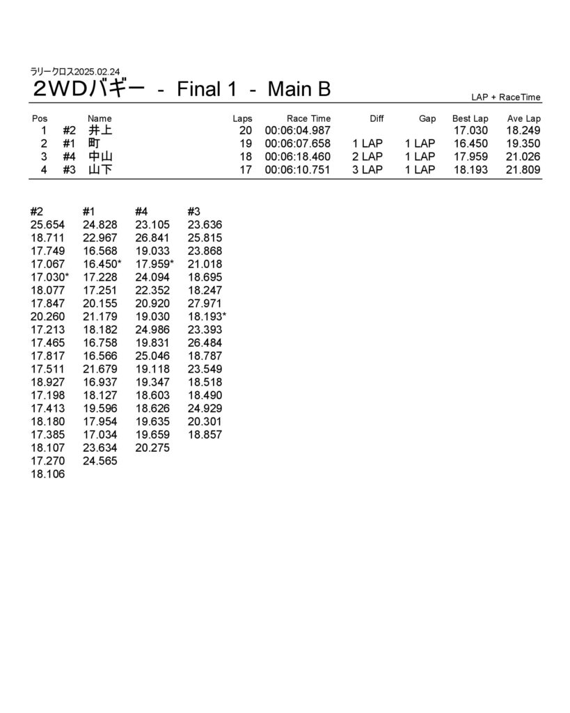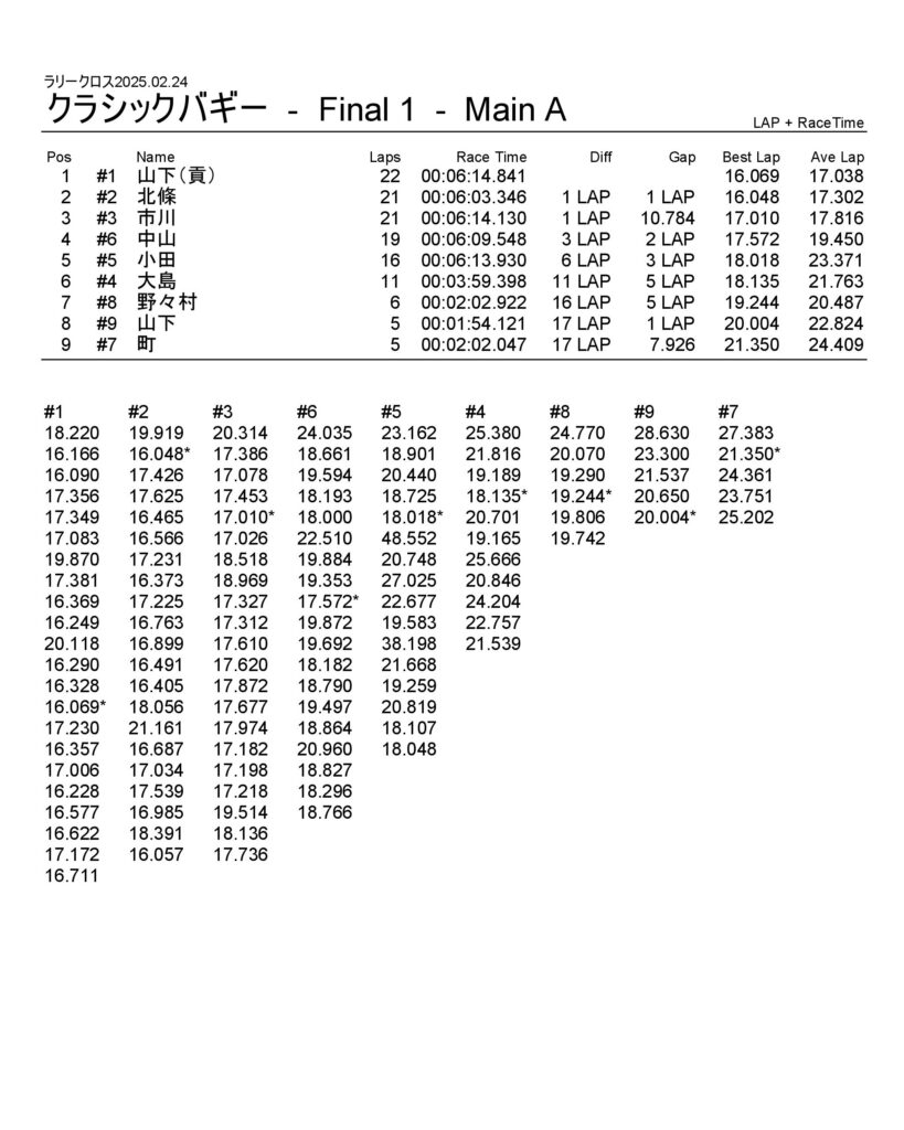 ラリークロス結果 2025.02.24 公開日:2025年2月26日 レース結果 ラリークラス ラリークラスAメイン ラリークラスBメイン 2WDバギークラス 2WDバギークラスAメイン 2WDバギークラスBメイン 動画はありません。 4WDバギークラス 4WDバギークラスAメイン 4WDバギークラスBメイン クラシックバギークラス クラシックバギークラスAメイン コミカルトラッククラス コミカルトラッククラスAメイン 動画は後半3分間のみ。 関連記事 ラリークロスを延期したのに、晴れたので模擬レース・結果月例レース結果・動画 2024/10/06ラリークロスレース結果&動画-2023-8-27ラリークロスレース結果&動画2021/19月の月例レース結果&動画11月の月例レースの結果 投稿ナビゲーション 月例レース結果・動画 2025/02/09月例レース結果・動画 2025/03/09