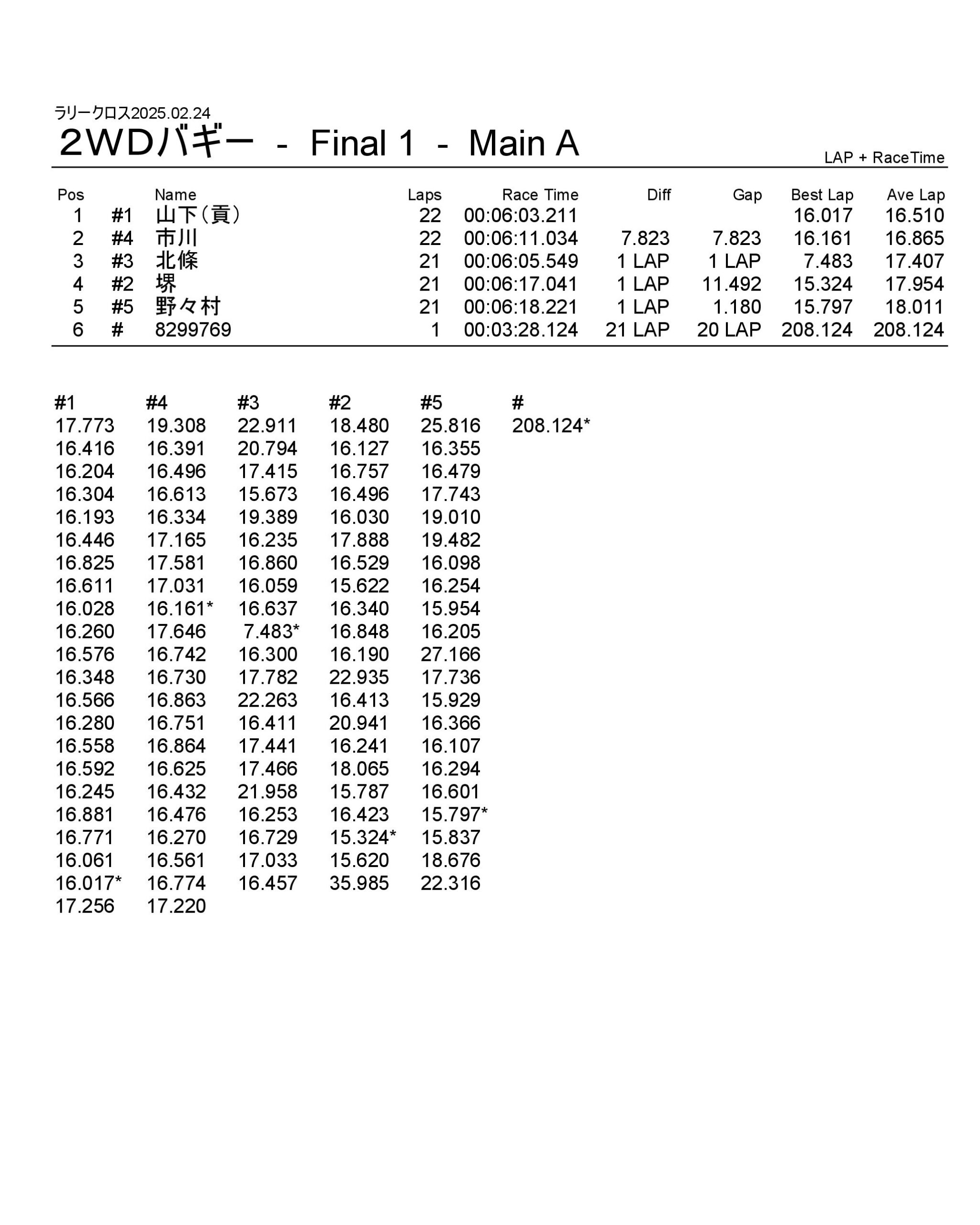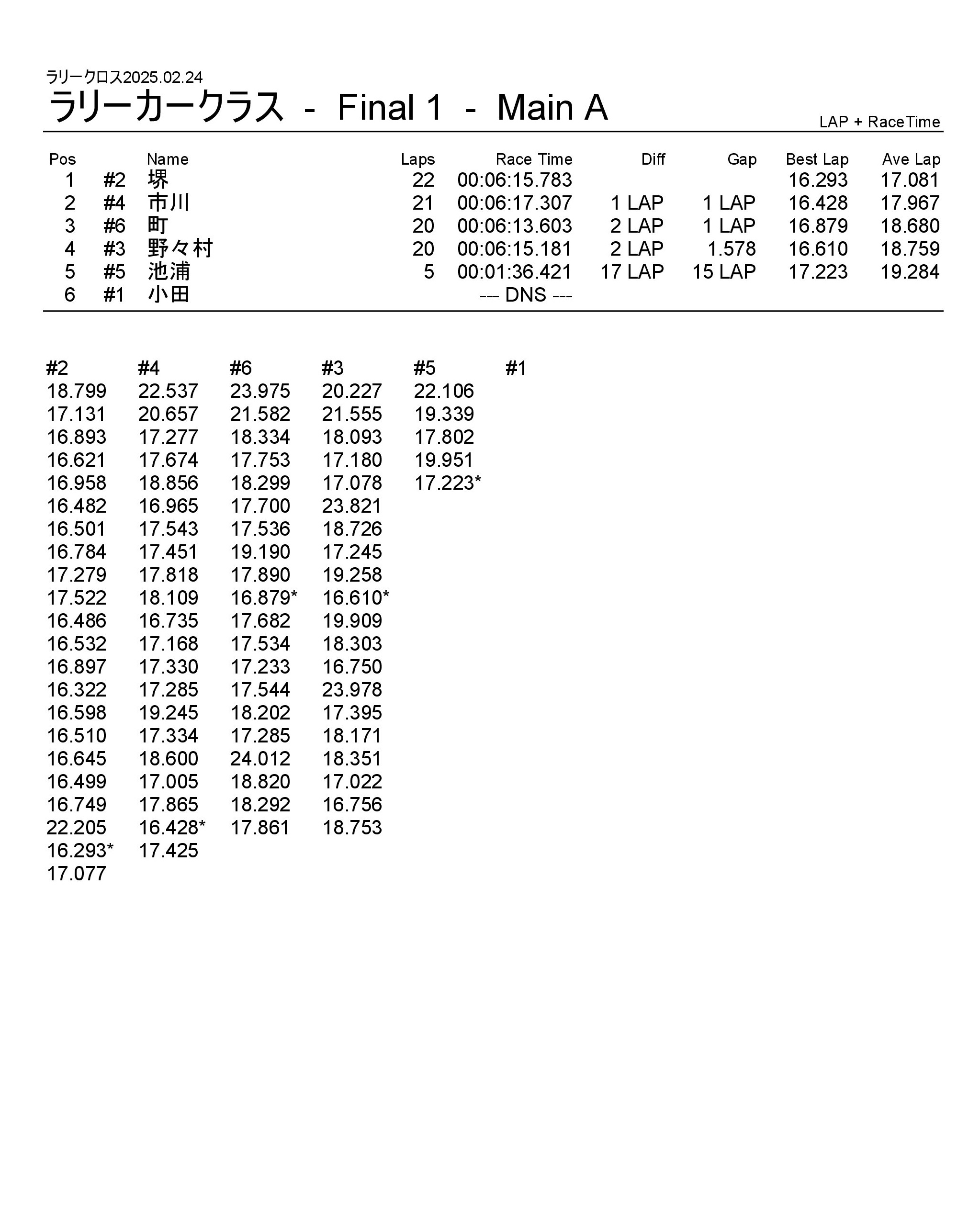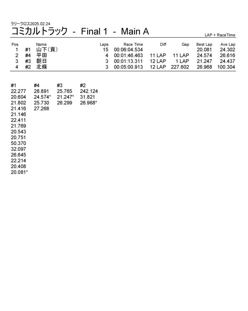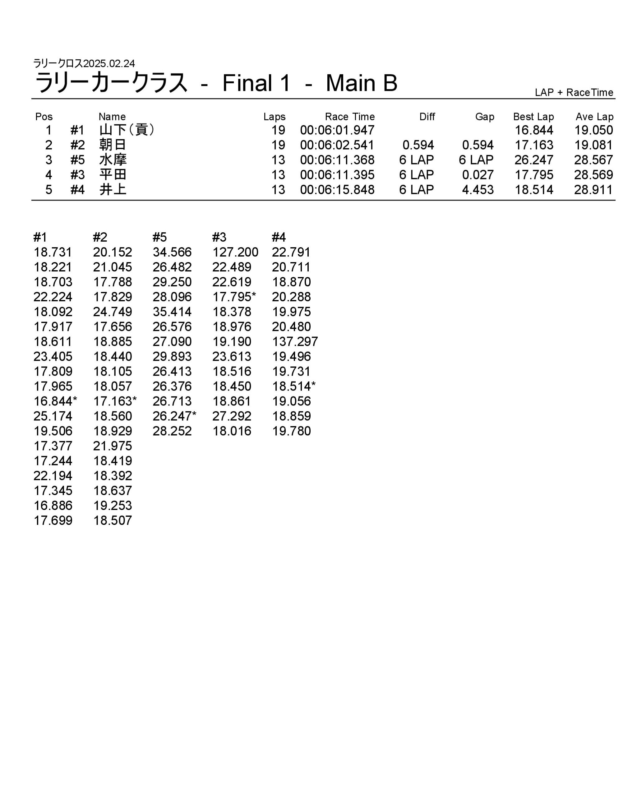 ラリークロス結果 2025.02.24 公開日:2025年2月26日 レース結果 ラリークラス ラリークラスAメイン ラリークラスBメイン 2WDバギークラス 2WDバギークラスAメイン 2WDバギークラスBメイン 動画はありません。 4WDバギークラス 4WDバギークラスAメイン 4WDバギークラスBメイン クラシックバギークラス クラシックバギークラスAメイン コミカルトラッククラス コミカルトラッククラスAメイン 動画は後半3分間のみ。 関連記事 ラリークロスを延期したのに、晴れたので模擬レース・結果月例レース結果・動画 2024/10/06ラリークロスレース結果&動画-2023-8-27ラリークロスレース結果&動画2021/19月の月例レース結果&動画11月の月例レースの結果 投稿ナビゲーション 月例レース結果・動画 2025/02/09月例レース結果・動画 2025/03/09