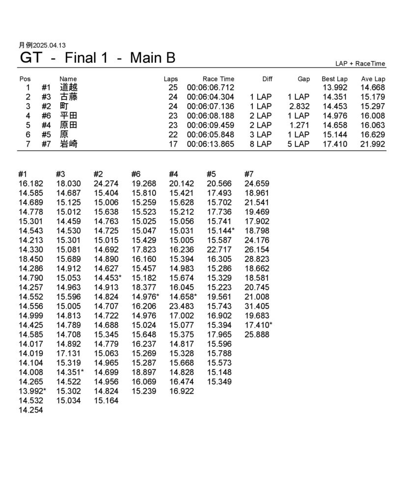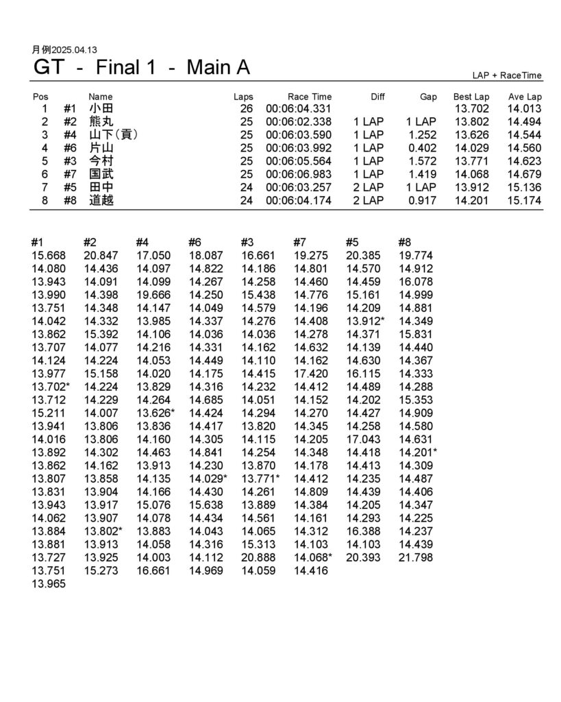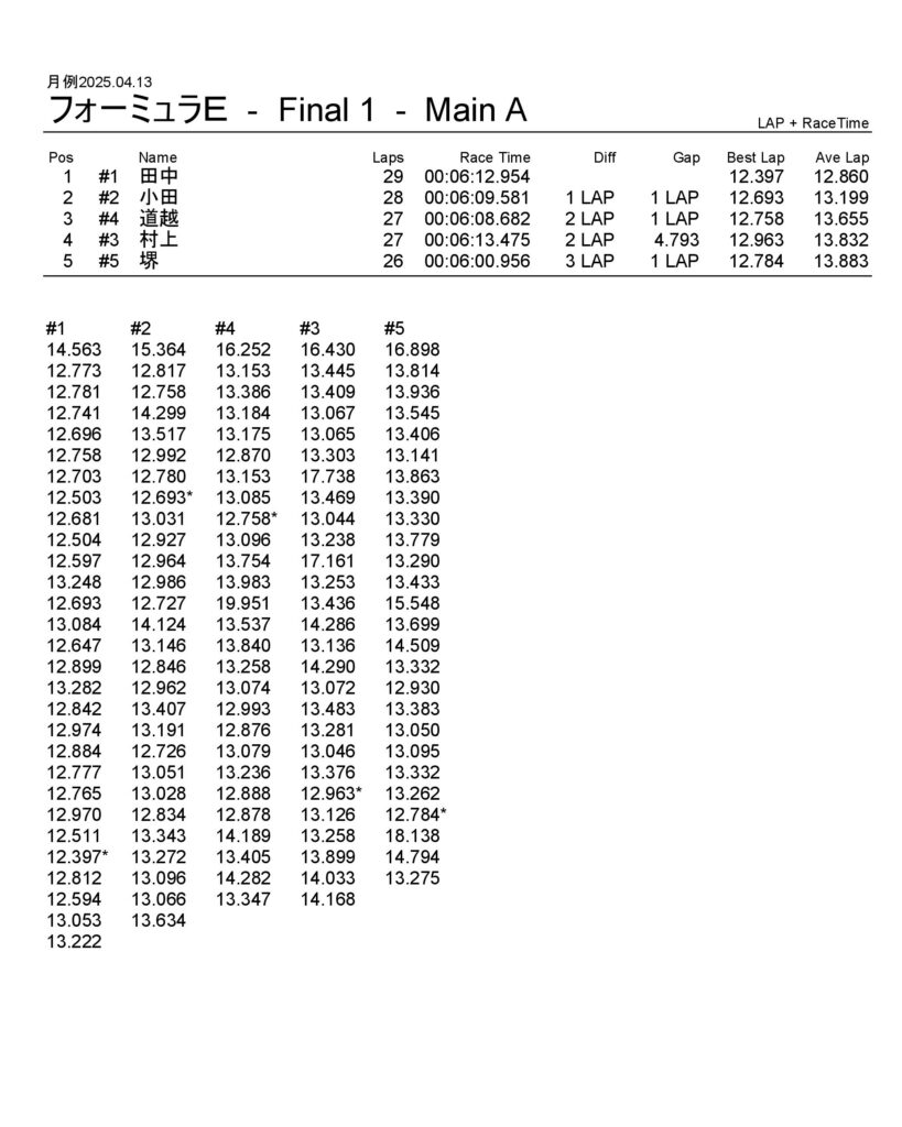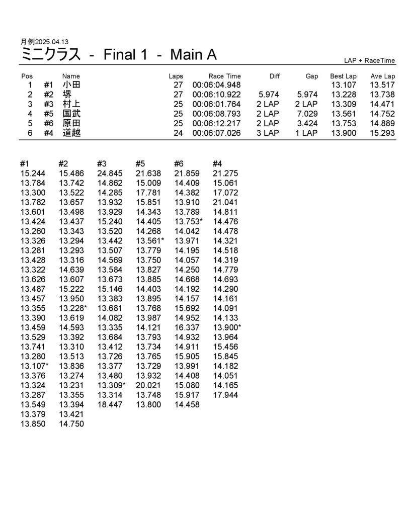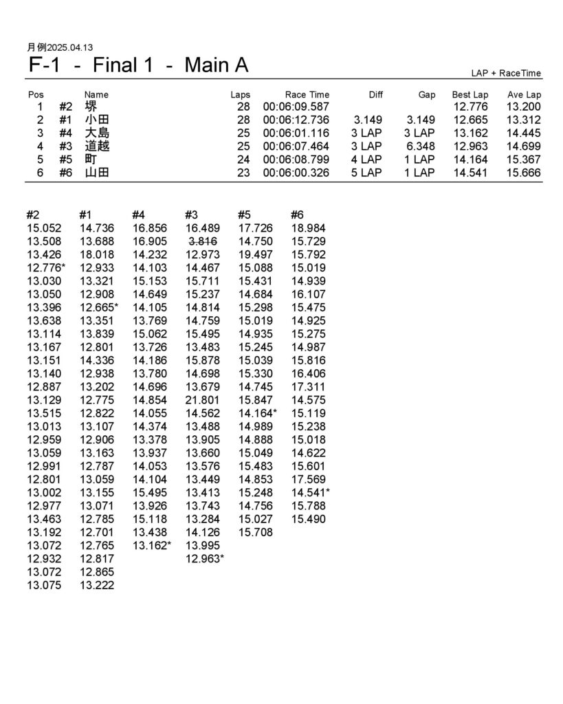 月例レース結果・動画 2025/04/13 公開日:2025年4月14日 レース結果 ミニクラス ミニクラスBメイン ミニクラスAメイン F-1クラスAメイン F-1クラスAメイン GTクラス GTクラスBメイン GTクラスAメイン ツーリングクラス ツーリングクラスBメイン ツーリングクラスAメイン フォーミュラEクラス フォーミュラEクラスAメイン チャレンジクラス チャレンジクラスAメイン 関連記事 4月・月例レース結果・動画ラリークロス結果&動画-2024-11-24ラリークロス結果・動画2月・月例レース結果8月の月例レース結果&動画10月・月例レース結果 投稿ナビゲーション 月例レース結果・動画 2025/03/09ラリークロス結果 2025.04.29
