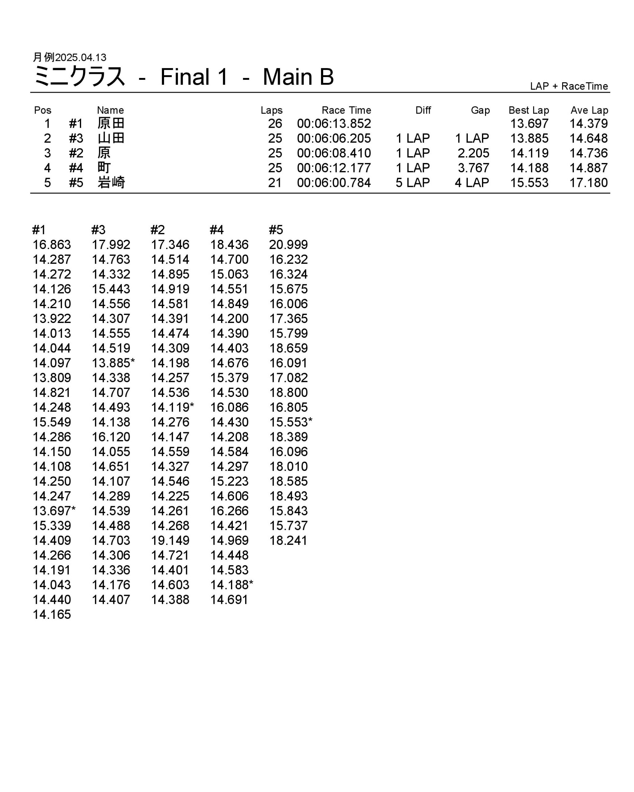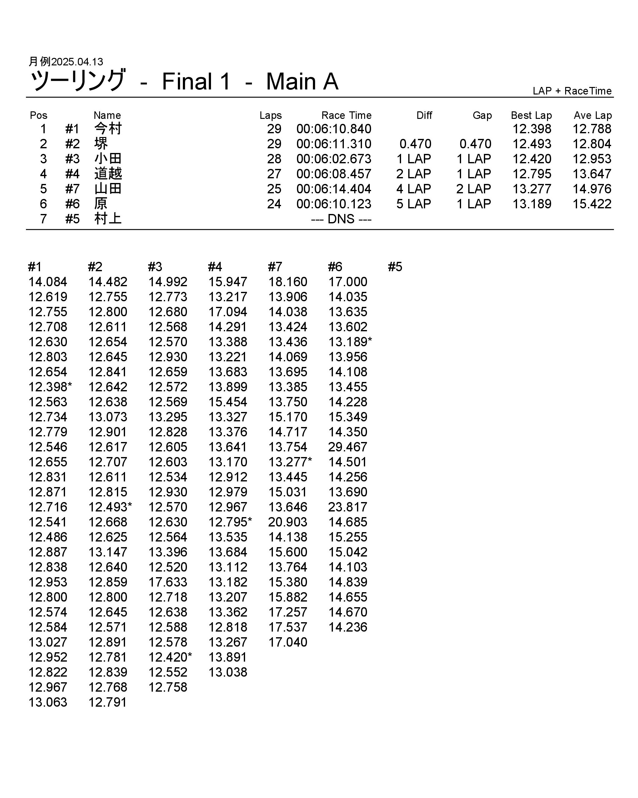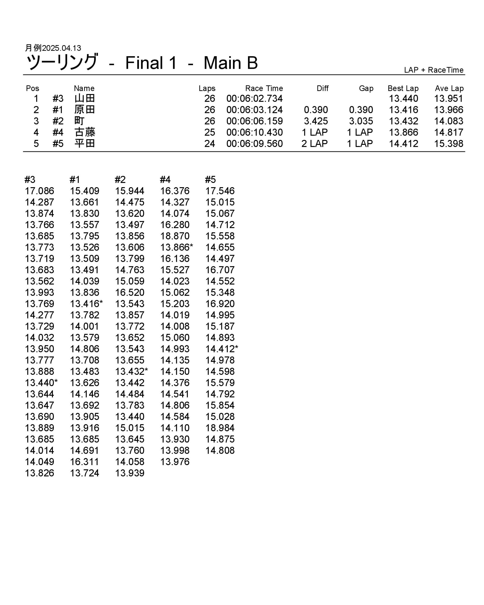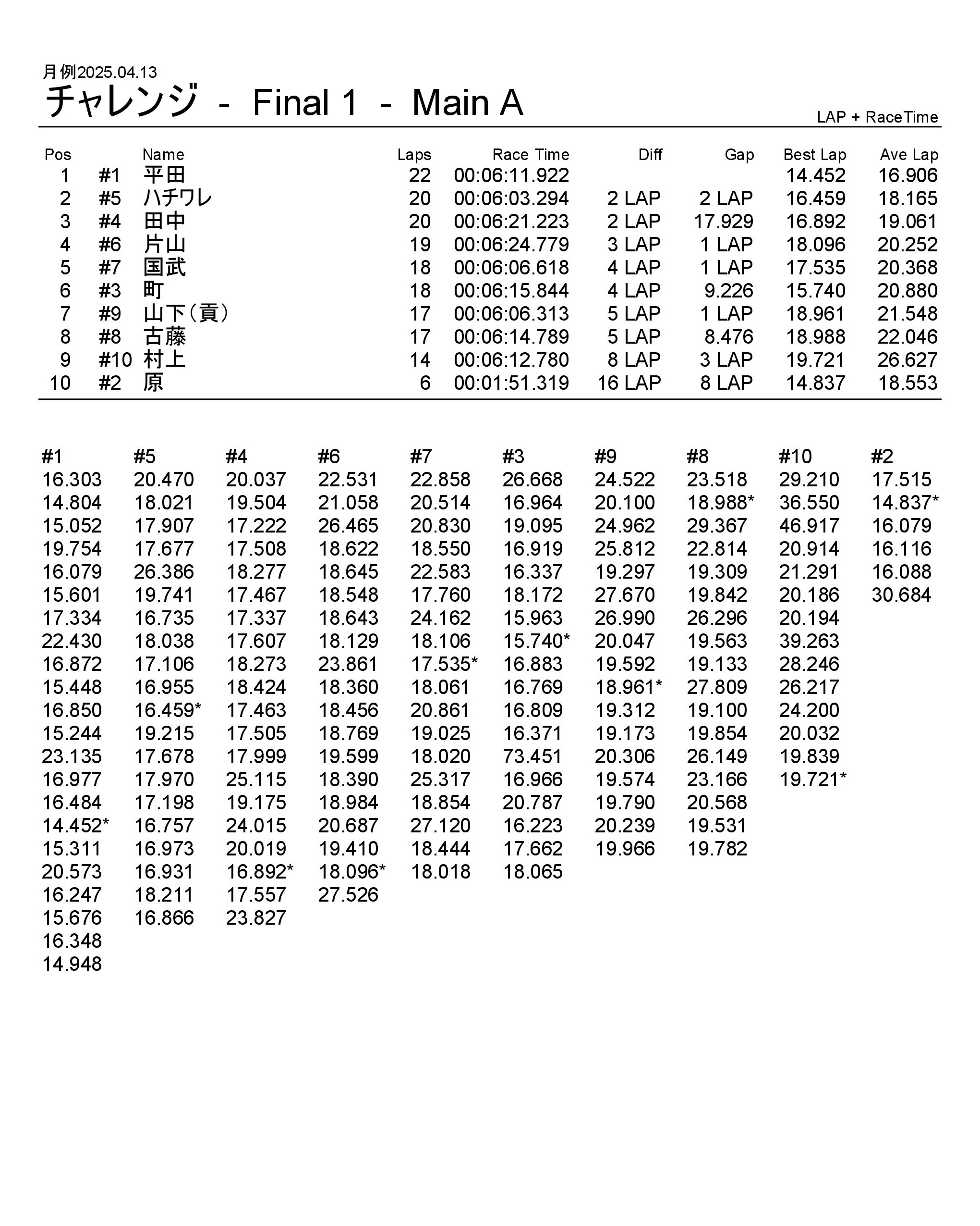 月例レース結果・動画 2025/04/13 公開日:2025年4月14日 レース結果 ミニクラス ミニクラスBメイン ミニクラスAメイン F-1クラスAメイン F-1クラスAメイン GTクラス GTクラスBメイン GTクラスAメイン ツーリングクラス ツーリングクラスBメイン ツーリングクラスAメイン フォーミュラEクラス フォーミュラEクラスAメイン チャレンジクラス チャレンジクラスAメイン 関連記事 4月・月例レース結果・動画ラリークロス結果&動画-2024-11-24ラリークロス結果・動画2月・月例レース結果8月の月例レース結果&動画10月・月例レース結果 投稿ナビゲーション 月例レース結果・動画 2025/03/09ラリークロス結果 2025.04.29