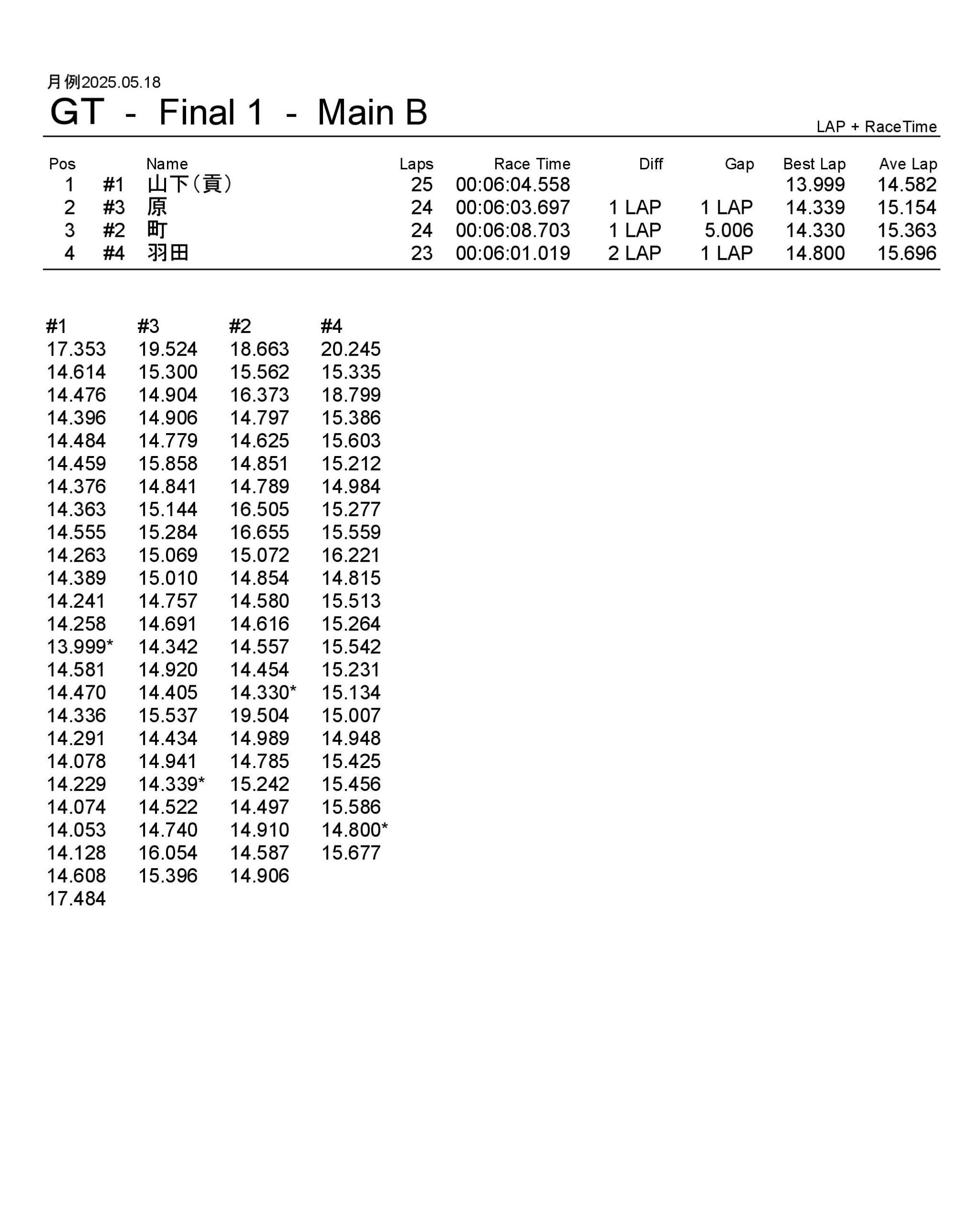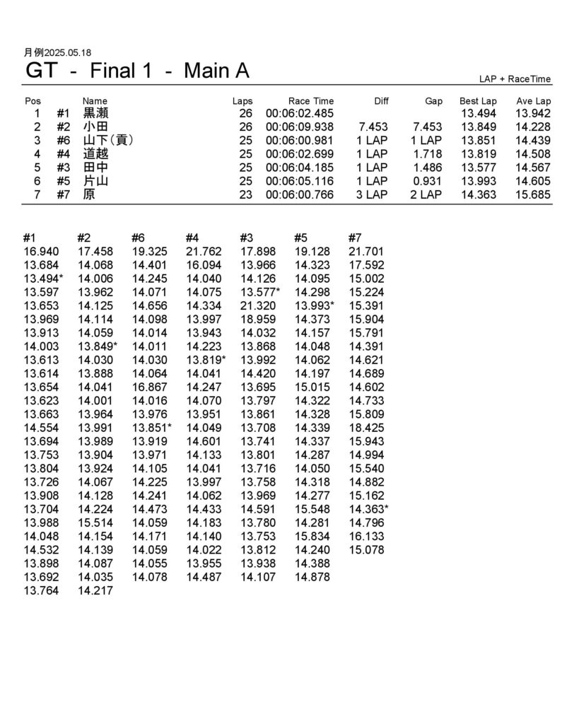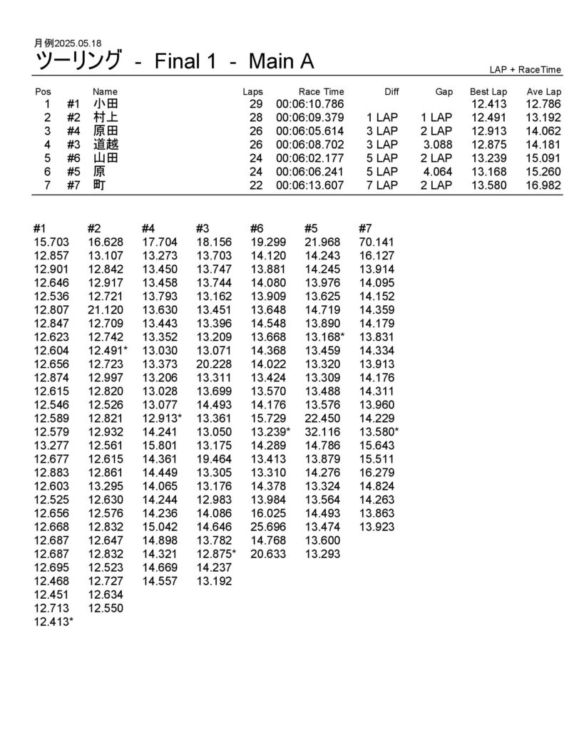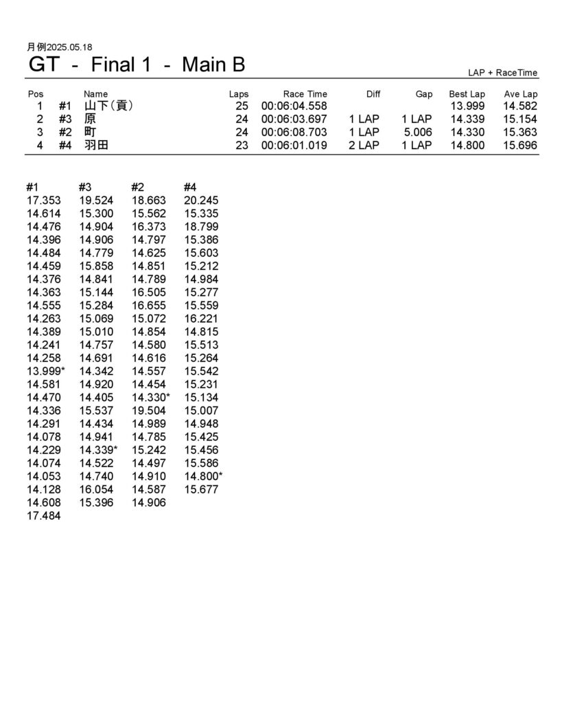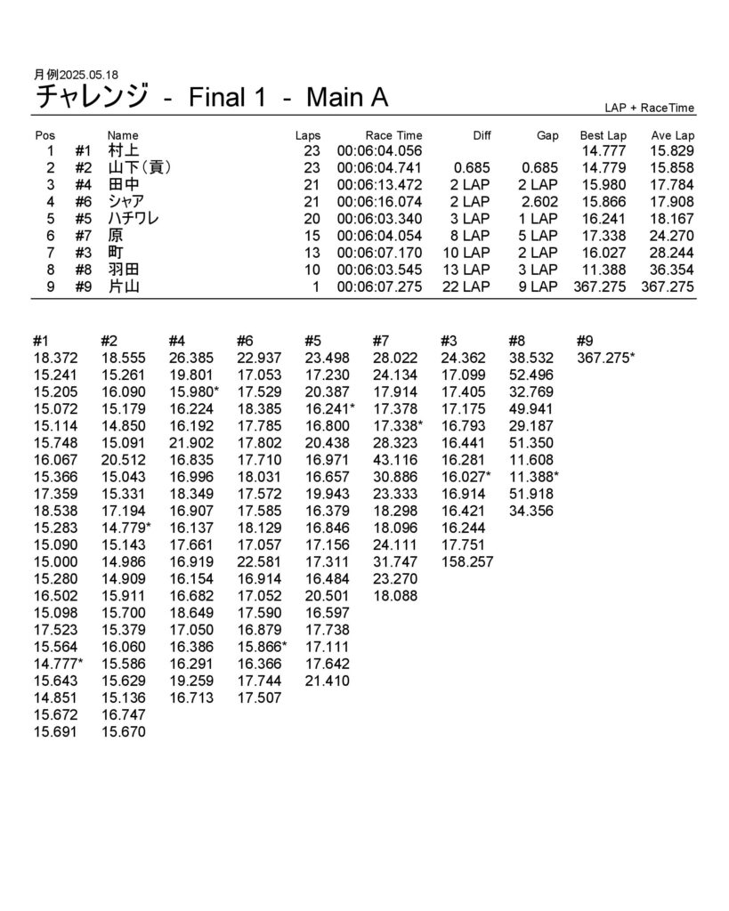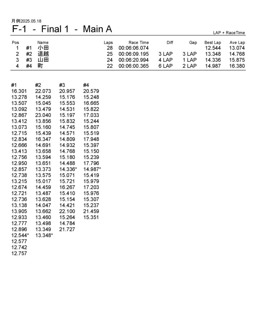 月例レース結果2025/05/18 公開日:2025年5月19日 レース結果 動画はYouTubeチャンネルにてどうぞ。 ミニクラス ミニクラスAメイン F-1クラスAメイン F-1クラスAメイン GTクラス GTクラスBメイン GTクラスAメイン ツーリングクラス ツーリングクラスAメイン フォーミュラEクラス フォーミュラEクラスAメイン チャレンジクラス チャレンジクラスAメイン 関連記事 ラリークロス結果&動画-2024-07-285月・月例レース結果&動画6月・月例レース結果・動画ラリークロスレース結果&動画 2021/8/2911月・月例レース結果&動画月例レース結果・動画 2025/02/09 投稿ナビゲーション ラリークロス結果 2025.04.29
