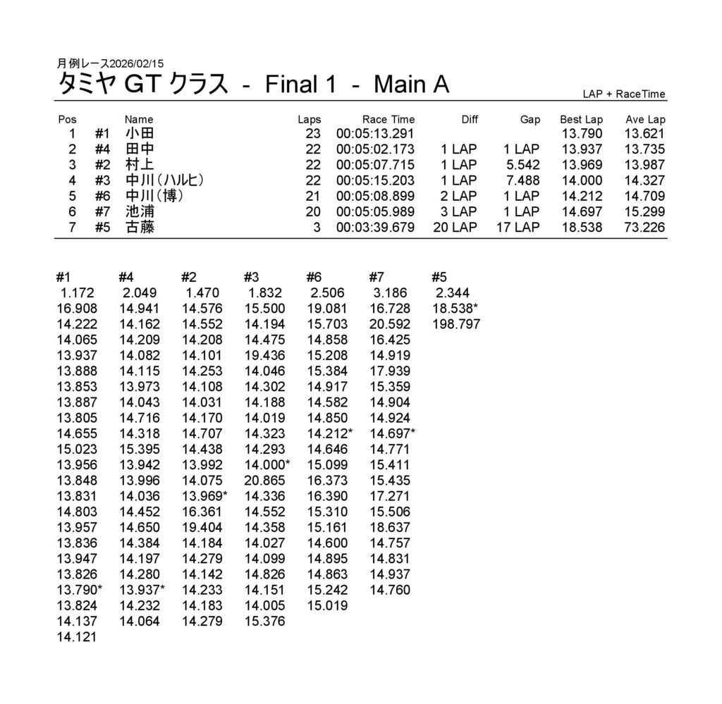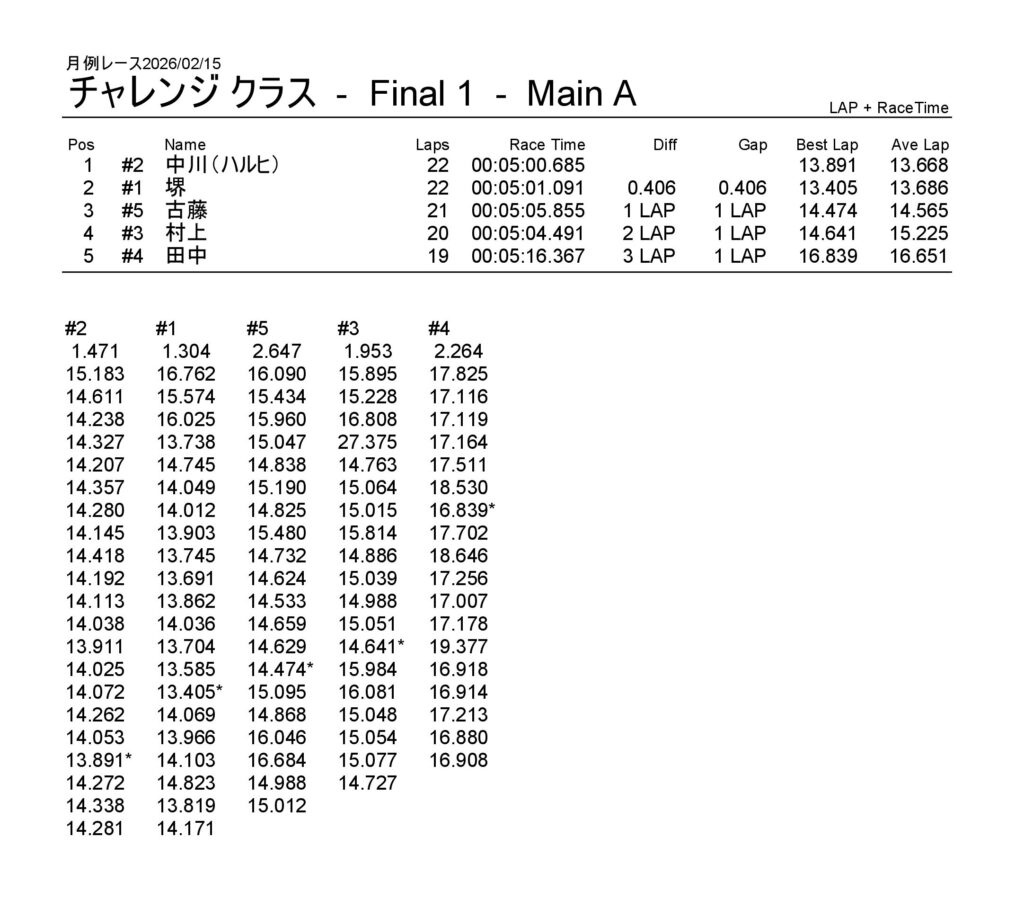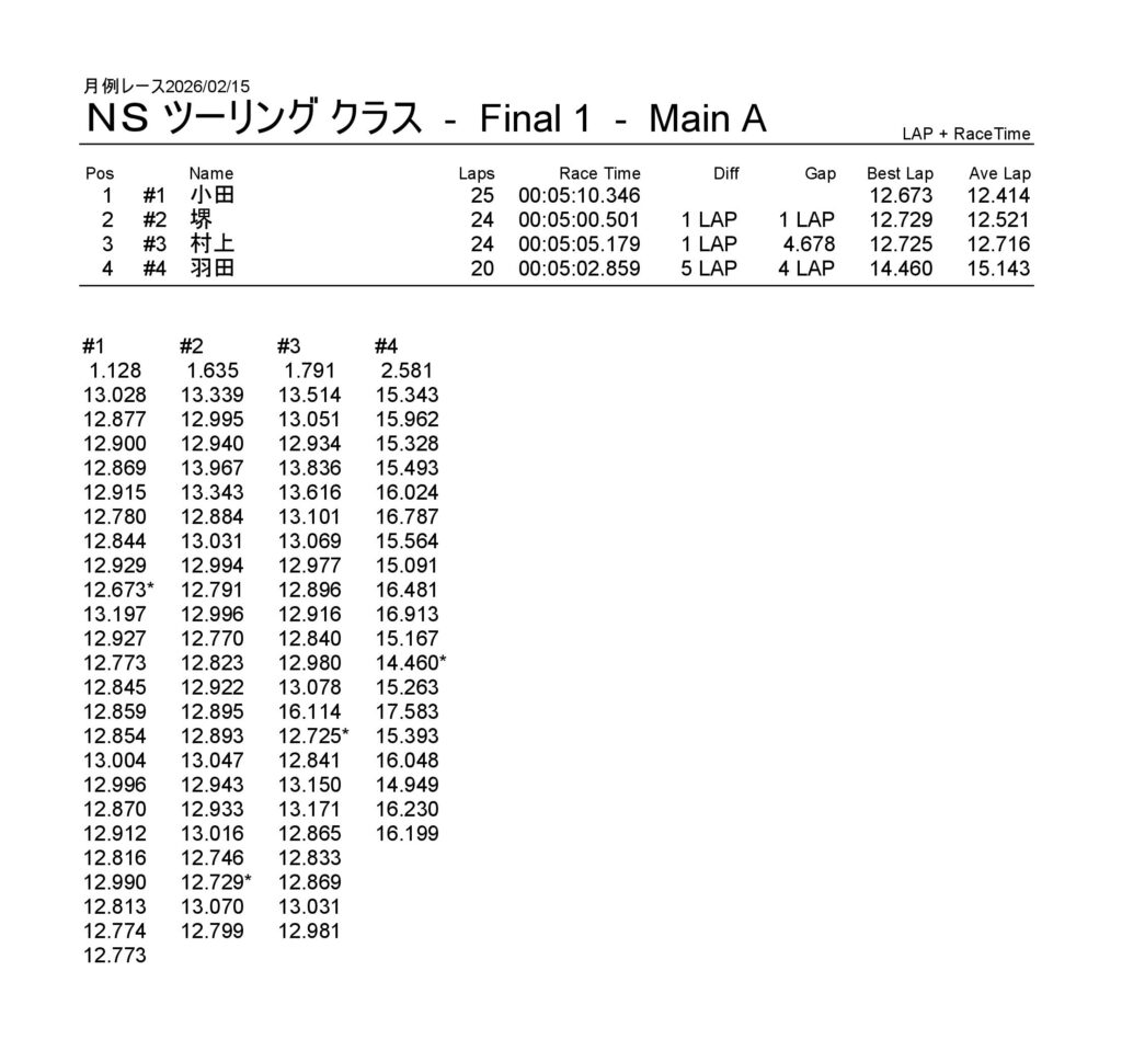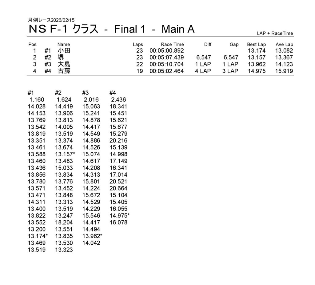 月例レース2026/02/15 公開日:2026年2月15日 レース結果 NSF-1クラス NSF-1クラスAメイン タミヤF1クラス タミヤF1クラスAメイン チャレンジクラス チャレンジクラスBメイン チャレンジクラスAメイン NSツーリングクラス NSツーリングクラスAメイン タミヤGTクラス タミヤGTクラスAメイン 関連記事 3月・月例レース結果&動画月例レース結果・動画 2025/01/1310月・月例レース結果&動画8月・月例レース結果&動画月例レース結果 ・動画 2024/04/14月例レース結果2025/05/18 投稿ナビゲーション NSS月例レース2026/1/3
