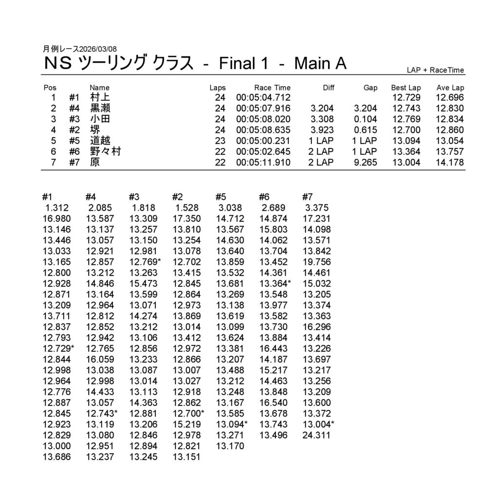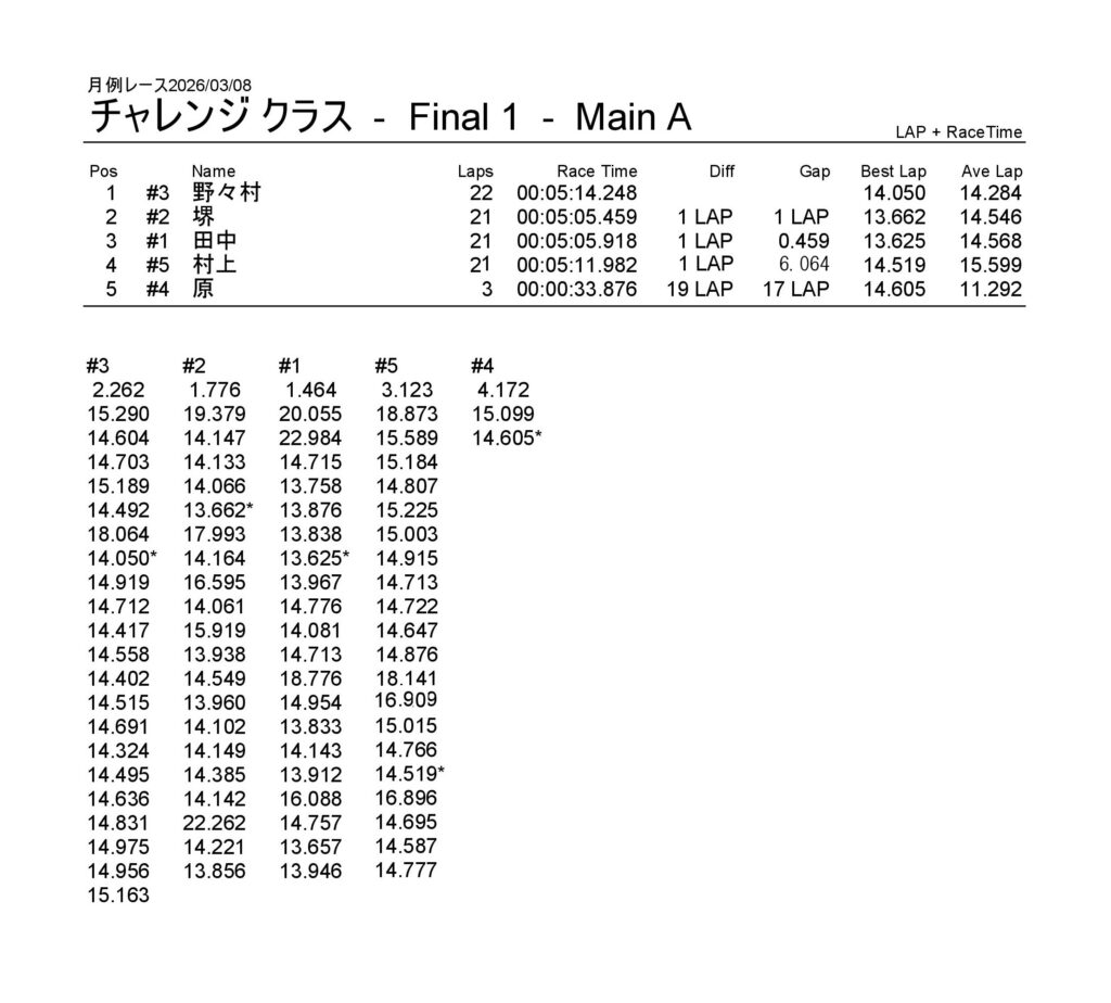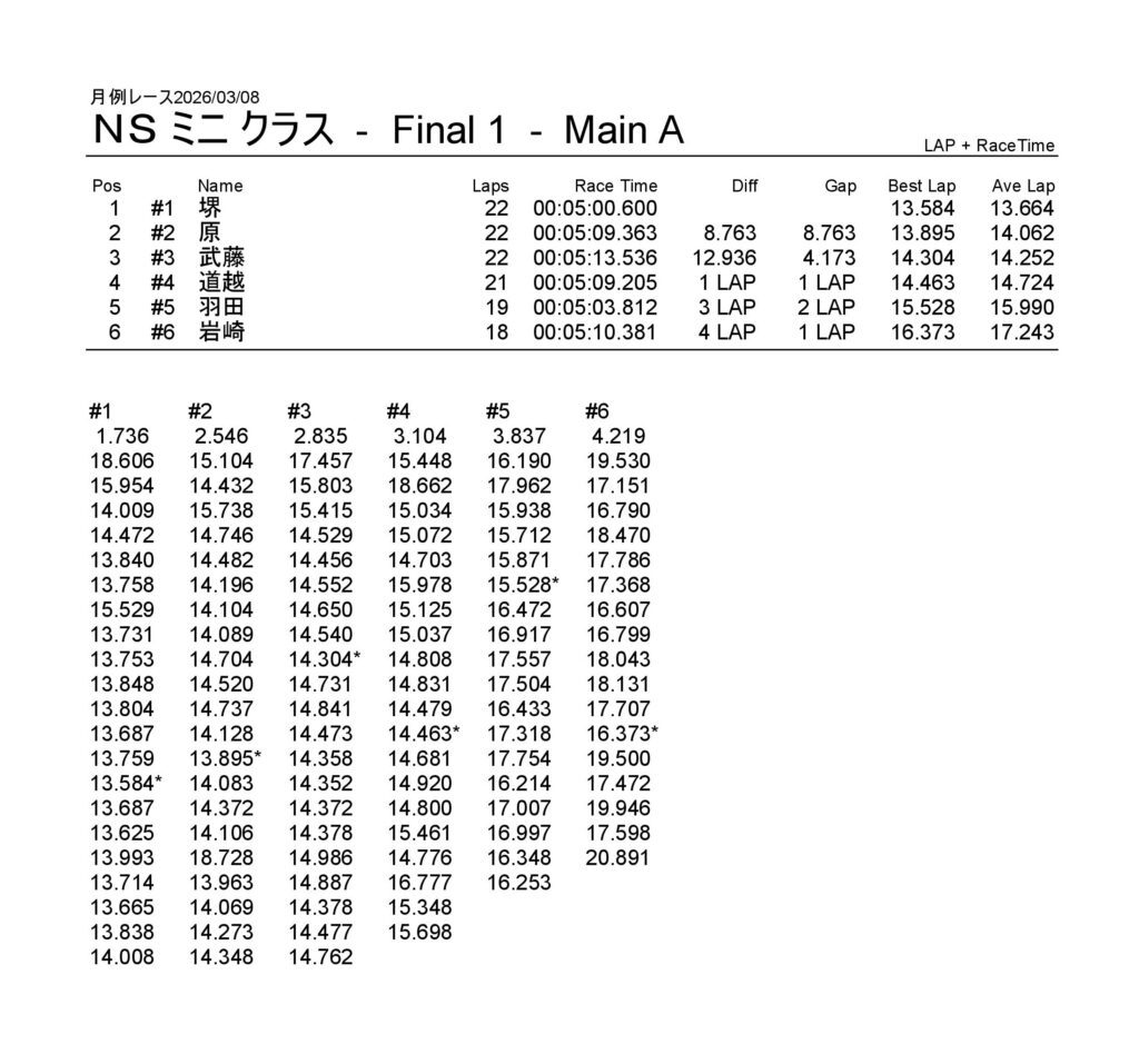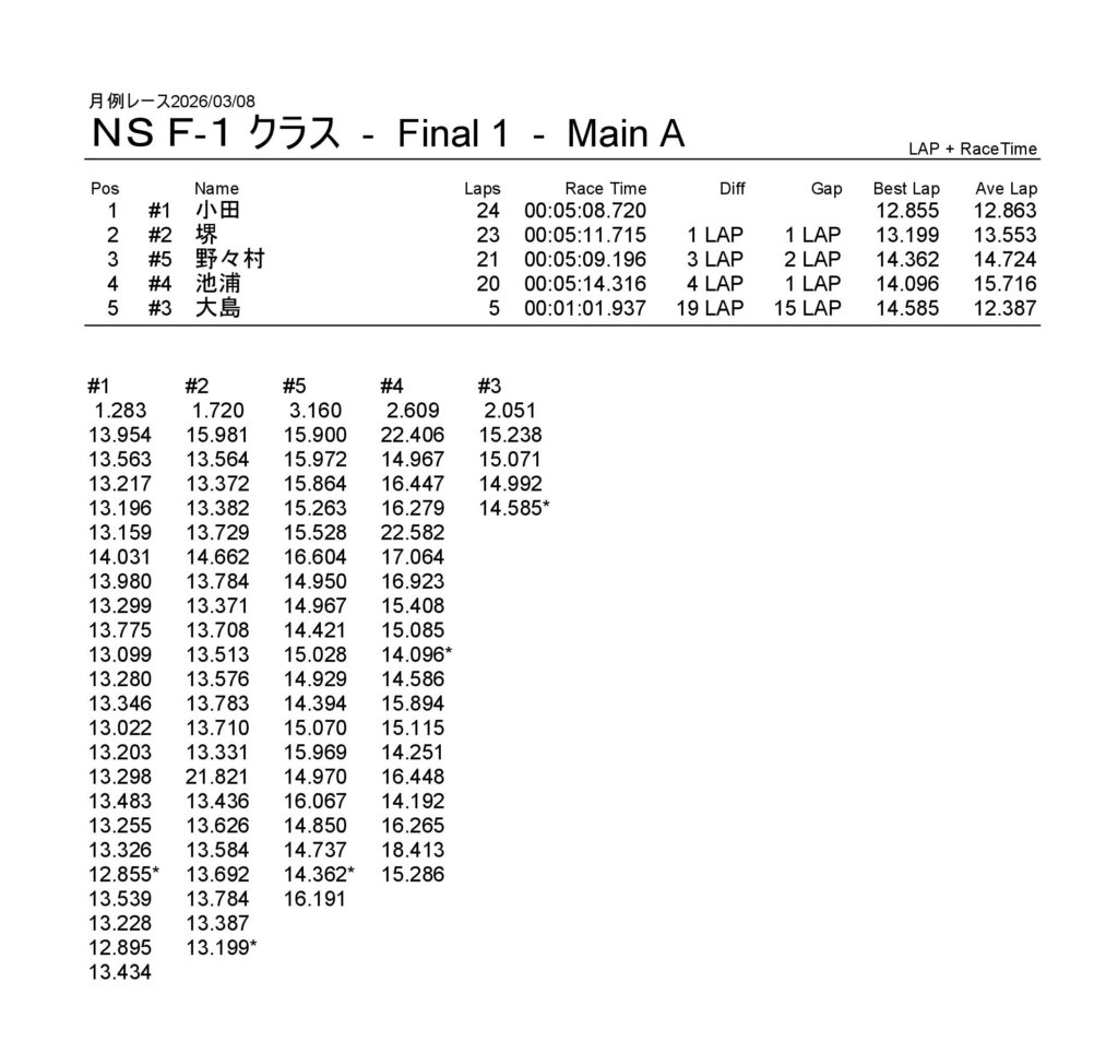 月例レース2026/03/08 公開日:2026年3月9日 レース結果 NSミニクラス NSミニクラスAメイン NSF-1クラス NSF-1クラスAメイン タミヤF1クラス タミヤF1クラスAメイン チャレンジクラス チャレンジクラスBメイン チャレンジクラスAメイン NSツーリングクラス NSツーリングクラスBメイン NSツーリングクラスAメイン タミヤGTクラス タミヤGTクラスAメイン 関連記事 6月の月例レース結果・動画 2020/6/7ラリークロスレース結果&動画-2023-7-23ラリークロスレース結果&動画-2023-10-222月・月例レース結果・動画ラリークロスレース結果&動画 2022/10/23月例レース結果・動画 2024/09/08 投稿ナビゲーション 月例レース2026/02/15