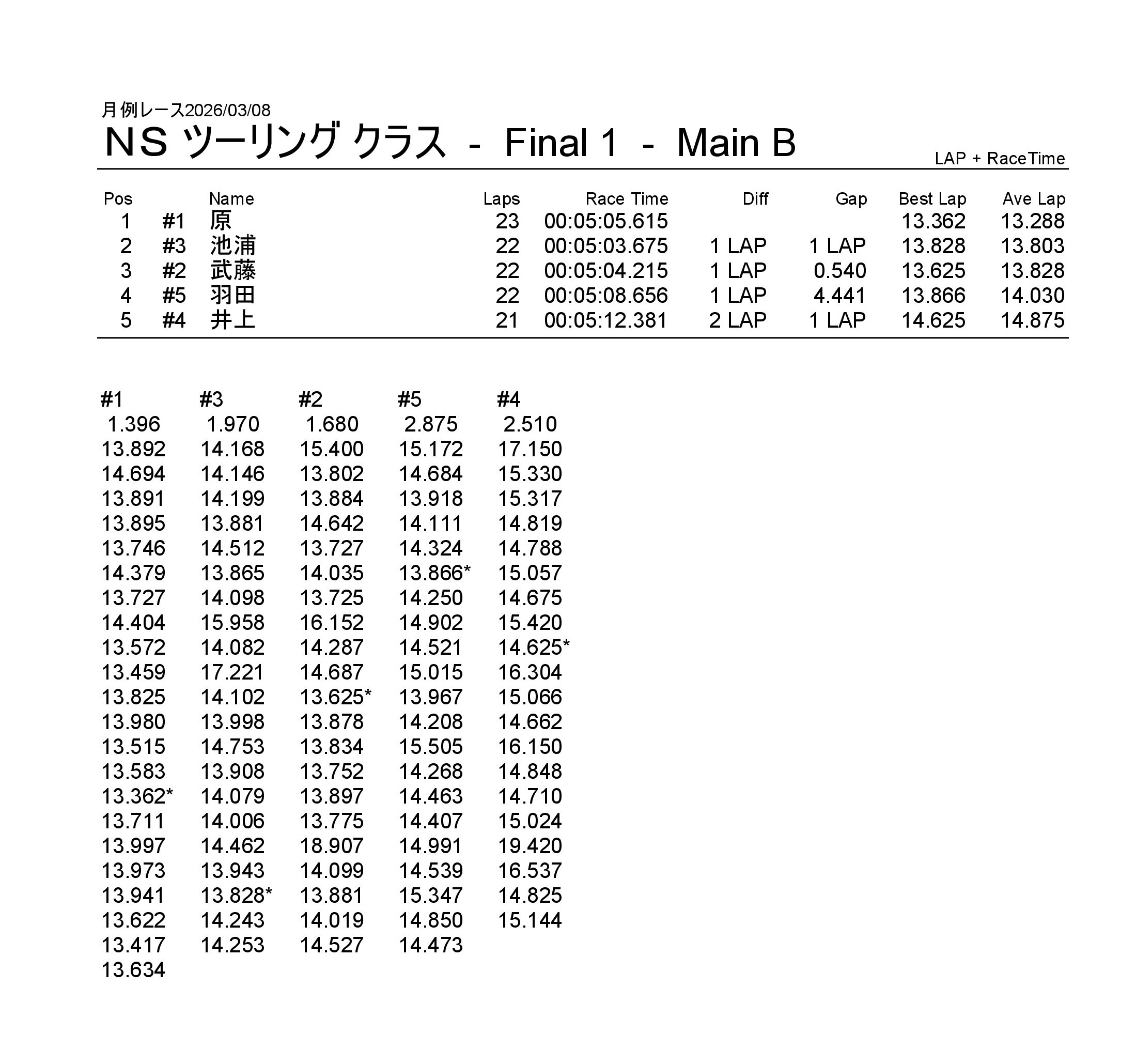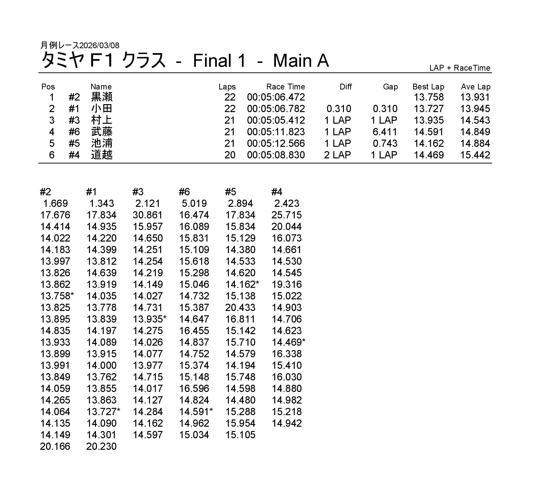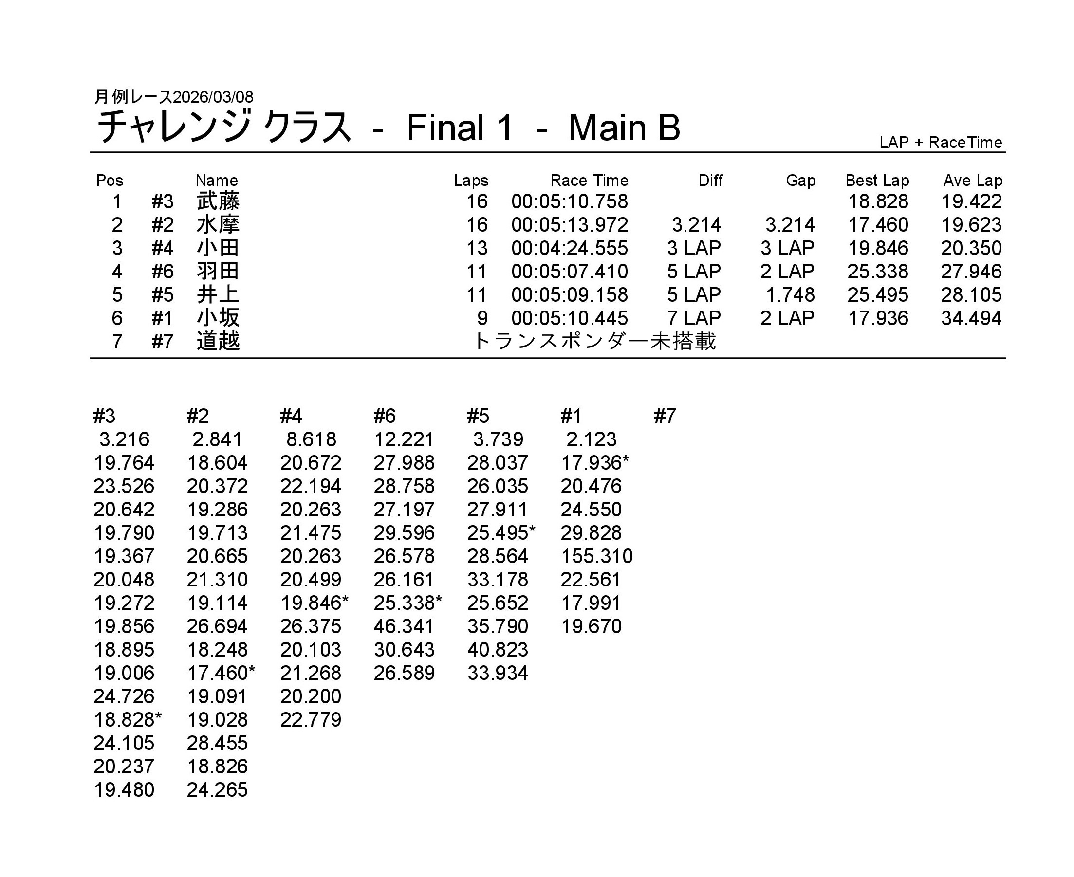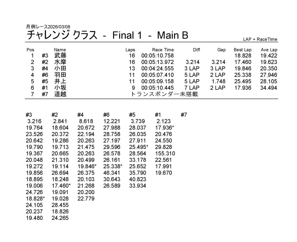 月例レース2026/03/08 公開日:2026年3月9日 レース結果 NSミニクラス NSミニクラスAメイン NSF-1クラス NSF-1クラスAメイン タミヤF1クラス タミヤF1クラスAメイン チャレンジクラス チャレンジクラスBメイン チャレンジクラスAメイン NSツーリングクラス NSツーリングクラスBメイン NSツーリングクラスAメイン タミヤGTクラス タミヤGTクラスAメイン 関連記事 6月の月例レース結果・動画 2020/6/7ラリークロスレース結果&動画-2023-7-23ラリークロスレース結果&動画-2023-10-222月・月例レース結果・動画ラリークロスレース結果&動画 2022/10/23月例レース結果・動画 2024/09/08 投稿ナビゲーション 月例レース2026/02/15