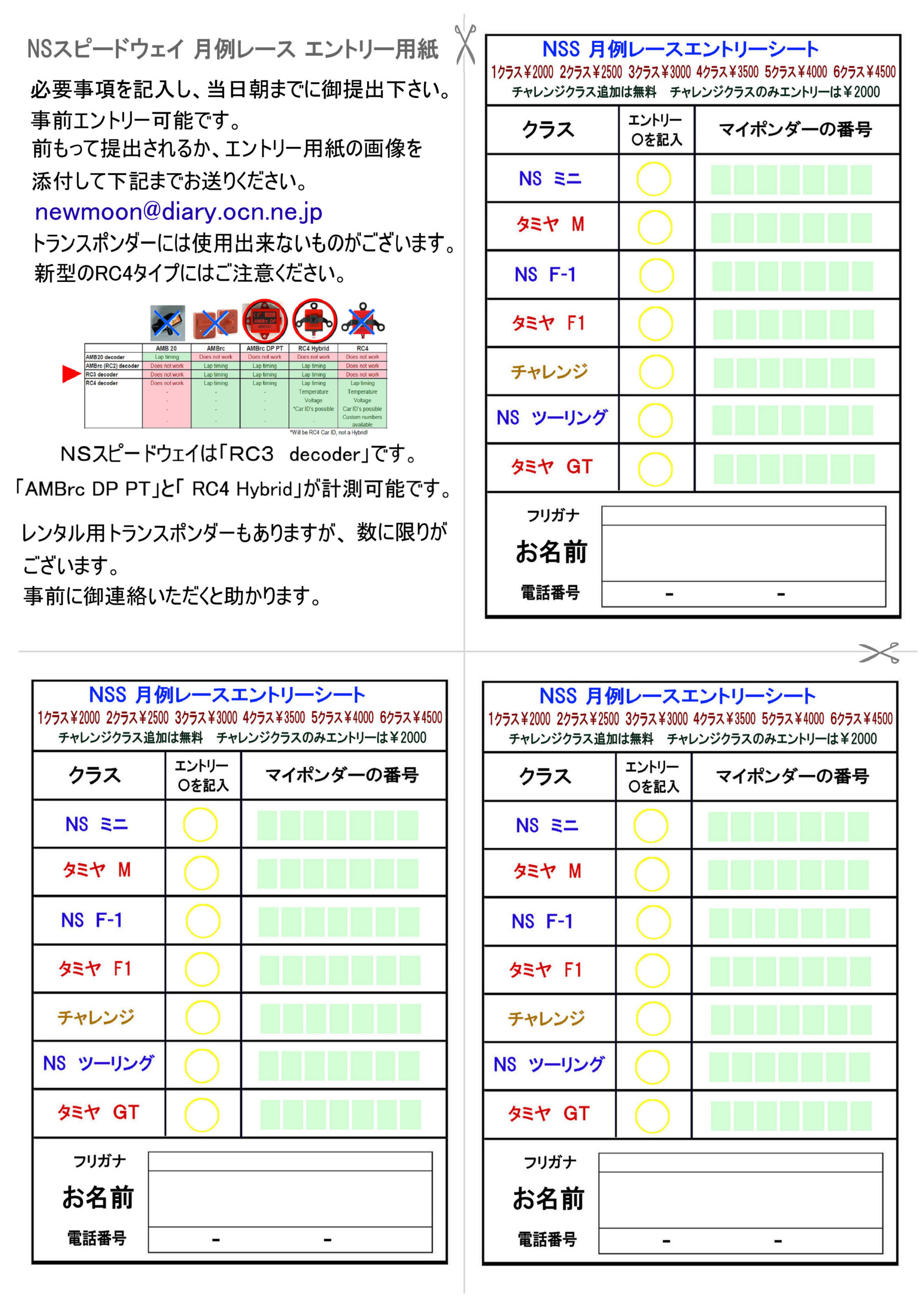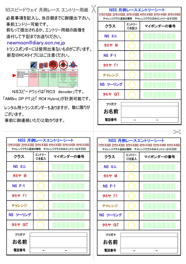 来年1月3日にNSスピードウェイ・オープニングレースを開催します。 サーキット改修後初めての月例レースとなり、レース内容も大きく変わります。 従来のNSスピードウェイ独自レギュレーションのレースとは別に、 タミヤチャレンジカップレギュレーションのレースを行います。 NSスピードウェイはショップではないので、チャレンジカップを開催することは出来ません。 ですので他のサーキット等で行われるチャレンジカップの練習レースとして、同等のレギュレーションでレースを行います。 レギュレーション違いで3クラス2種に加え、なんでもありのお遊びレース「チャレンジクラス」の計7クラスとなります。 (フォーミュラEクラスは無くなります) 【NS ミニ】従来のNSレギュレーションのまま 【タミヤ M】タミヤチャレンジカップレギュレーションと同等。 【NS F-1】従来のNSレギュレーションのまま。 【タミヤ F1】タミヤチャレンジカップレギュレーションと同等。 【NS ツーリング】従来のNSレギュレーションのまま。 【タミヤ GT】タミヤチャレンジカップレギュレーションと同等。 【チャレンジ】レギュレーション無し、なんでもありのお遊びレース。 予選3分 ツーリング・F-1・ミニ・チャレンジはフリースタート、べストラップ方式。 GT・F1・Mの3クラスはスタッガースタート、GT・Mは周回方式、F1はべストラップ方式。 決勝は5分。 エントリフィーは1クラス¥2000、1クラス増えるごとに¥500加算。 チャレンジクラスは基本無料でエントリー可能ですが、チャレンジクラスのみエントリーの場合は1クラス分¥2000をご負担いただきます。 返信